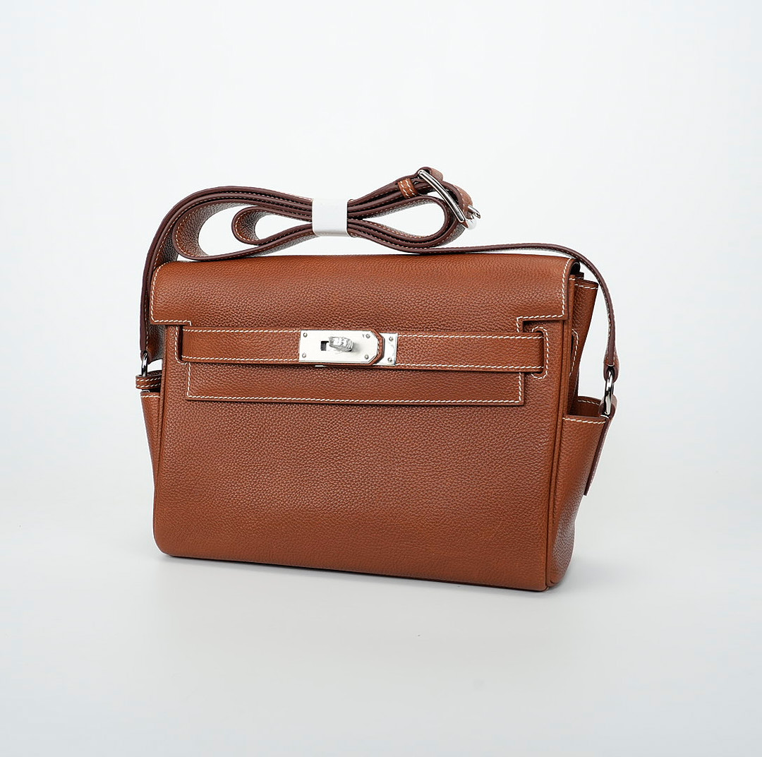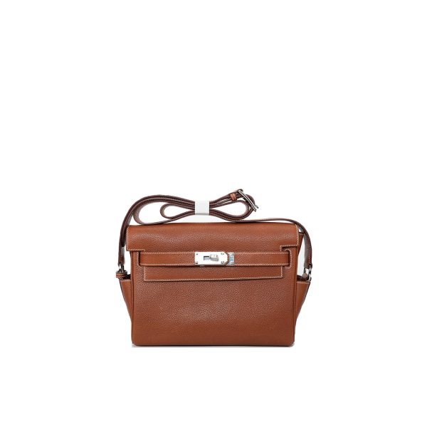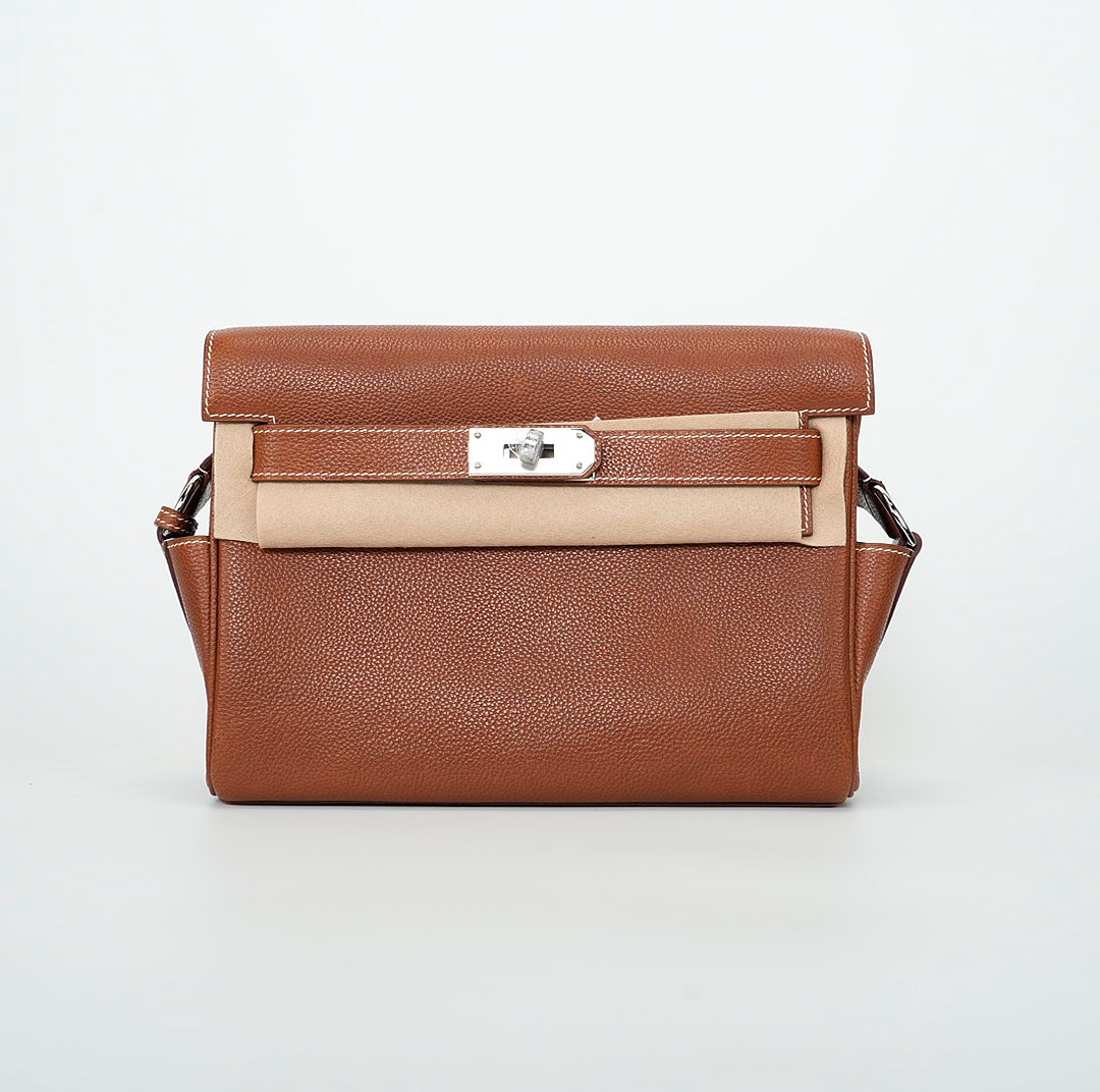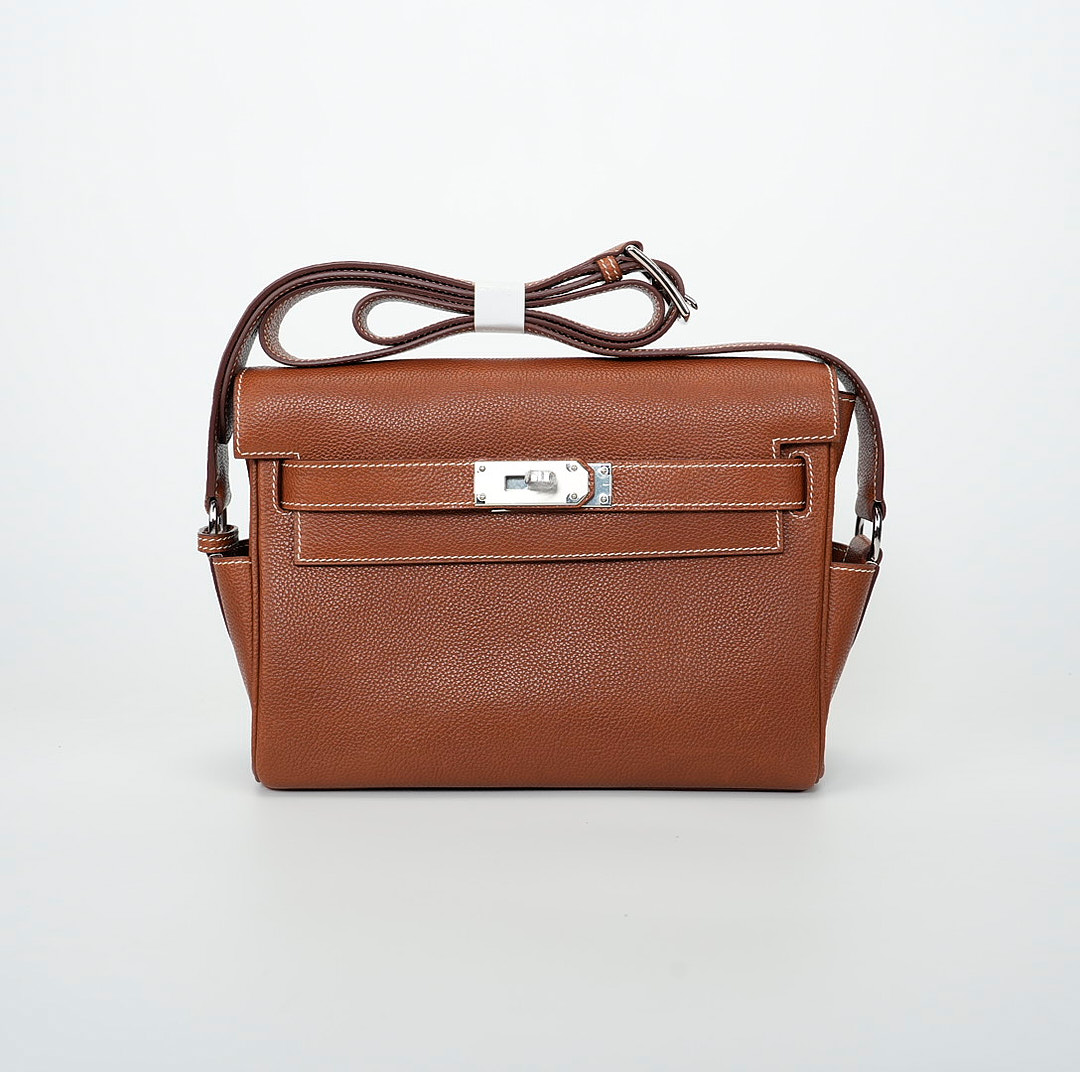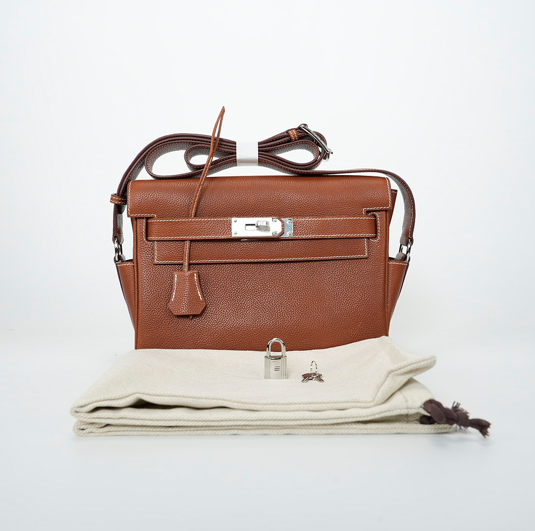 This is a Barenia Faubourg Kelly Messenger PM in Fauve. This stylish messenger bag is crafted of natural Barenia calfskin leather in brown. It features a crossbody strap with palladium hardware and a broad front flap that closes with a matching turn lock. The flap opens to a leather interior with zipper and patch pockets.