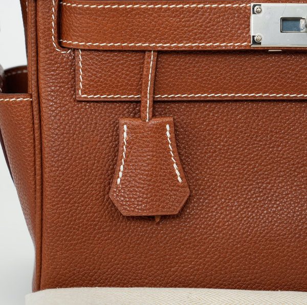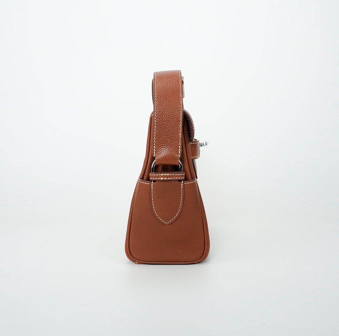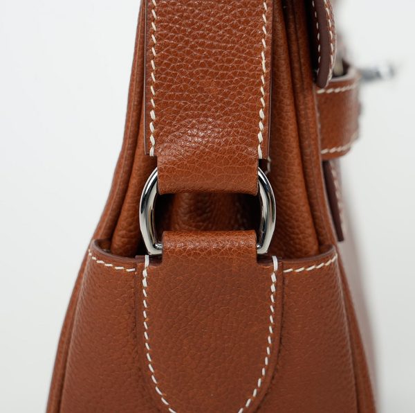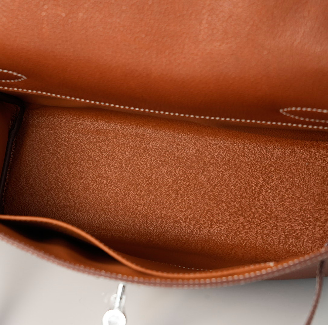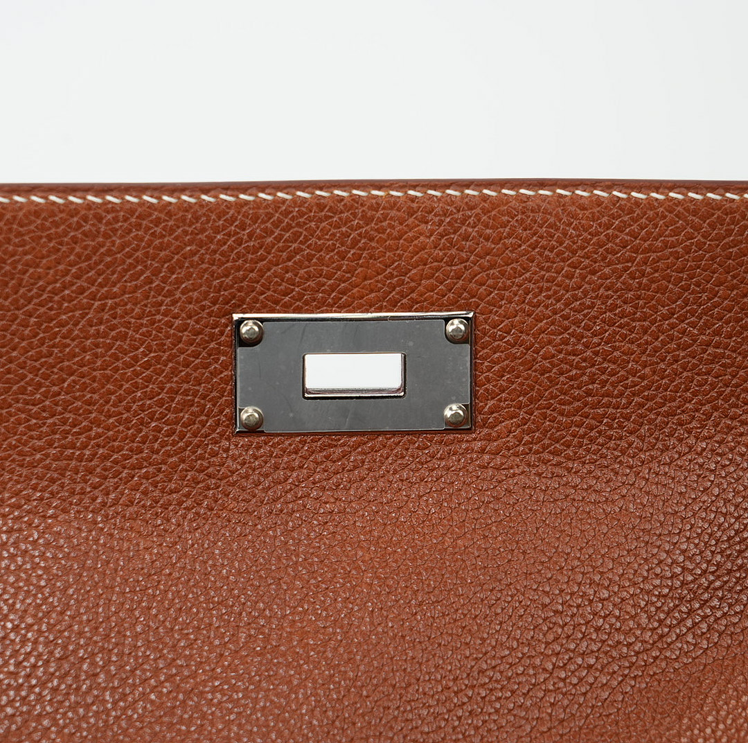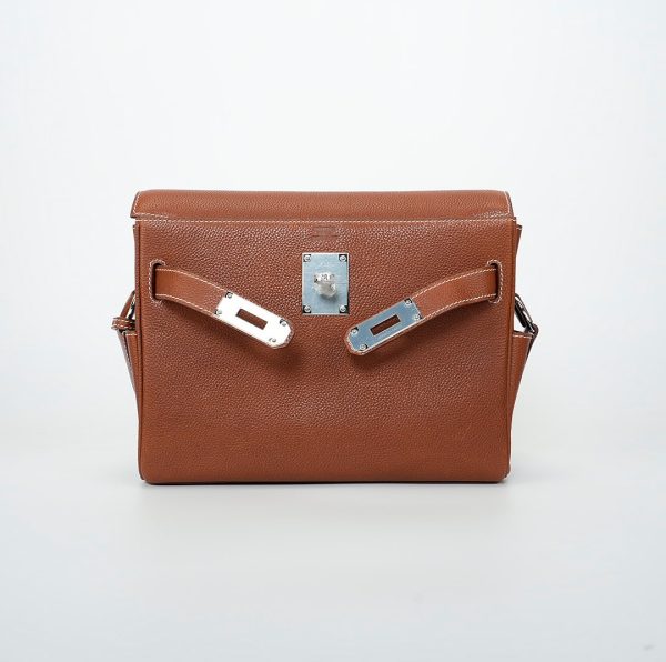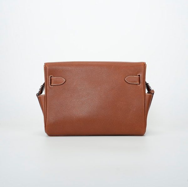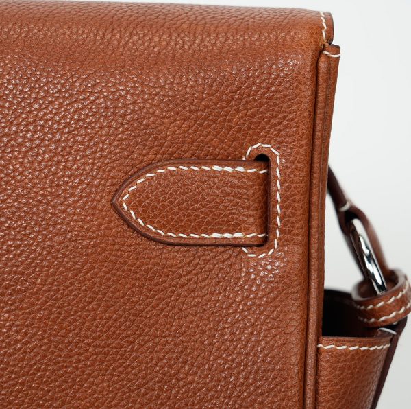 This is a Barenia Faubourg Kelly Messenger PM in Fauve. This stylish messenger bag is crafted of natural Barenia calfskin leather in brown. It features a crossbody strap with palladium hardware and a broad front flap that closes with a matching turn lock. The flap opens to a leather interior with zipper and patch pockets.