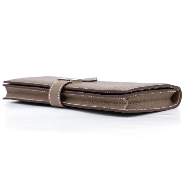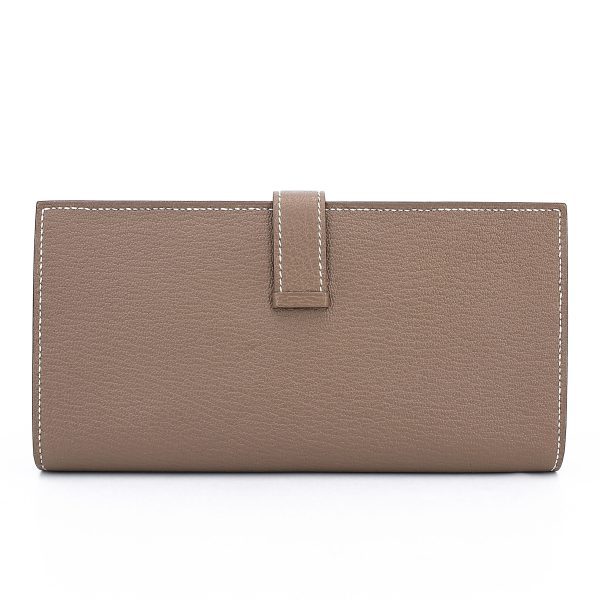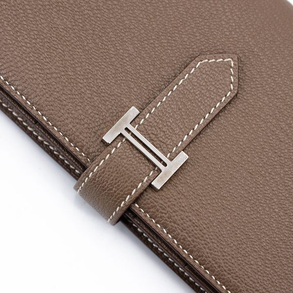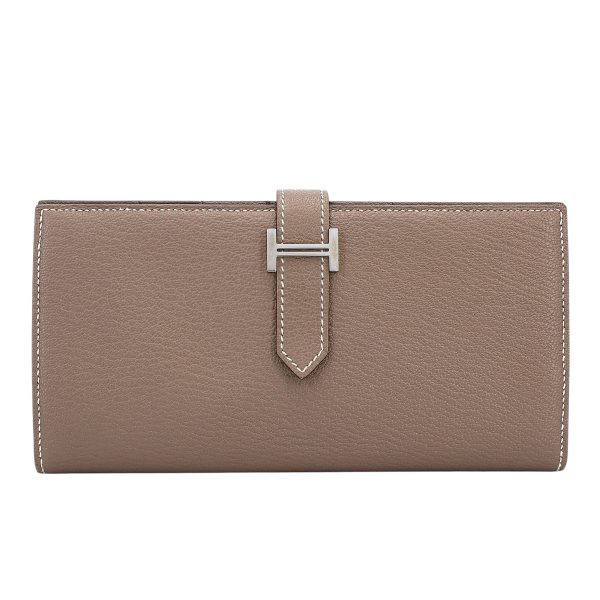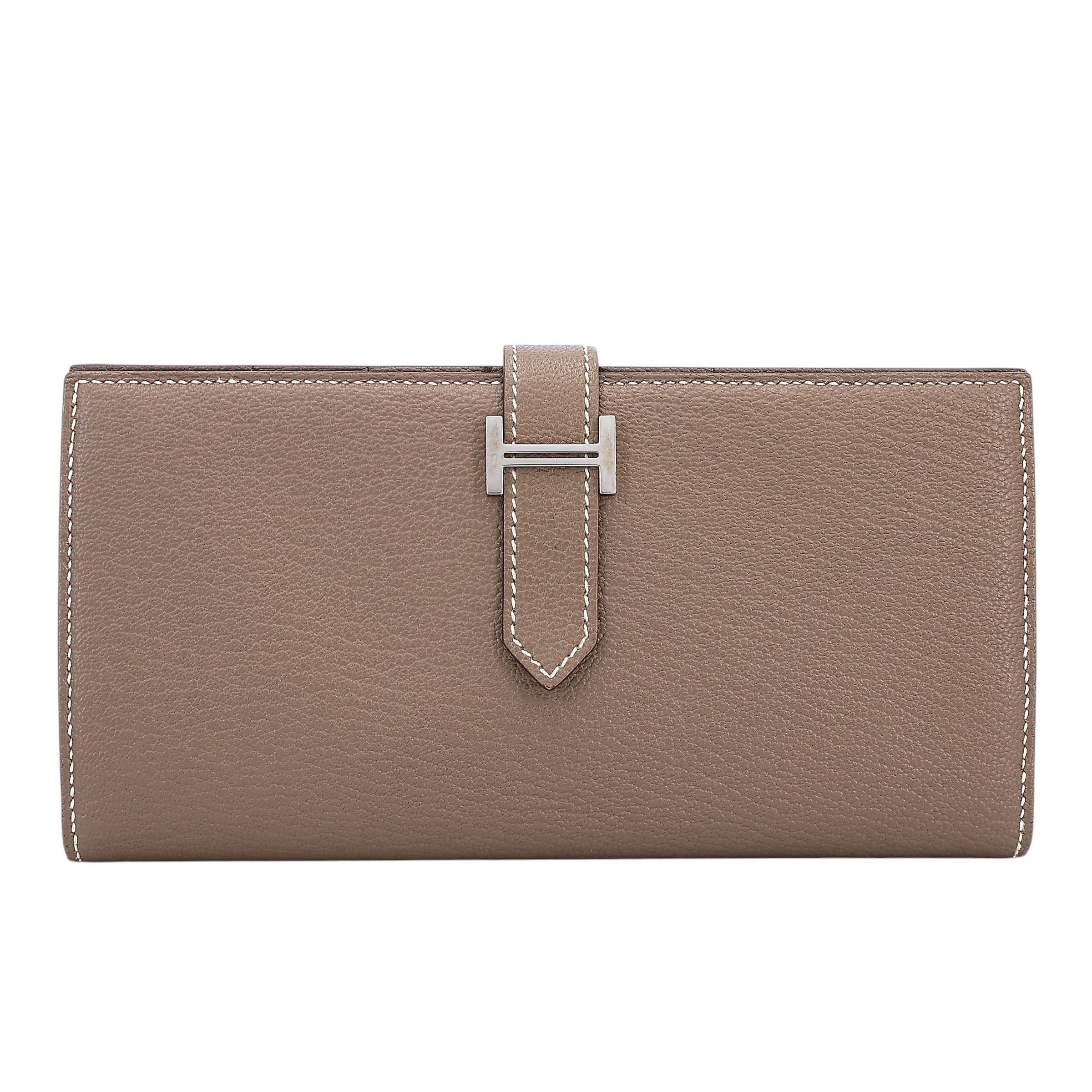 This is a Long Bearn Souffle Wallet. This chic wallet is crafted of soft textured Chevre leather with a cross-strap and a palladium silver H clasp. The wallet opens to a matching leather interior with a card slot panel, patch pockets, and a zipper compartment.