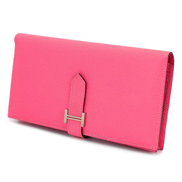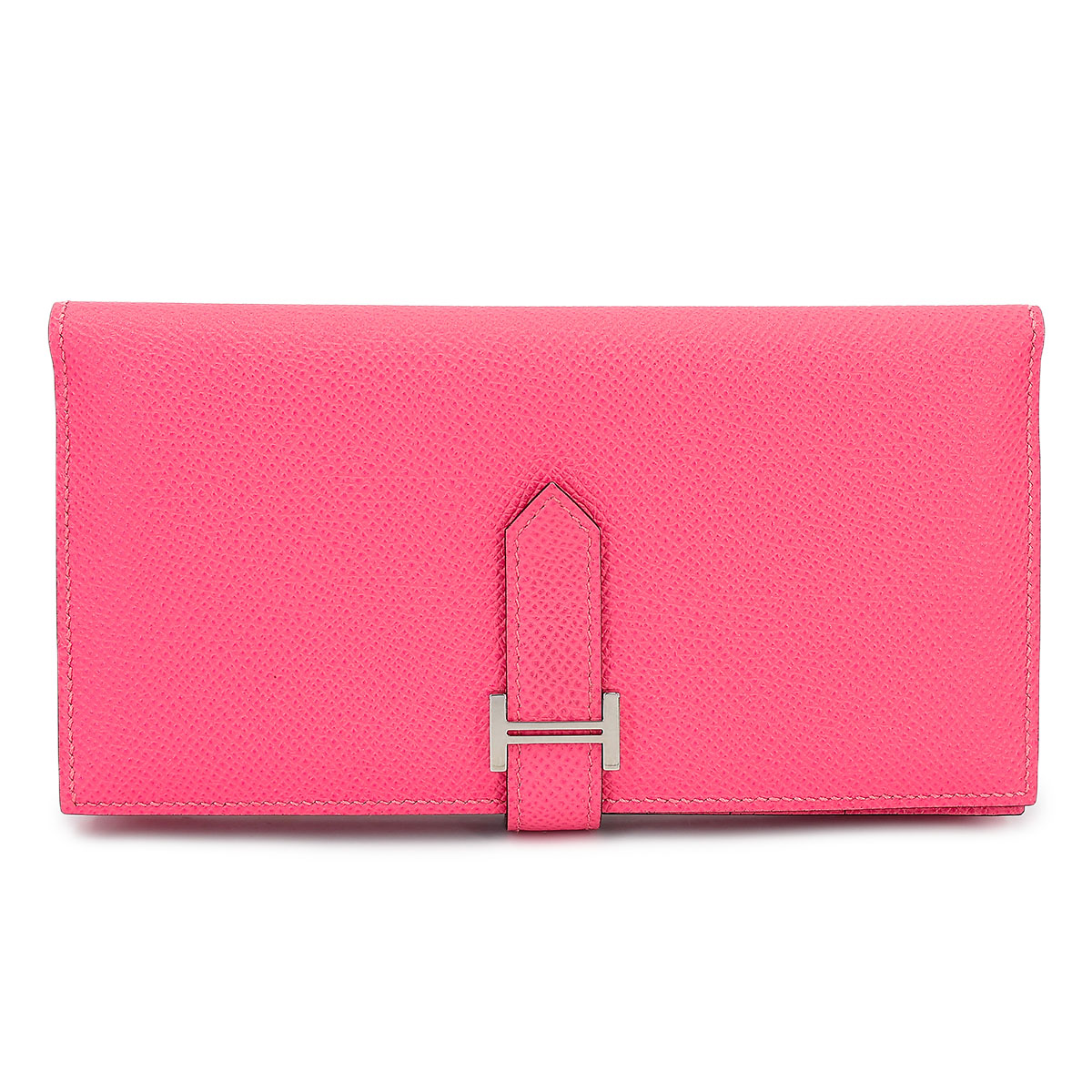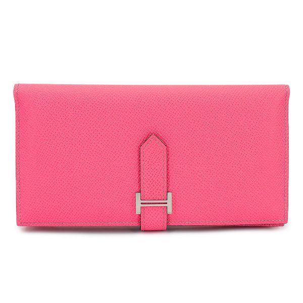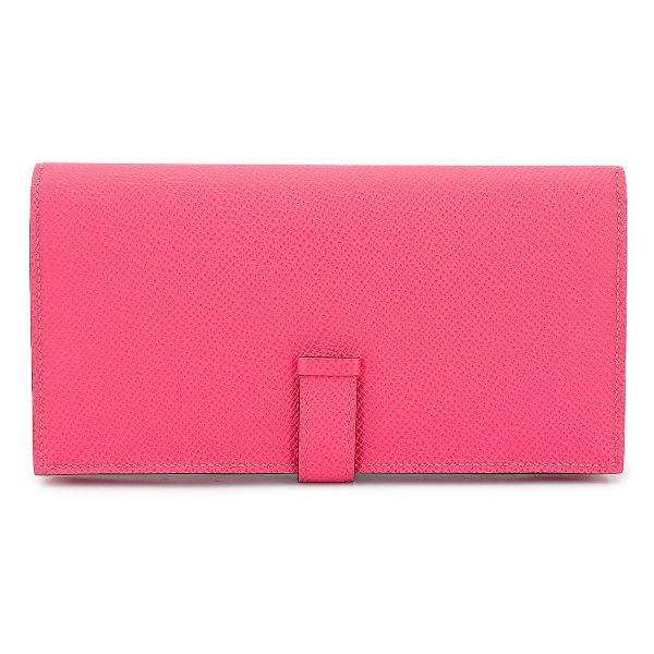 This is a Long Bearn Souffle Wallet. This chic wallet is crafted of richly textured Epsom leather with a cross-strap and a palladium silver H clasp. The wallet opens to a matching leather interior with a card slot panel, patch pockets, and a zipper compartment.
