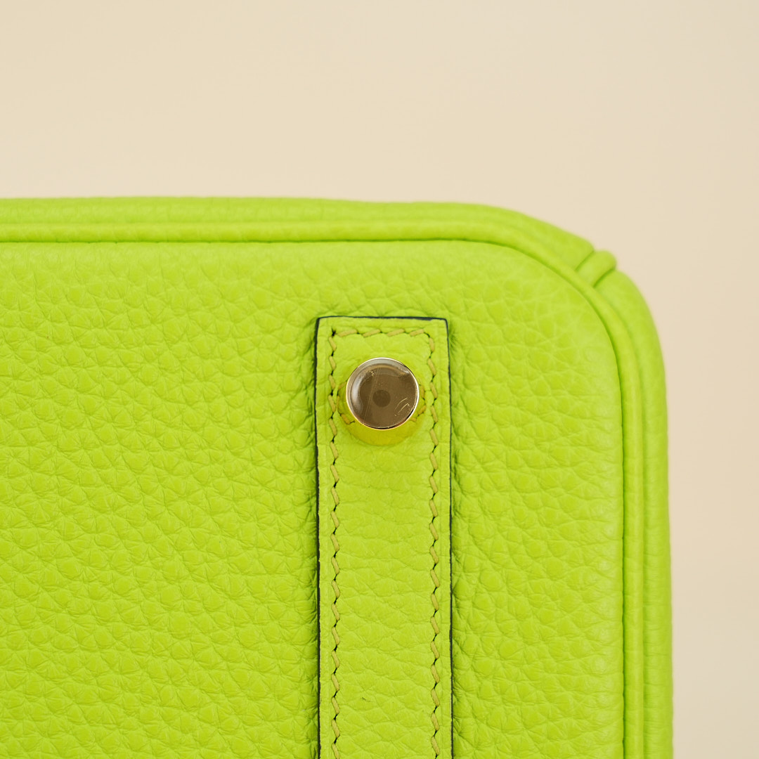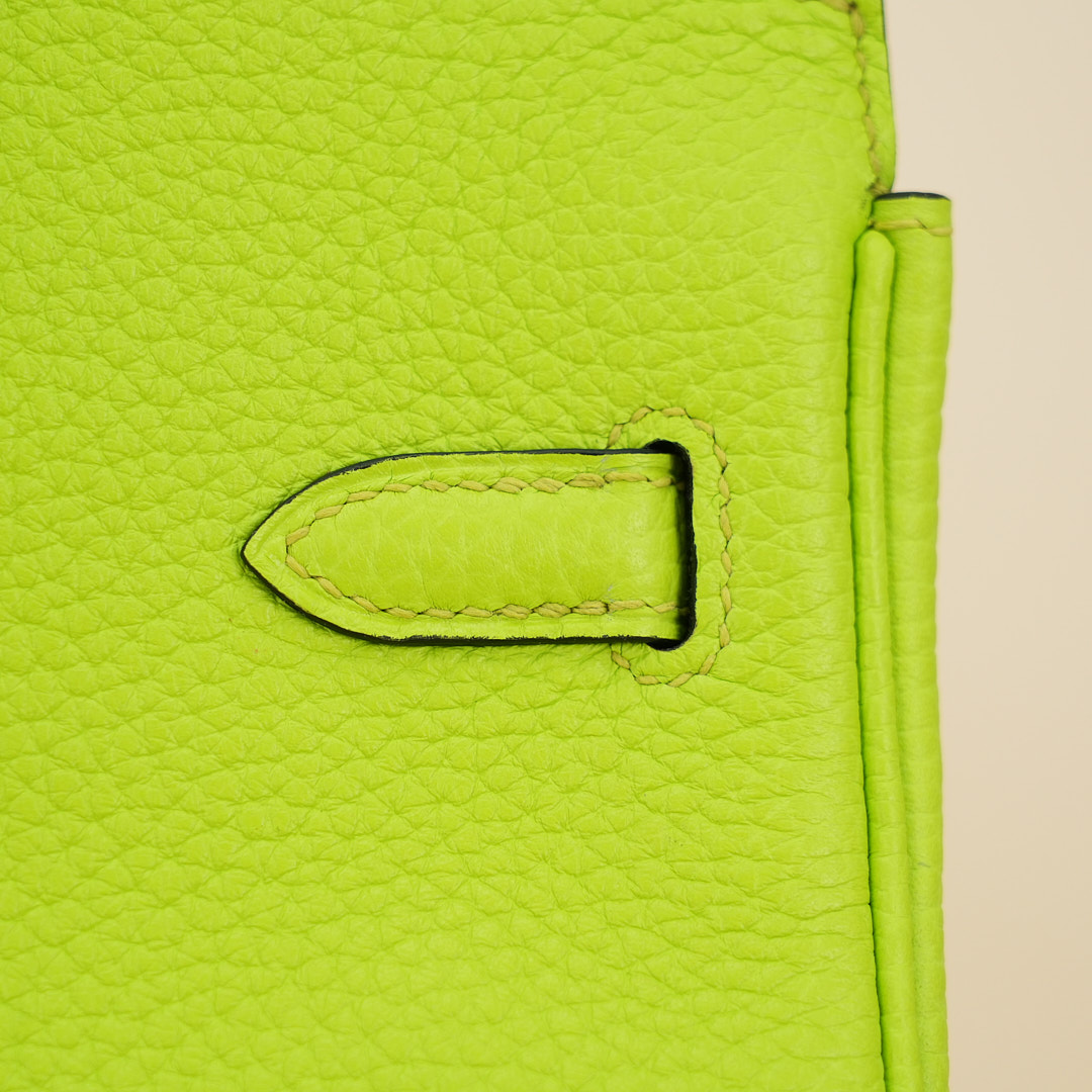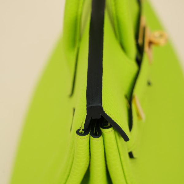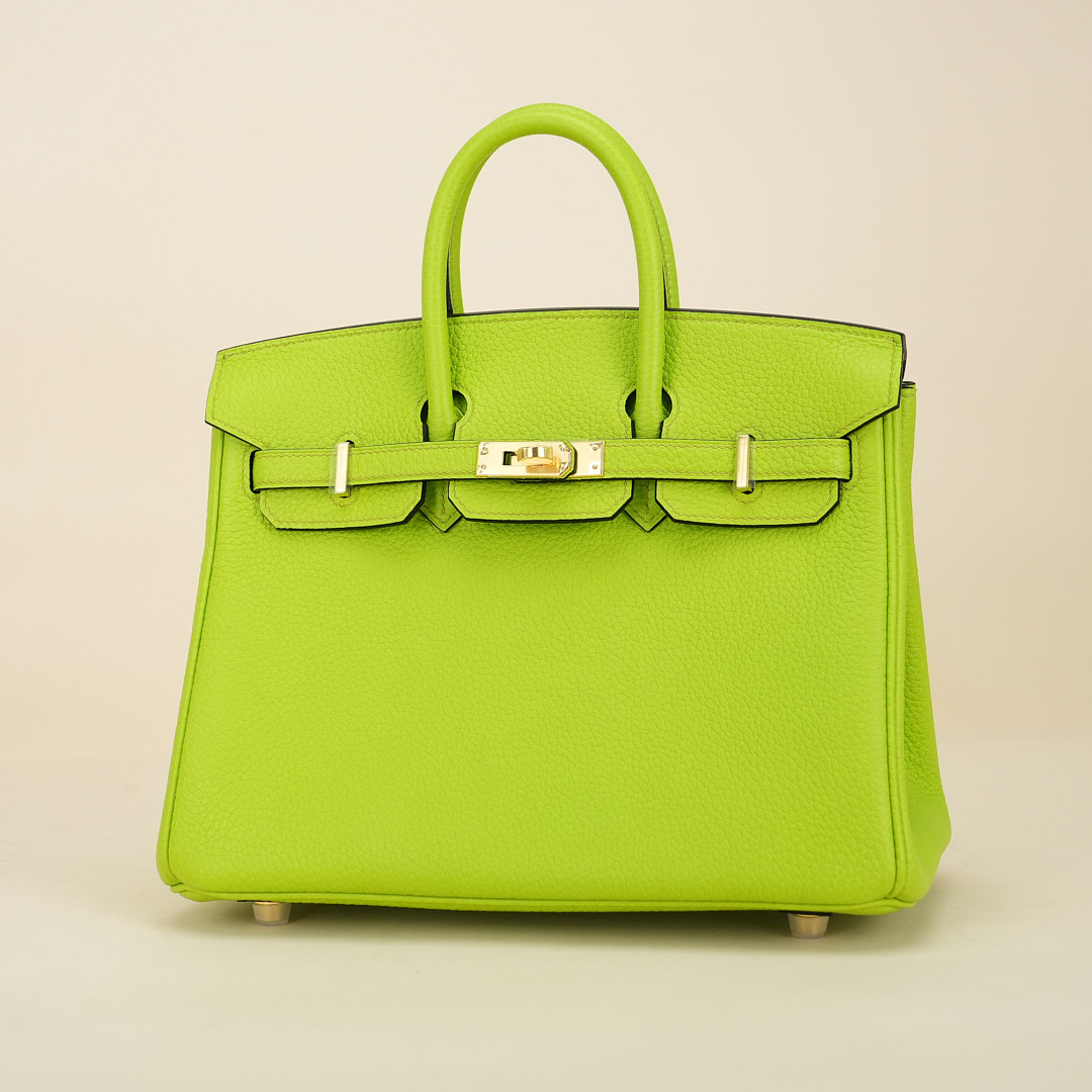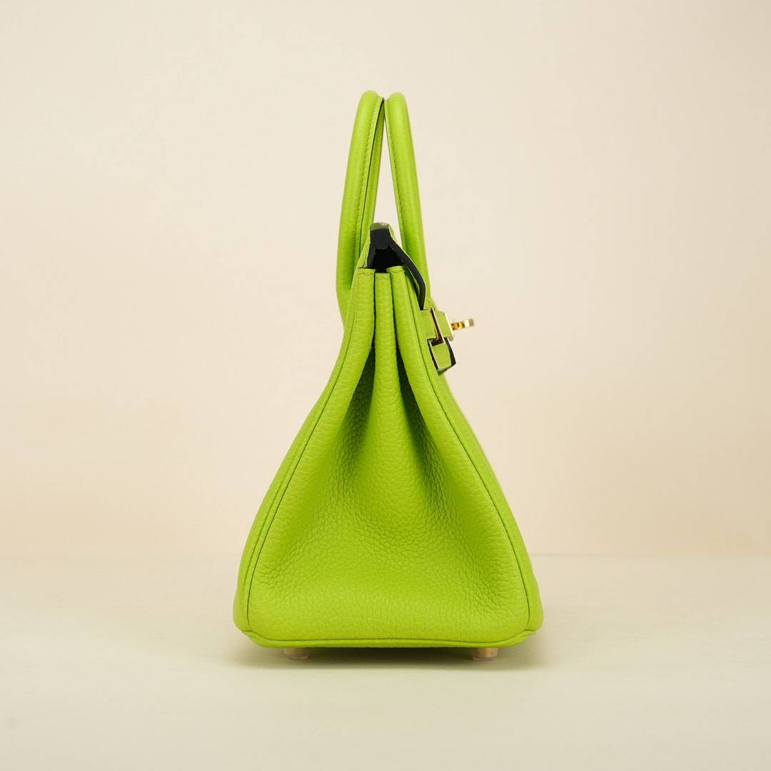 This BK is in Apple Green togo leather with Gold hardware, has tonal stitching, front flap, two straps with center toggle closure, clochette with lock and two keys, and double rolled handles.