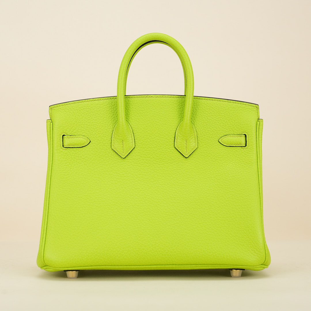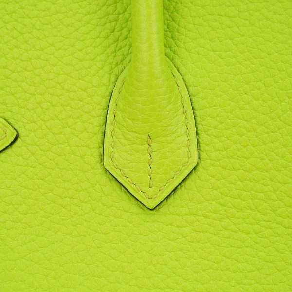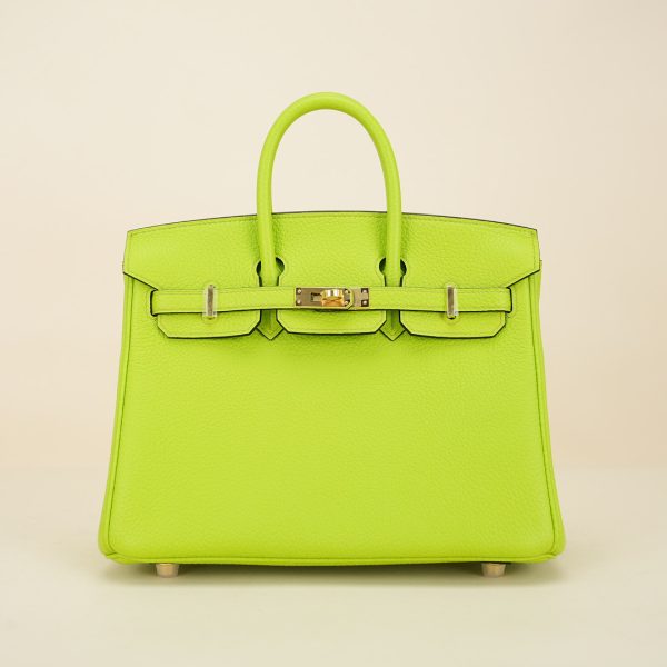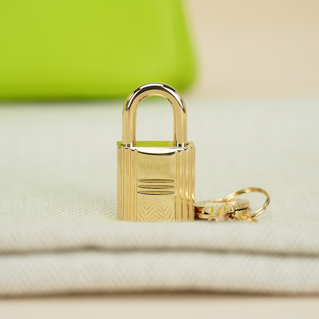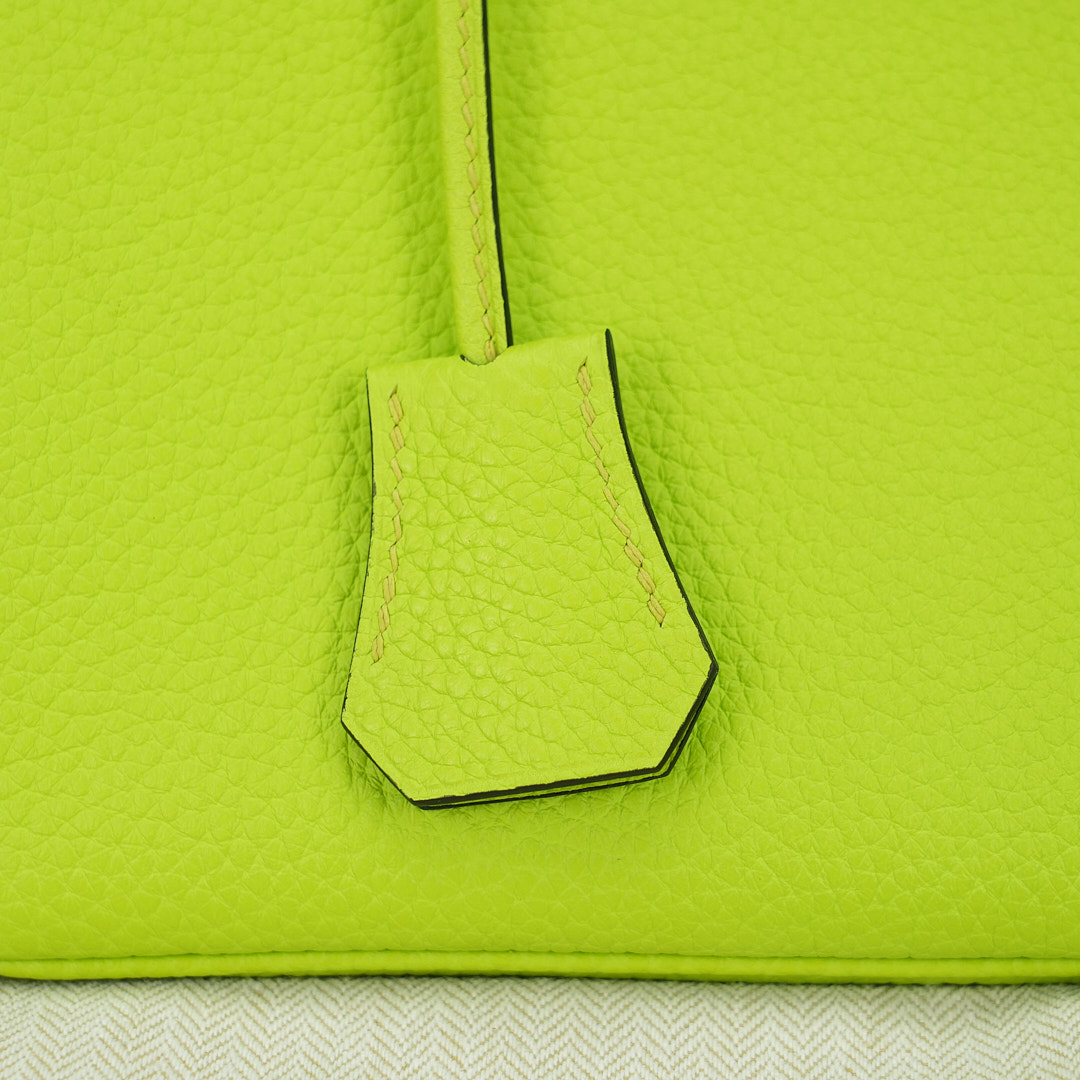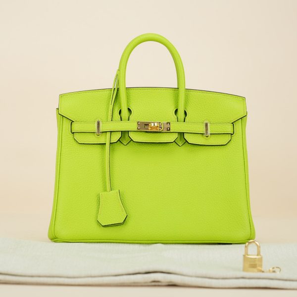 This BK is in Apple Green togo leather with Gold hardware, has tonal stitching, front flap, two straps with center toggle closure, clochette with lock and two keys, and double rolled handles.