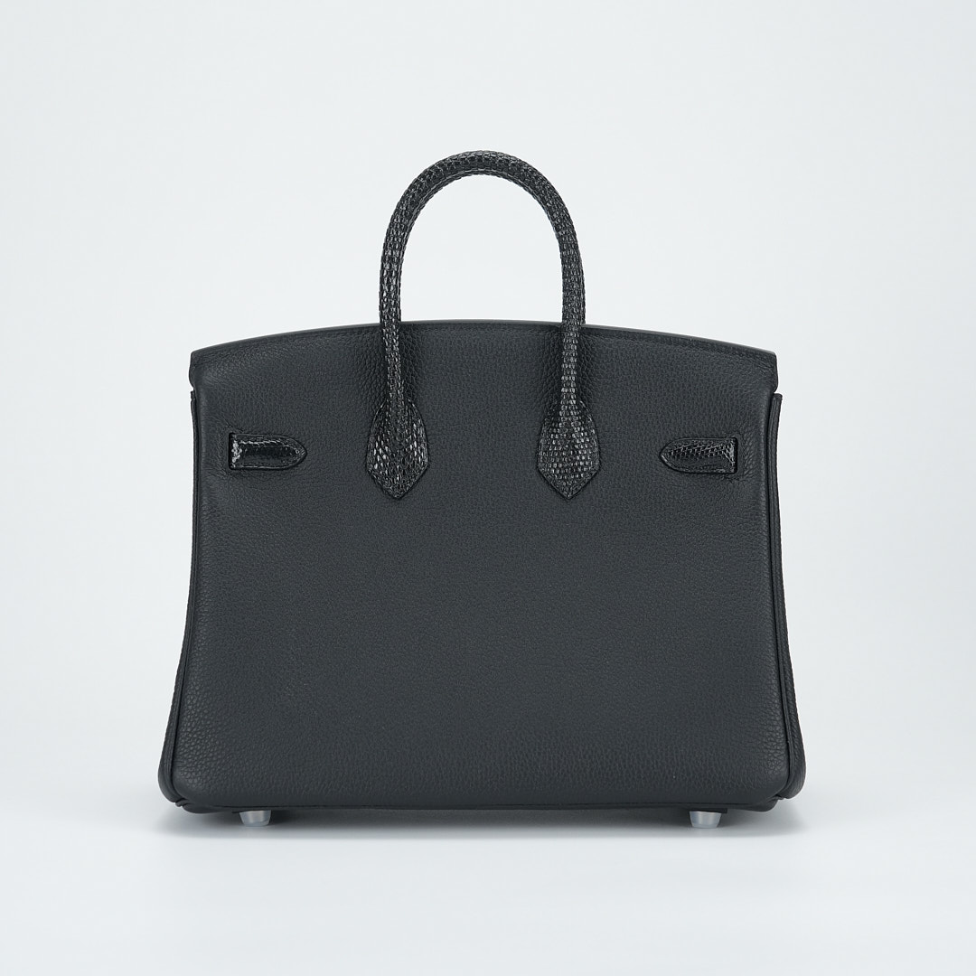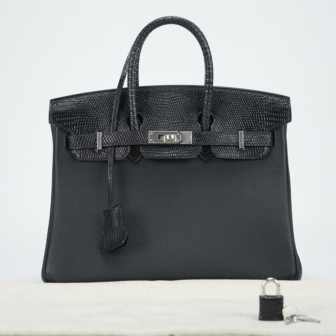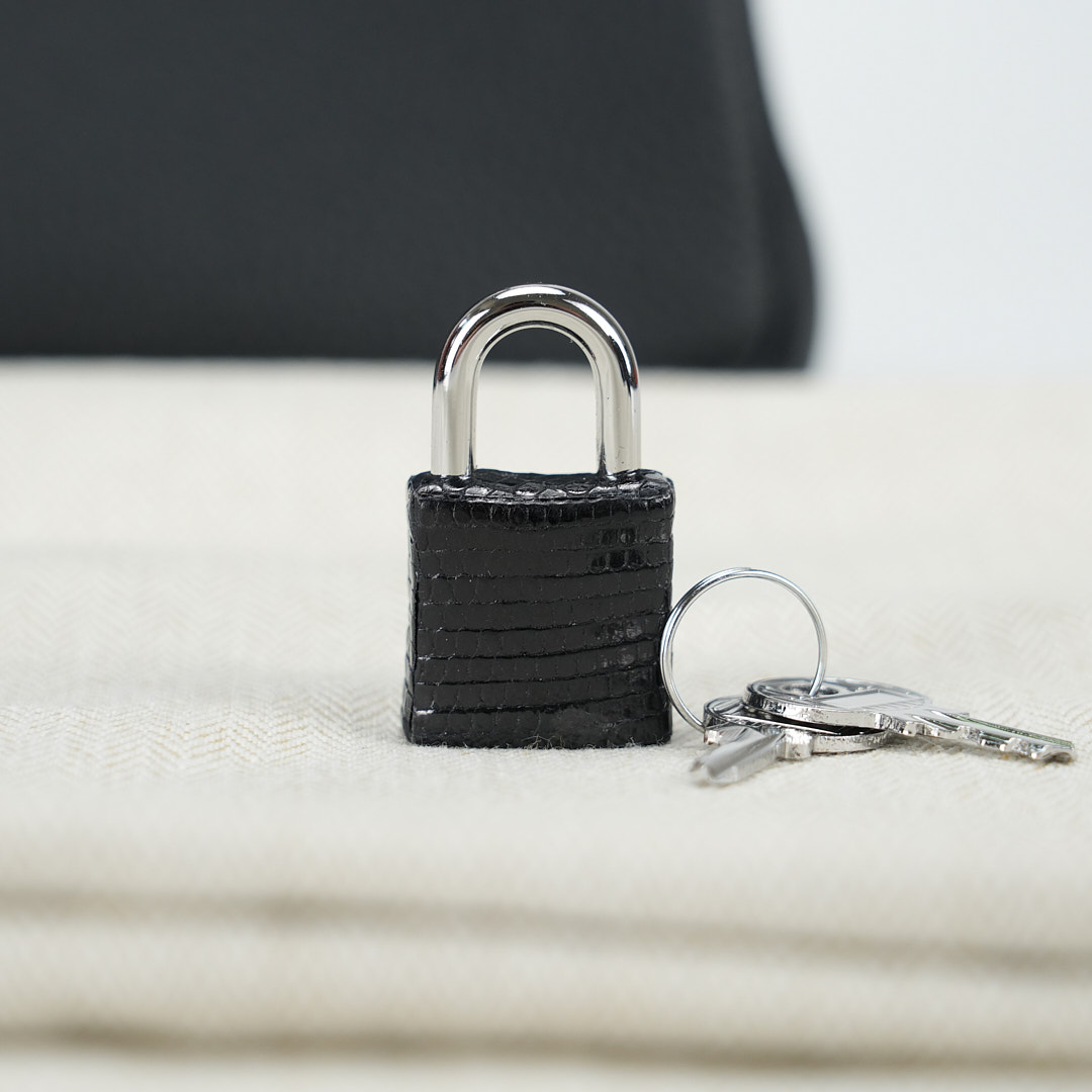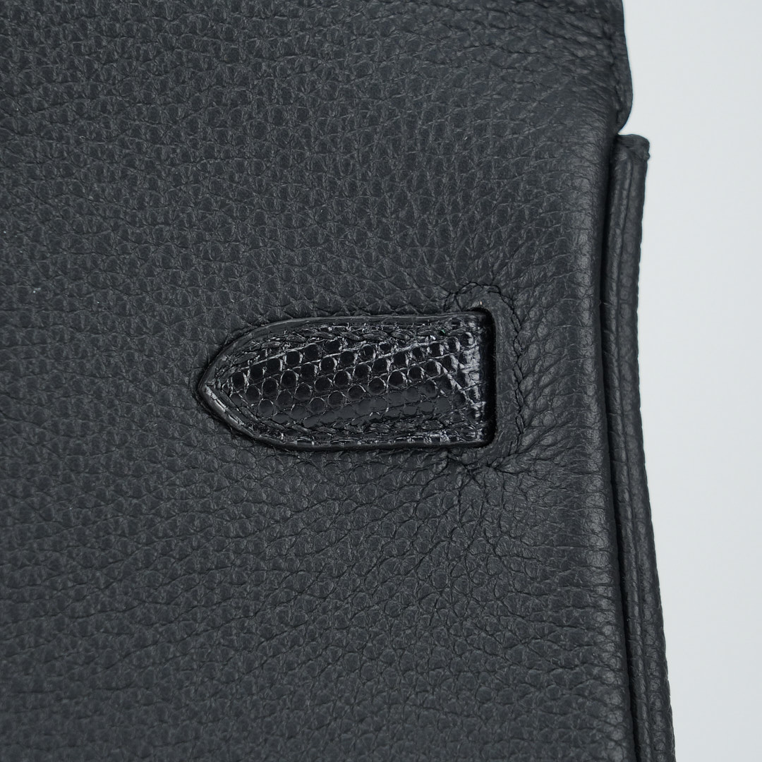 This BK is in Black Lizard and Togo leather with Palladium hardware and has tonal stitching, front strap, two straps with center toggle closure, clochette with lock and two keys and double rolled handles.