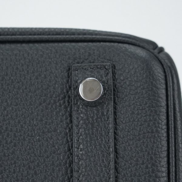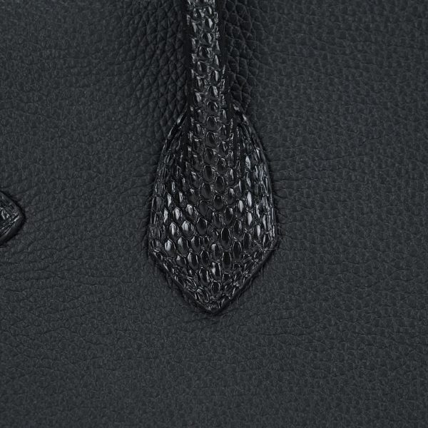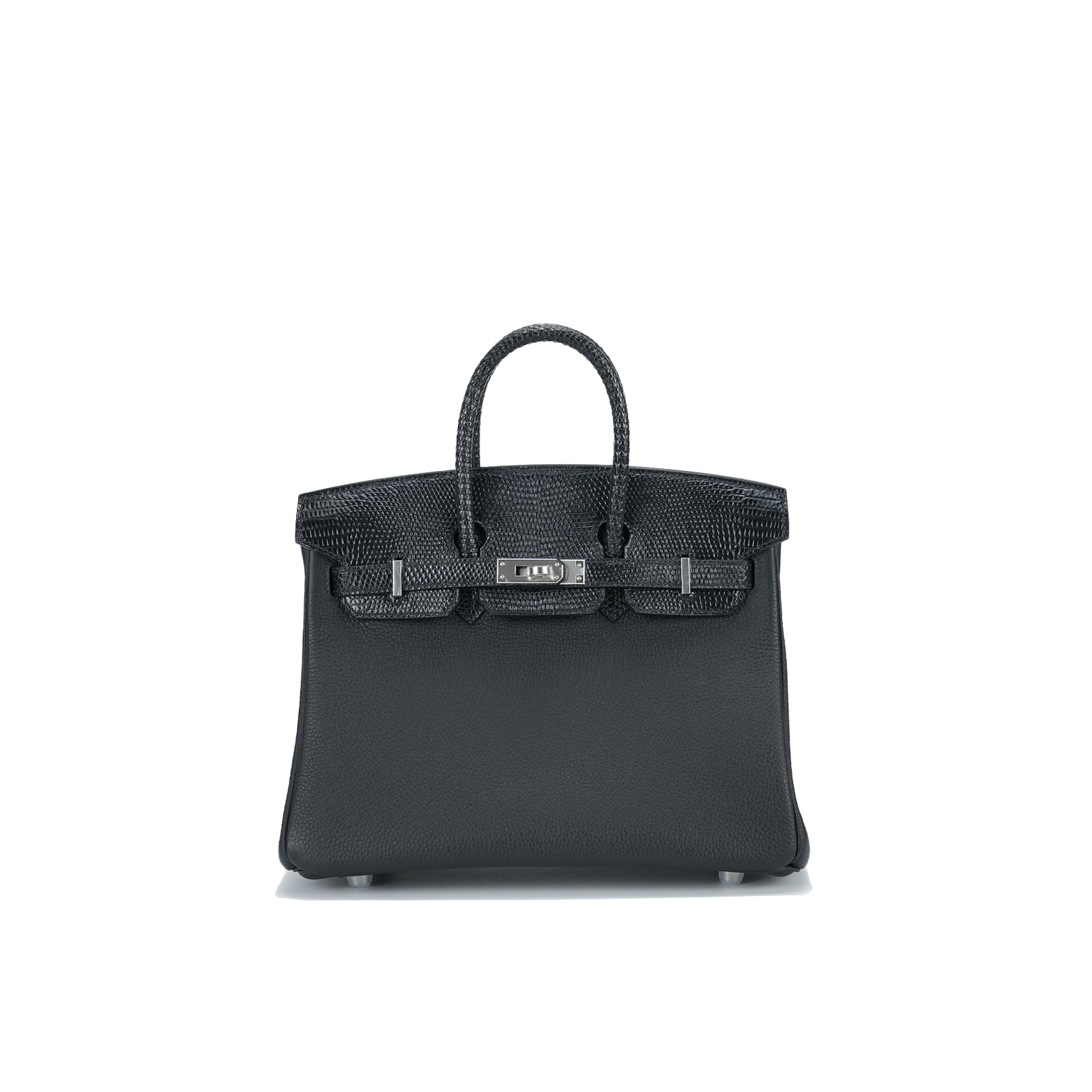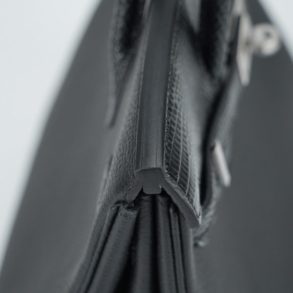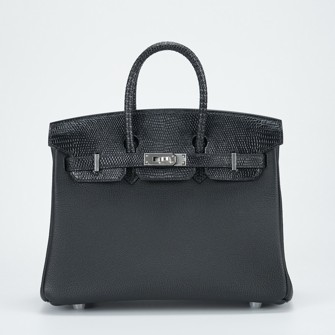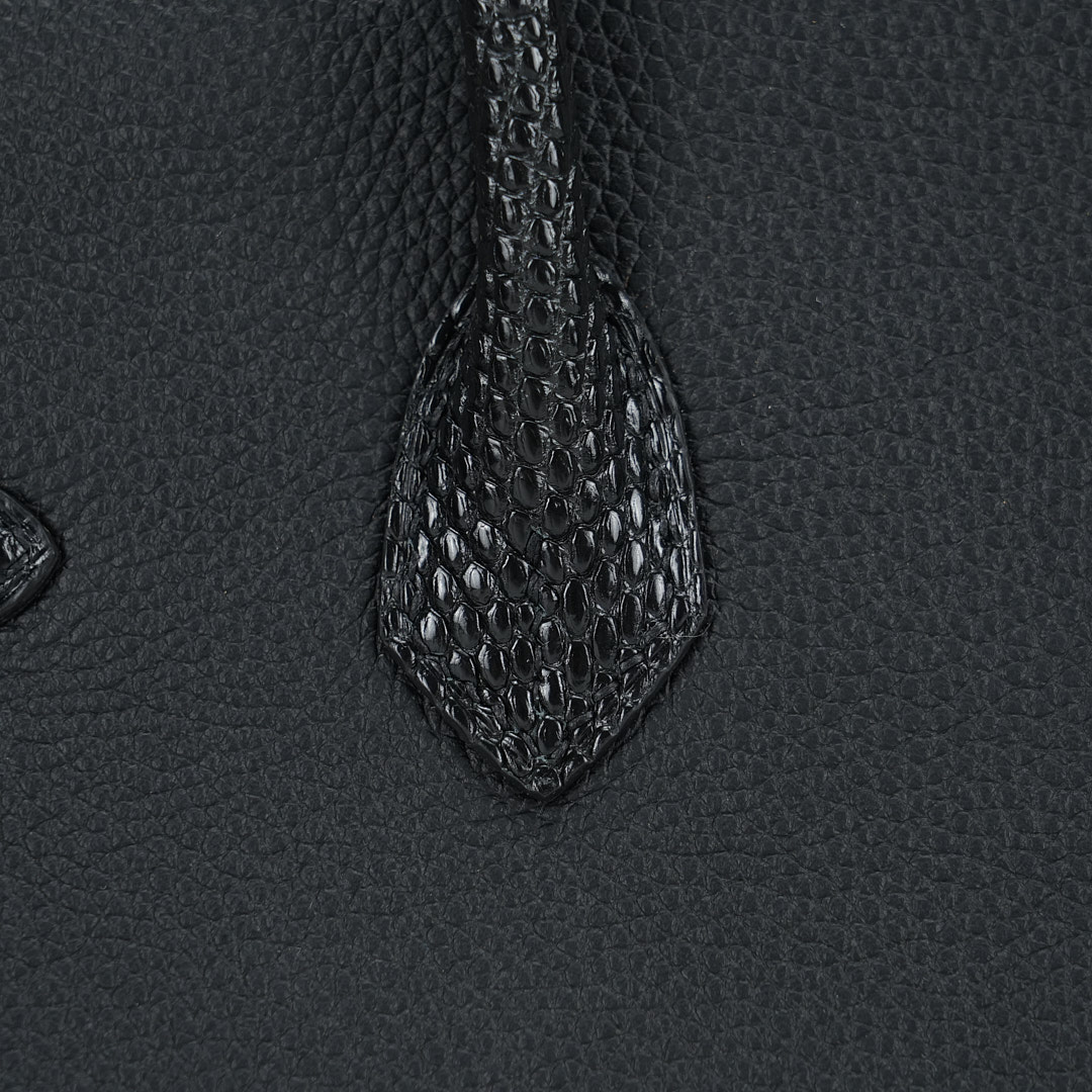 This BK is in Black Lizard and Togo leather with Palladium hardware and has tonal stitching, front strap, two straps with center toggle closure, clochette with lock and two keys and double rolled handles.