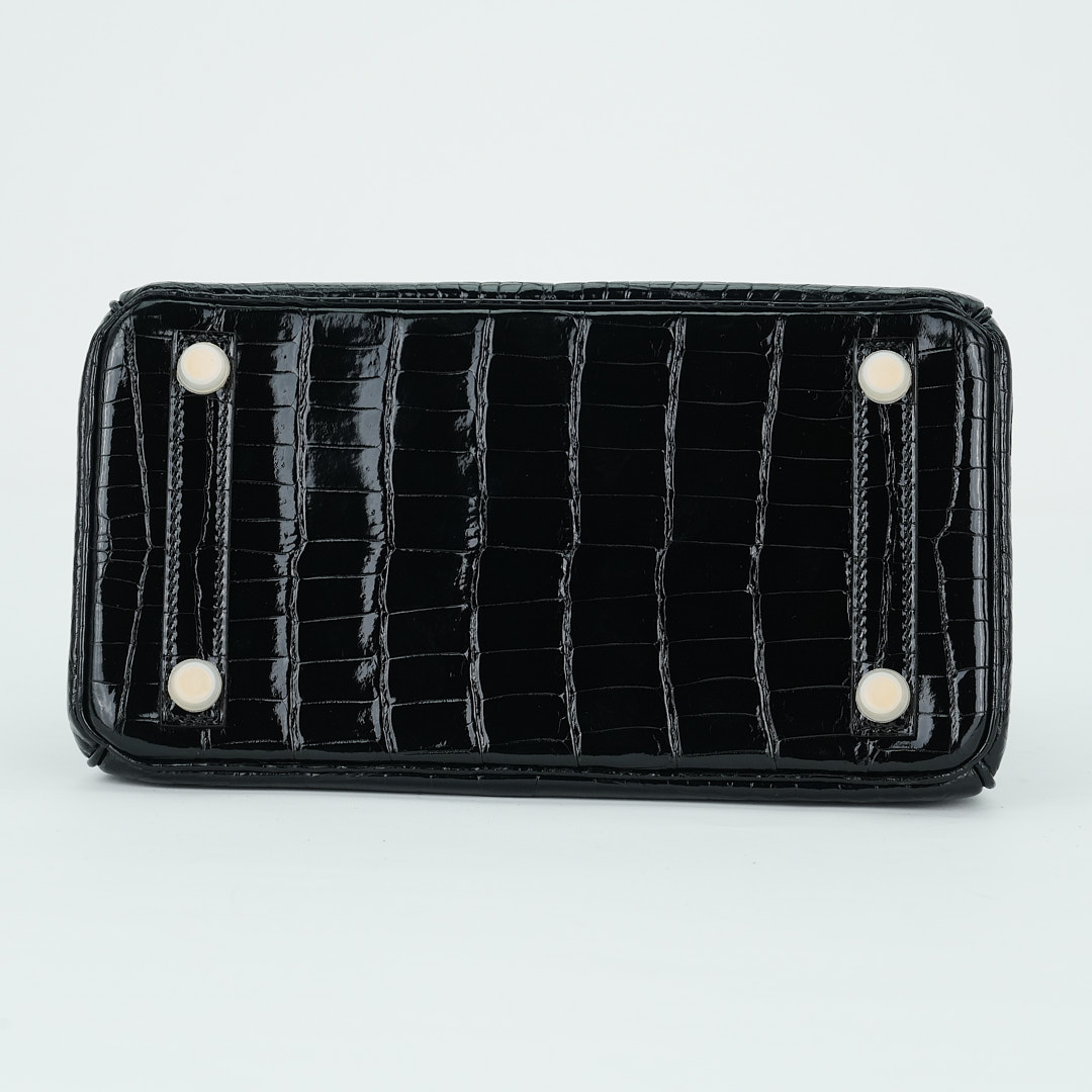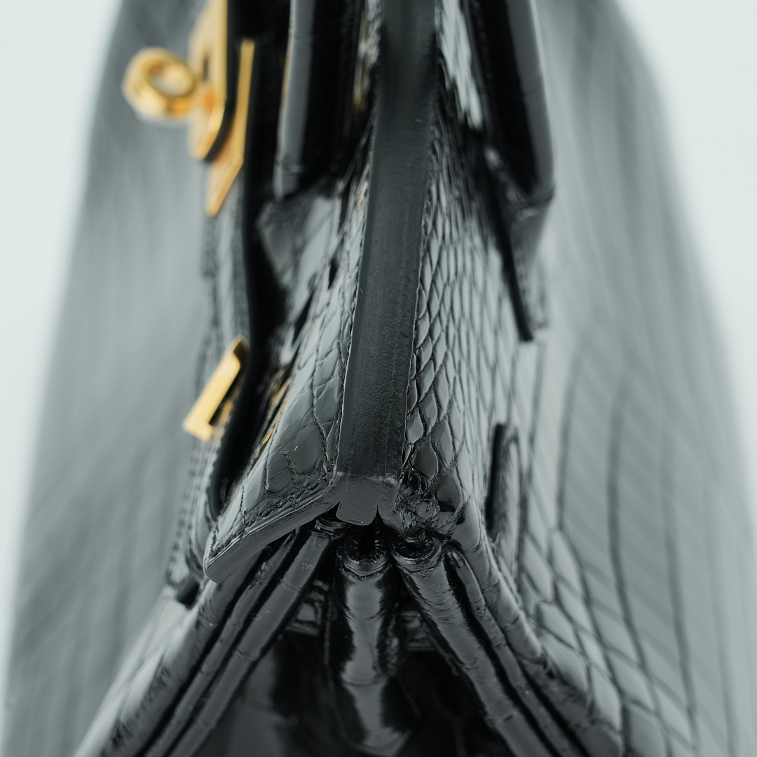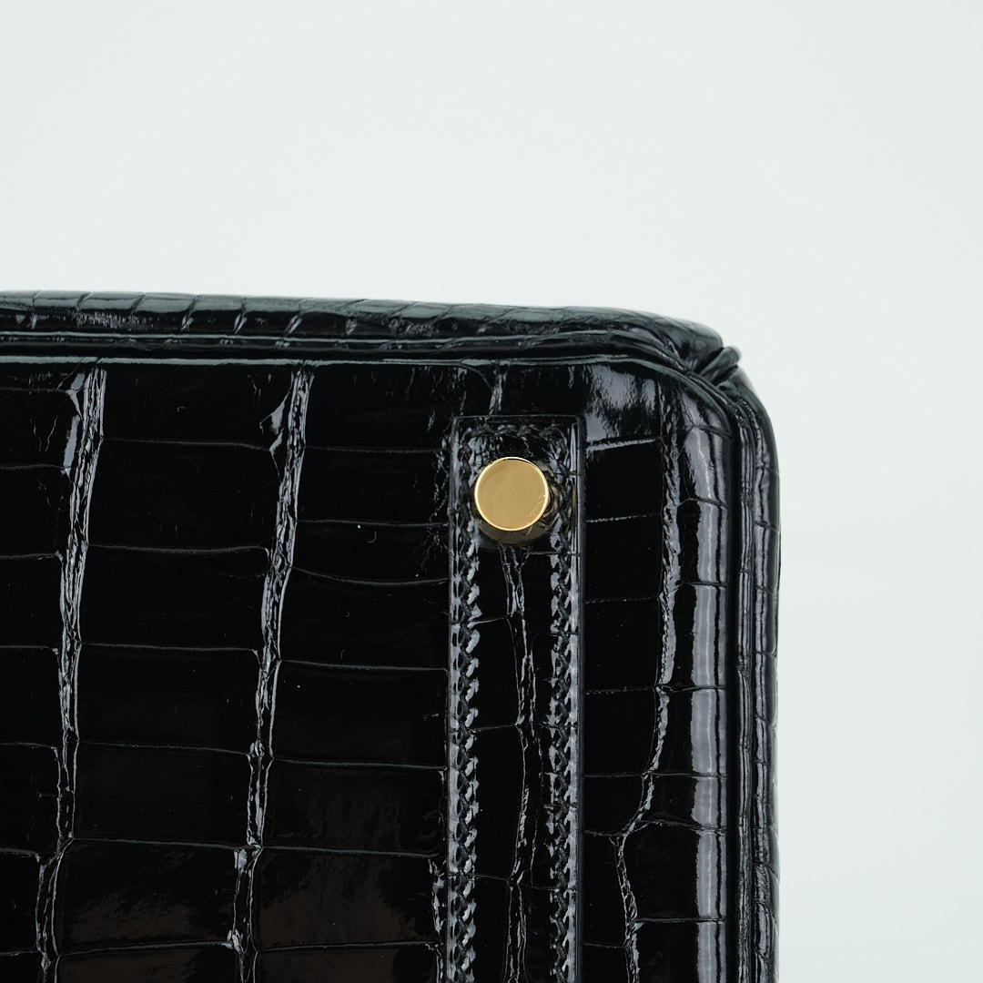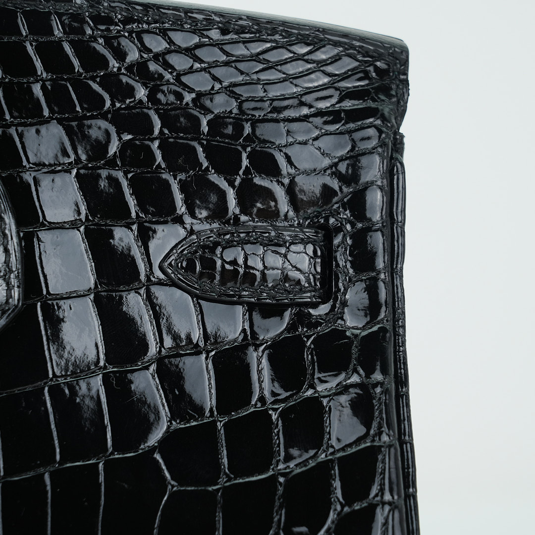 This is a Shinny Niloticus Crocodile BK 25 in Black. This stunning BK is crafted of exotic niloticus crocodile in black. It features rolled crocodile top handles and a matching cross over flap, a horizontal cross strap closure with a polished palladium turn lock, and a clochette with lock and 2 keys. The turn lock opens to a matte goatskin leather interior with zipper and patch pockets. This iconic bag is a true collector’s piece.