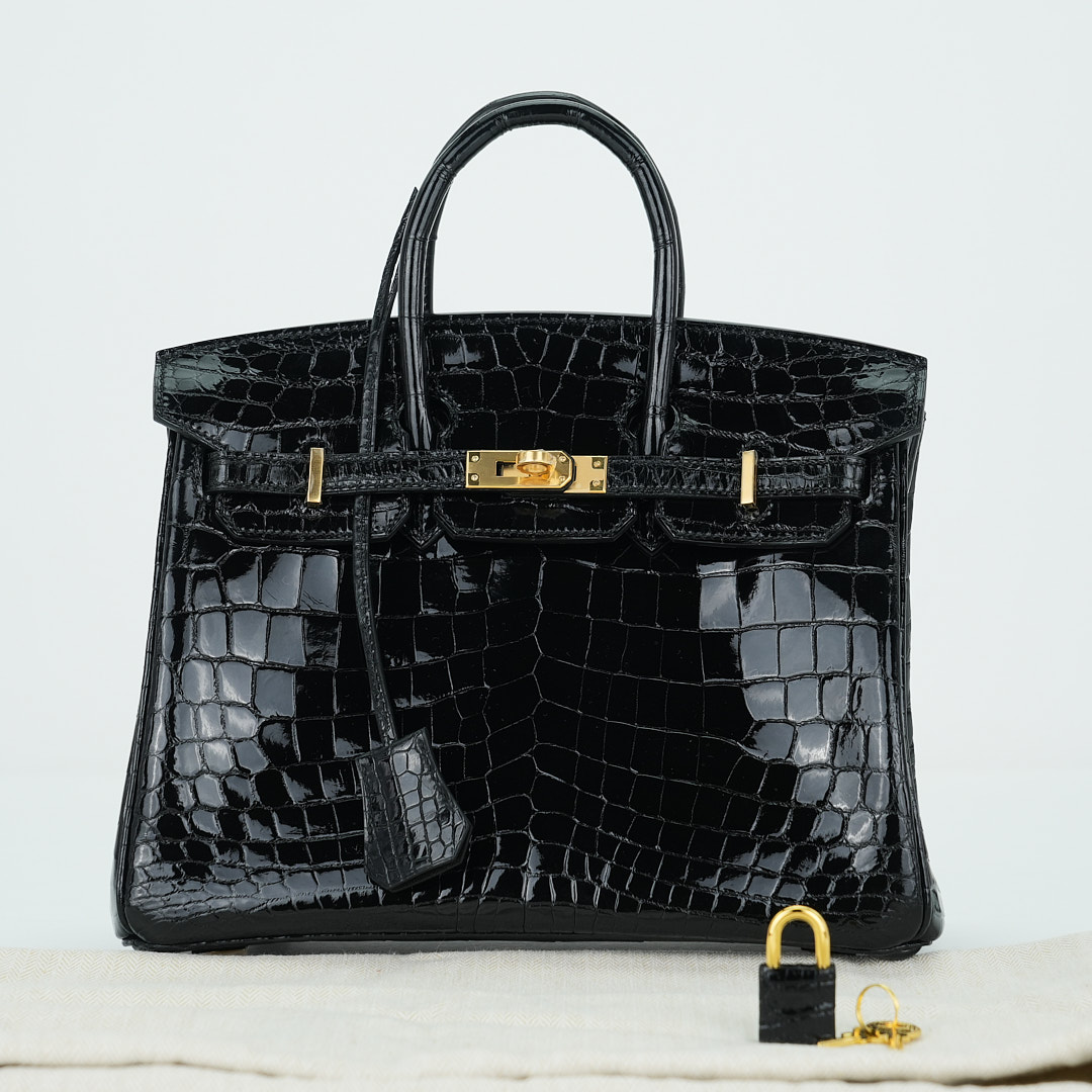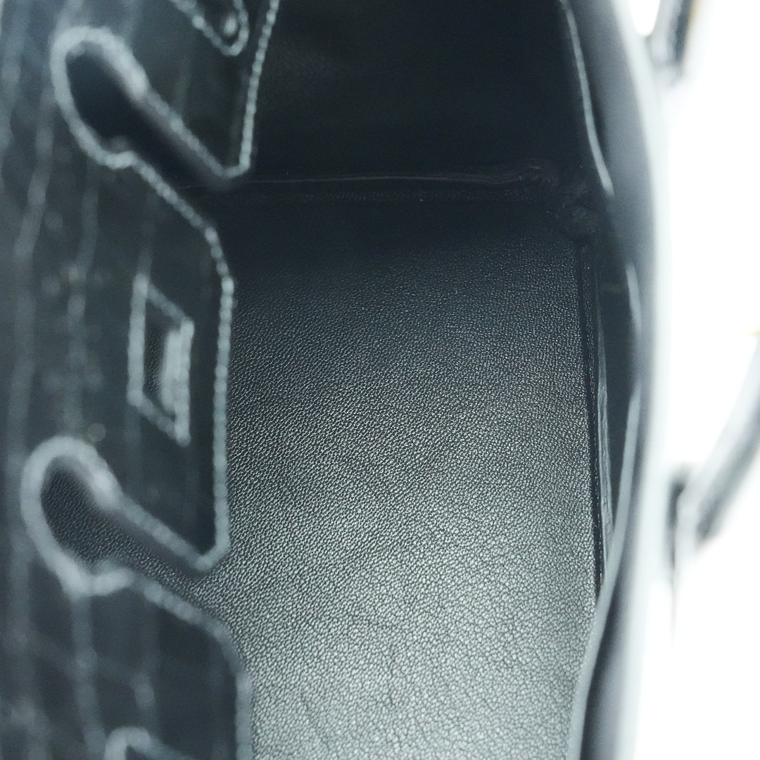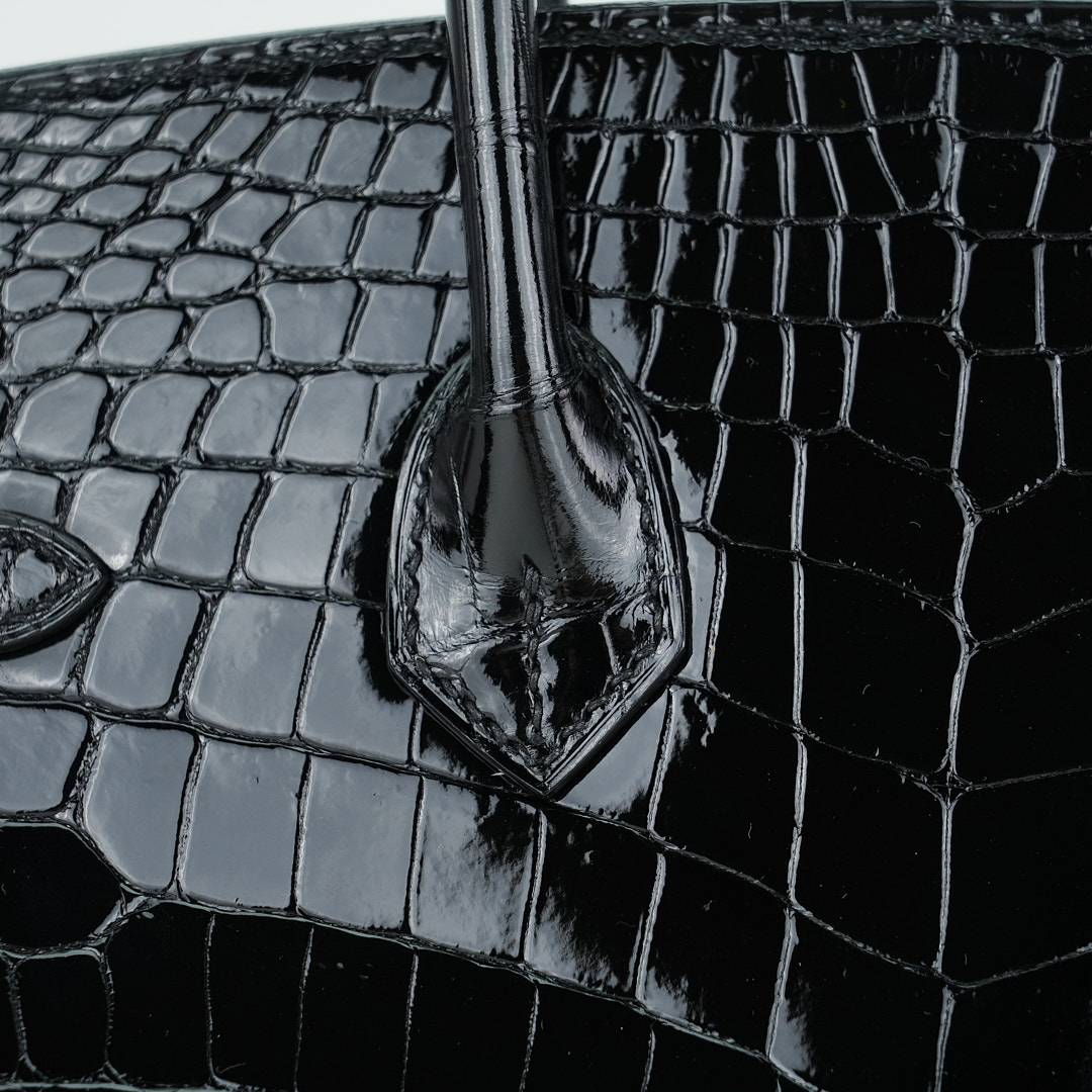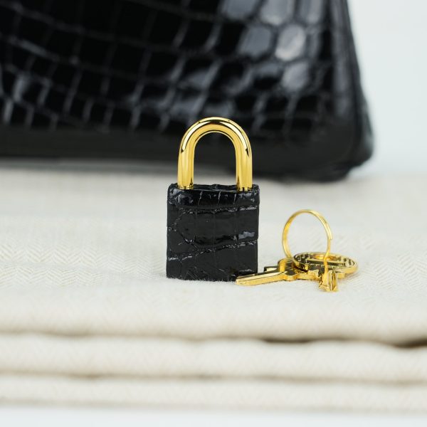 This is a Shinny Niloticus Crocodile BK 25 in Black. This stunning BK is crafted of exotic niloticus crocodile in black. It features rolled crocodile top handles and a matching cross over flap, a horizontal cross strap closure with a polished palladium turn lock, and a clochette with lock and 2 keys. The turn lock opens to a matte goatskin leather interior with zipper and patch pockets. This iconic bag is a true collector’s piece.