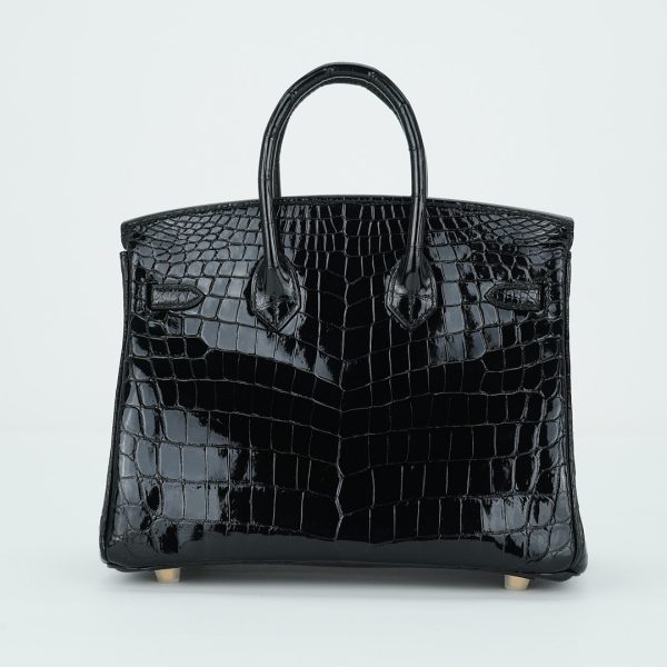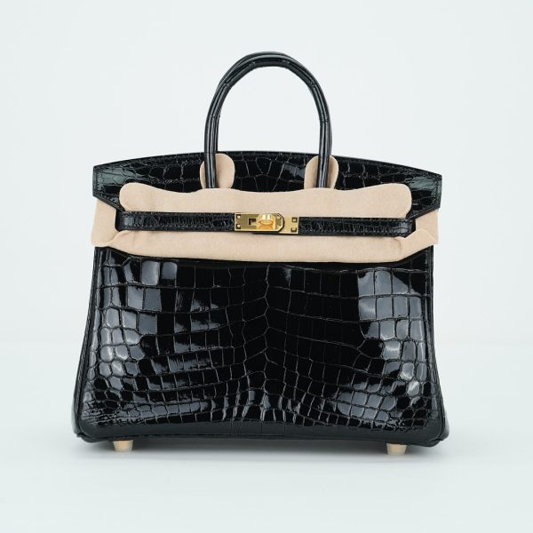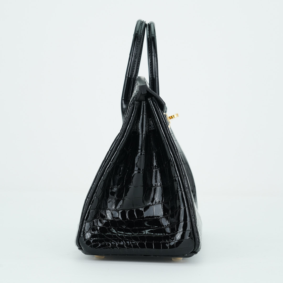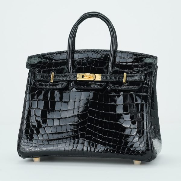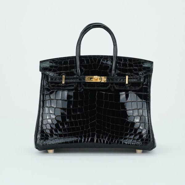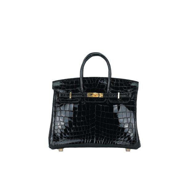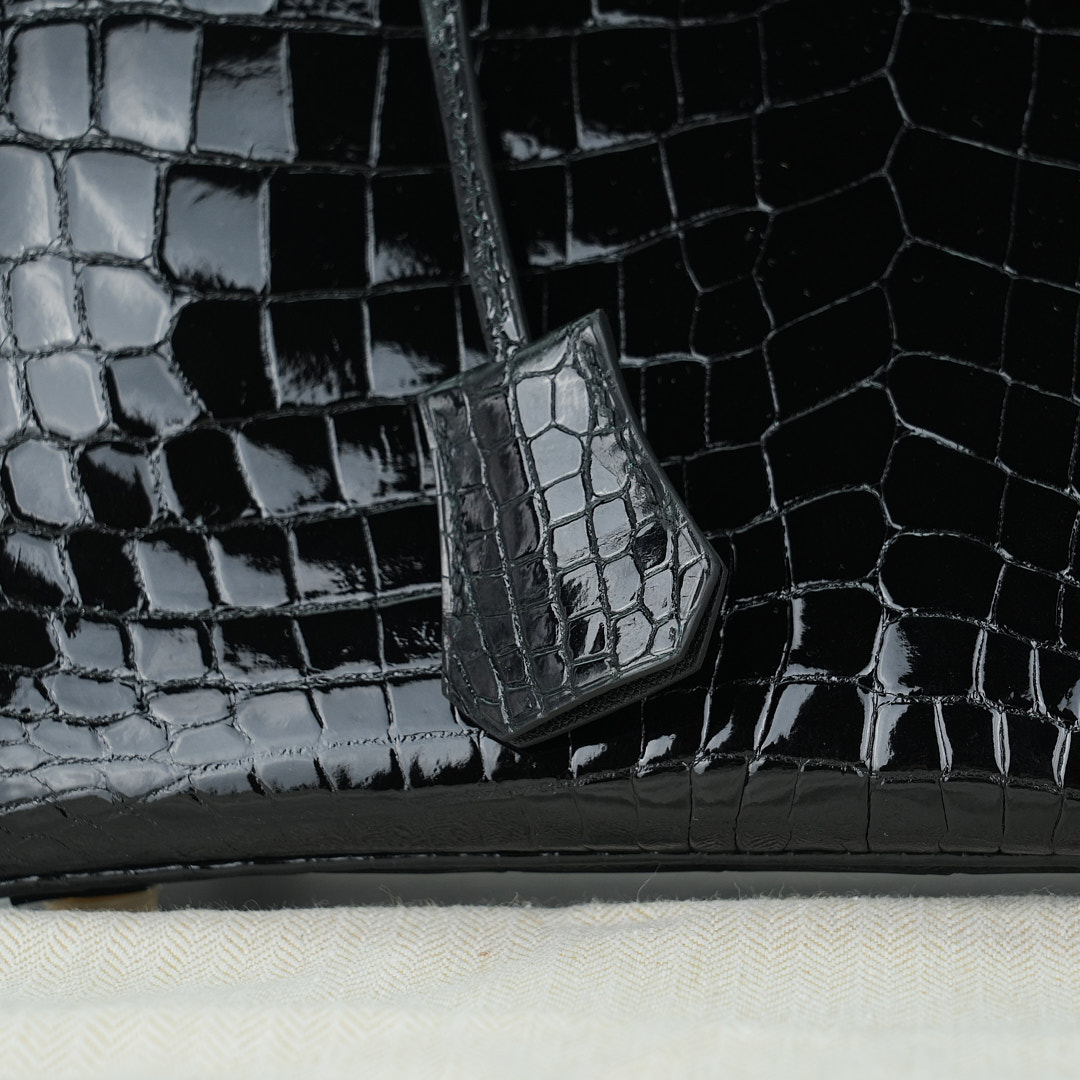 This is a Shinny Niloticus Crocodile BK 25 in Black. This stunning BK is crafted of exotic niloticus crocodile in black. It features rolled crocodile top handles and a matching cross over flap, a horizontal cross strap closure with a polished palladium turn lock, and a clochette with lock and 2 keys. The turn lock opens to a matte goatskin leather interior with zipper and patch pockets. This iconic bag is a true collector’s piece.