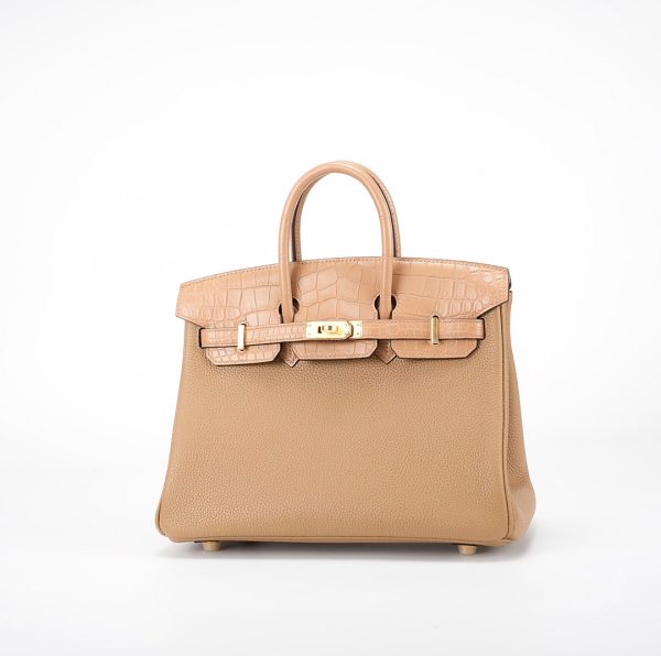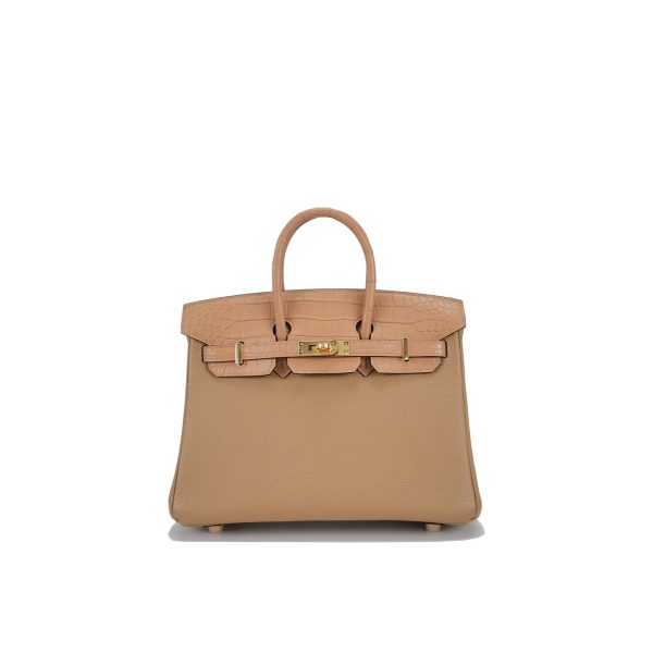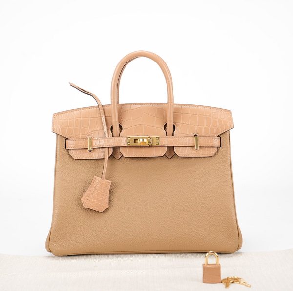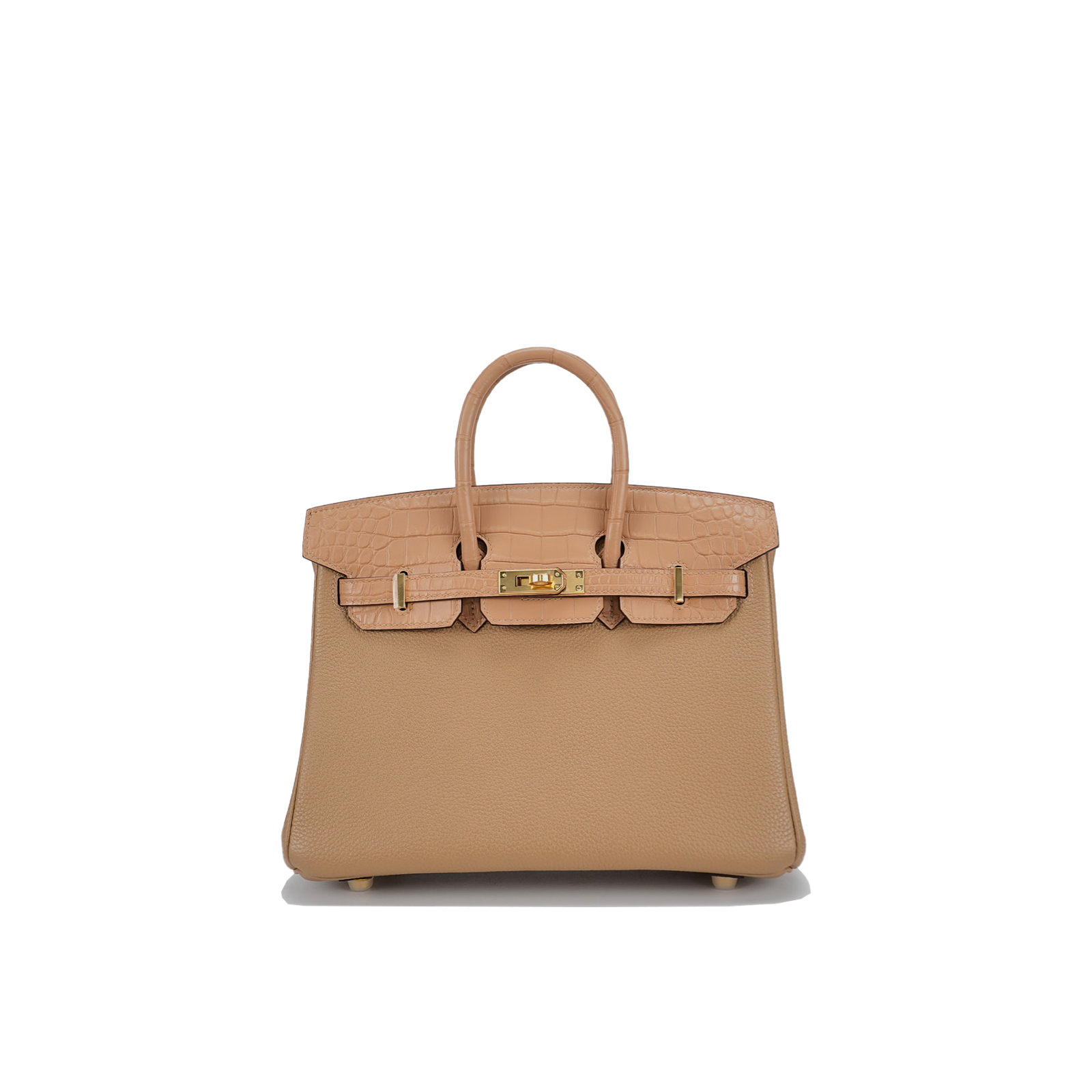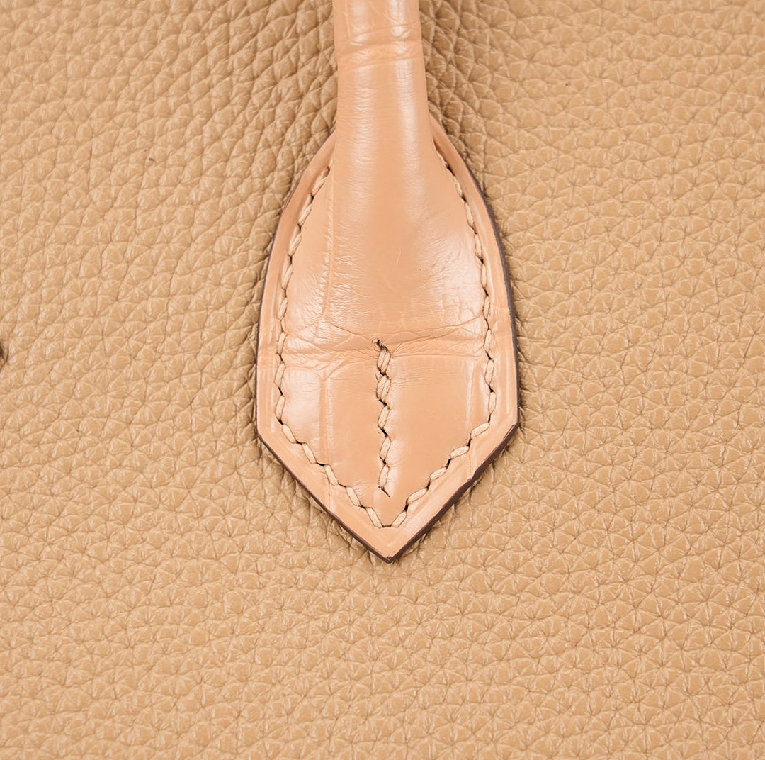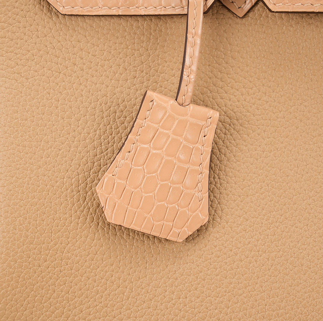 This BK is in Chai matte Alligator Crocodile and togo leather with Gold hardware and has tonal stitching, front strap, two straps with center toggle closure, clochette with lock and two keys and double rolled handles.