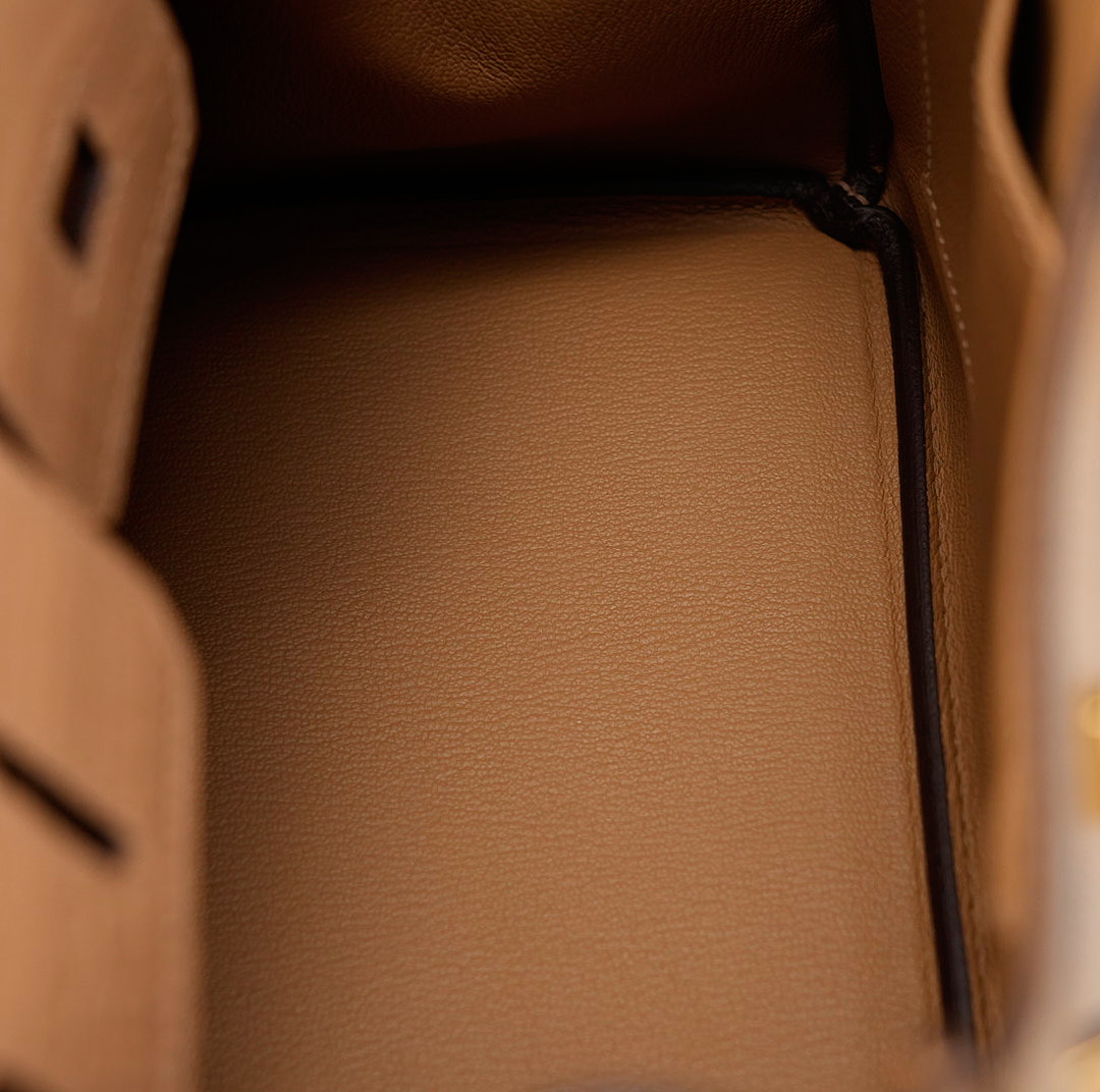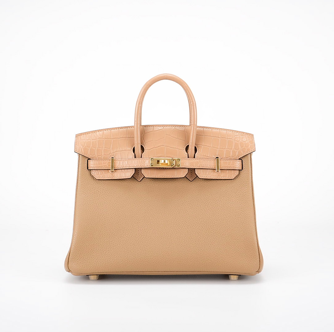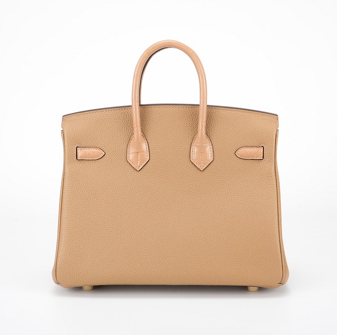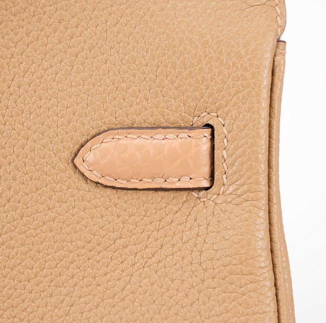 This BK is in Chai matte Alligator Crocodile and togo leather with Gold hardware and has tonal stitching, front strap, two straps with center toggle closure, clochette with lock and two keys and double rolled handles.