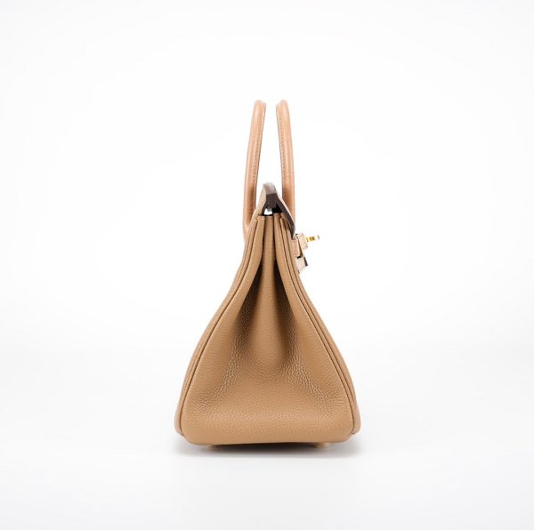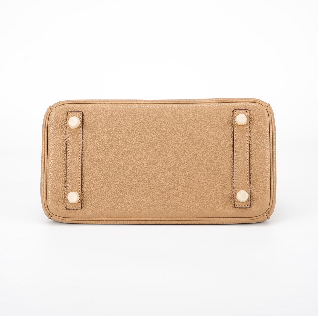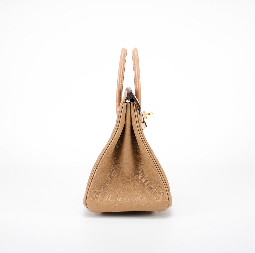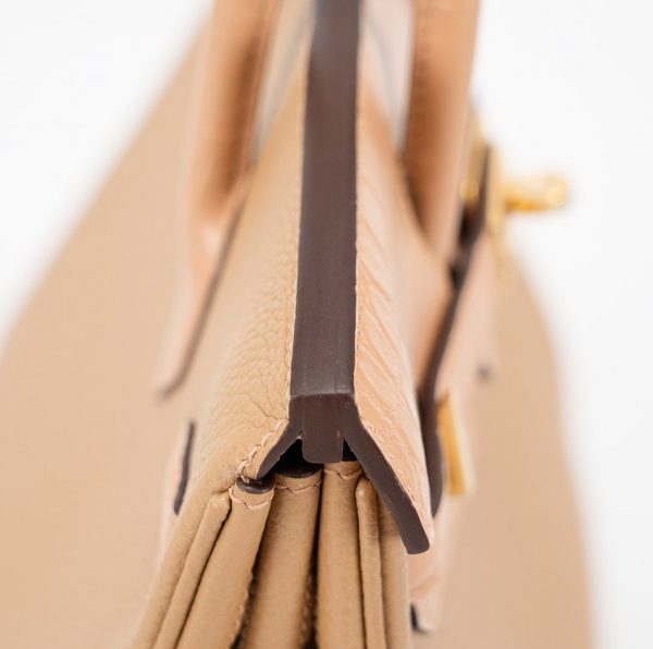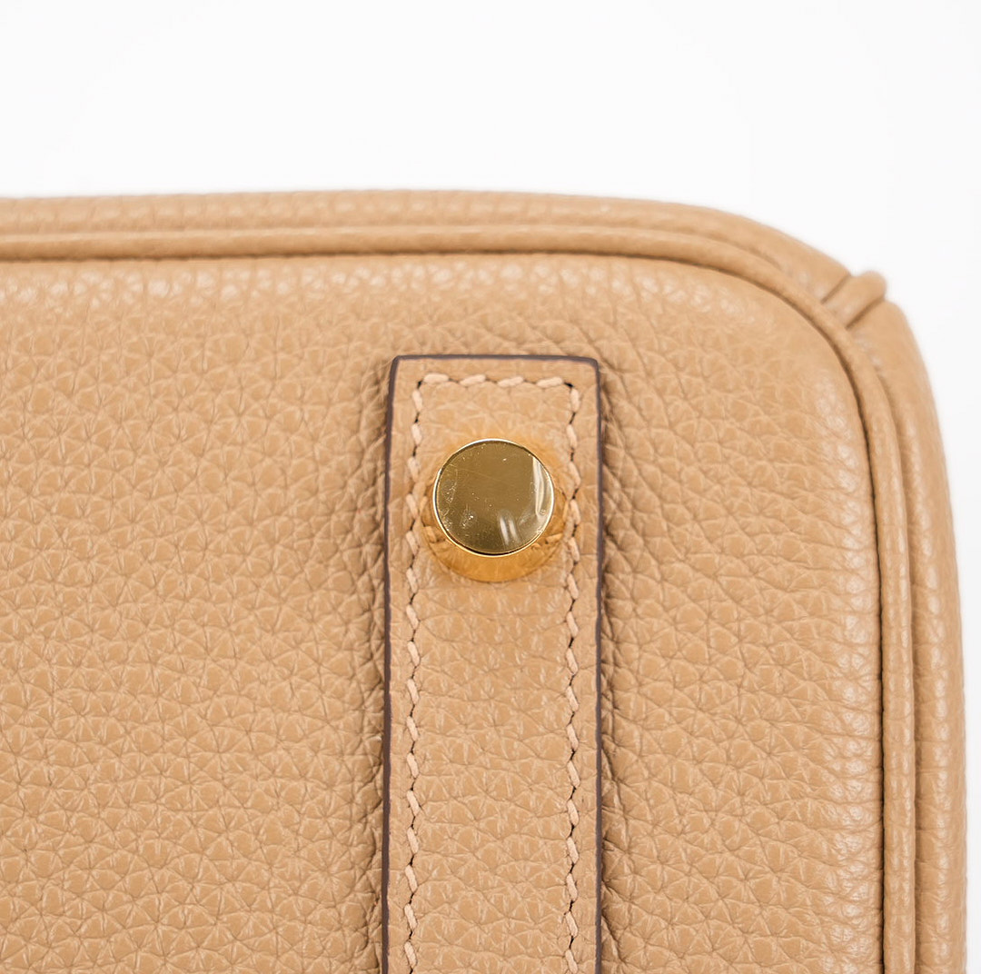 This BK is in Chai matte Alligator Crocodile and togo leather with Gold hardware and has tonal stitching, front strap, two straps with center toggle closure, clochette with lock and two keys and double rolled handles.
