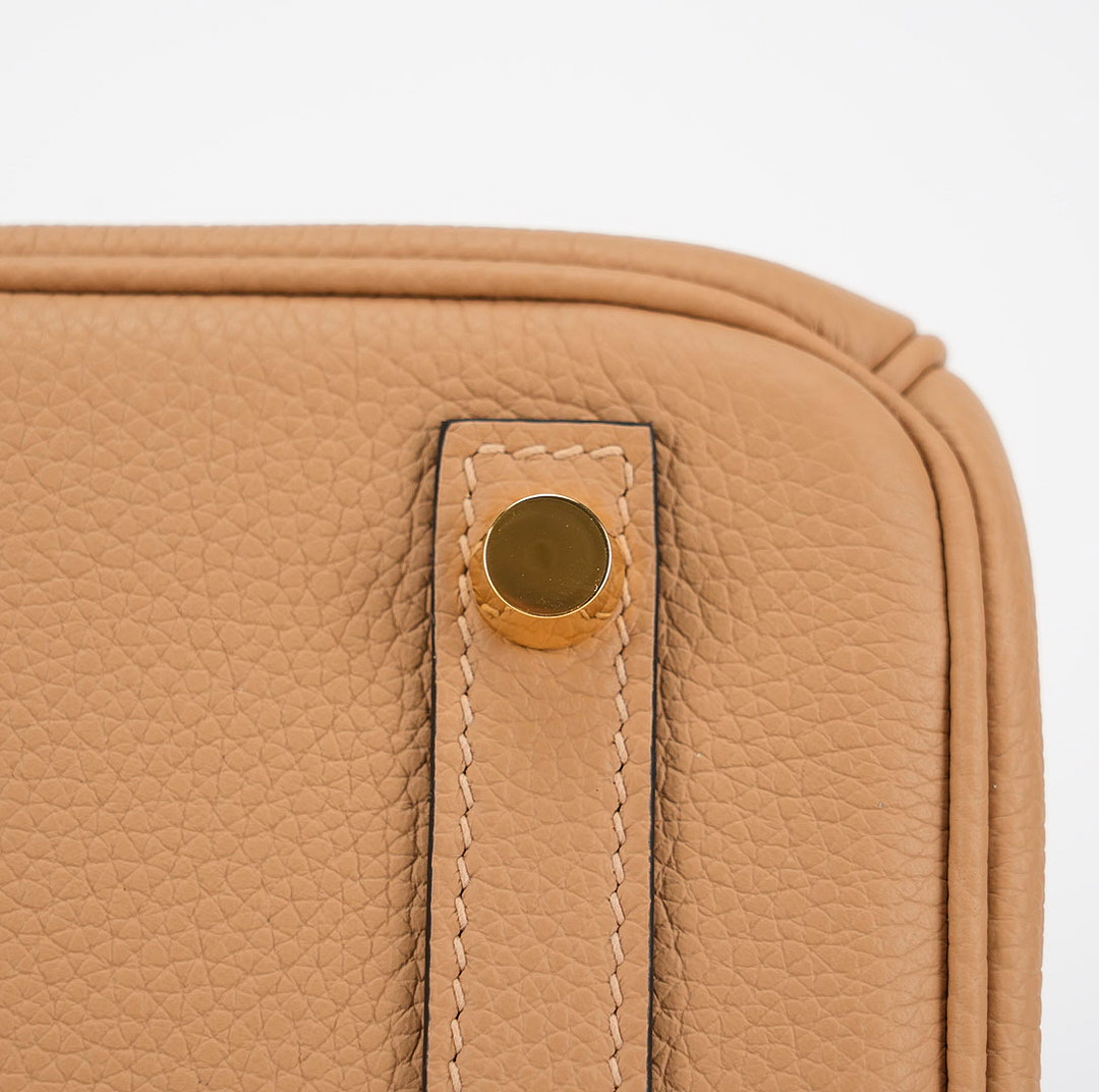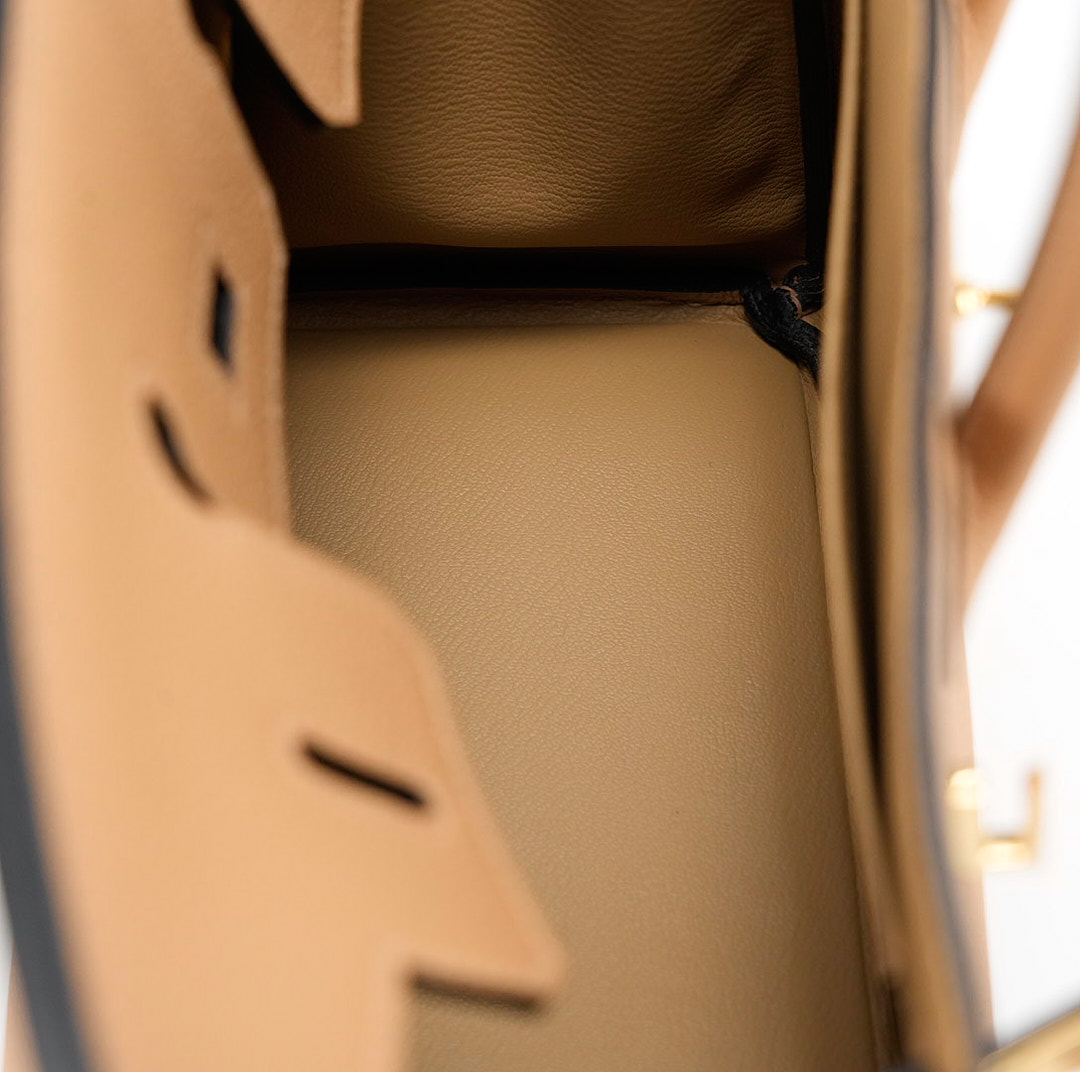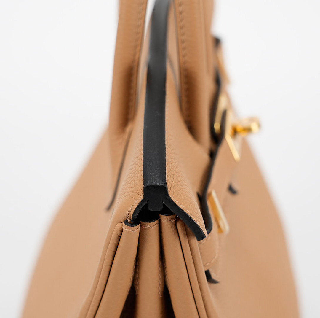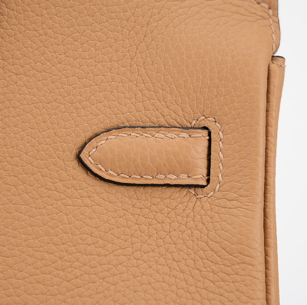 This BK is in Chai togo leather Gold hardware and has tonal stitching with Black Edge Oil. It has two straps with center toggle closure, clochette with lock and two keys and double rolled handles.