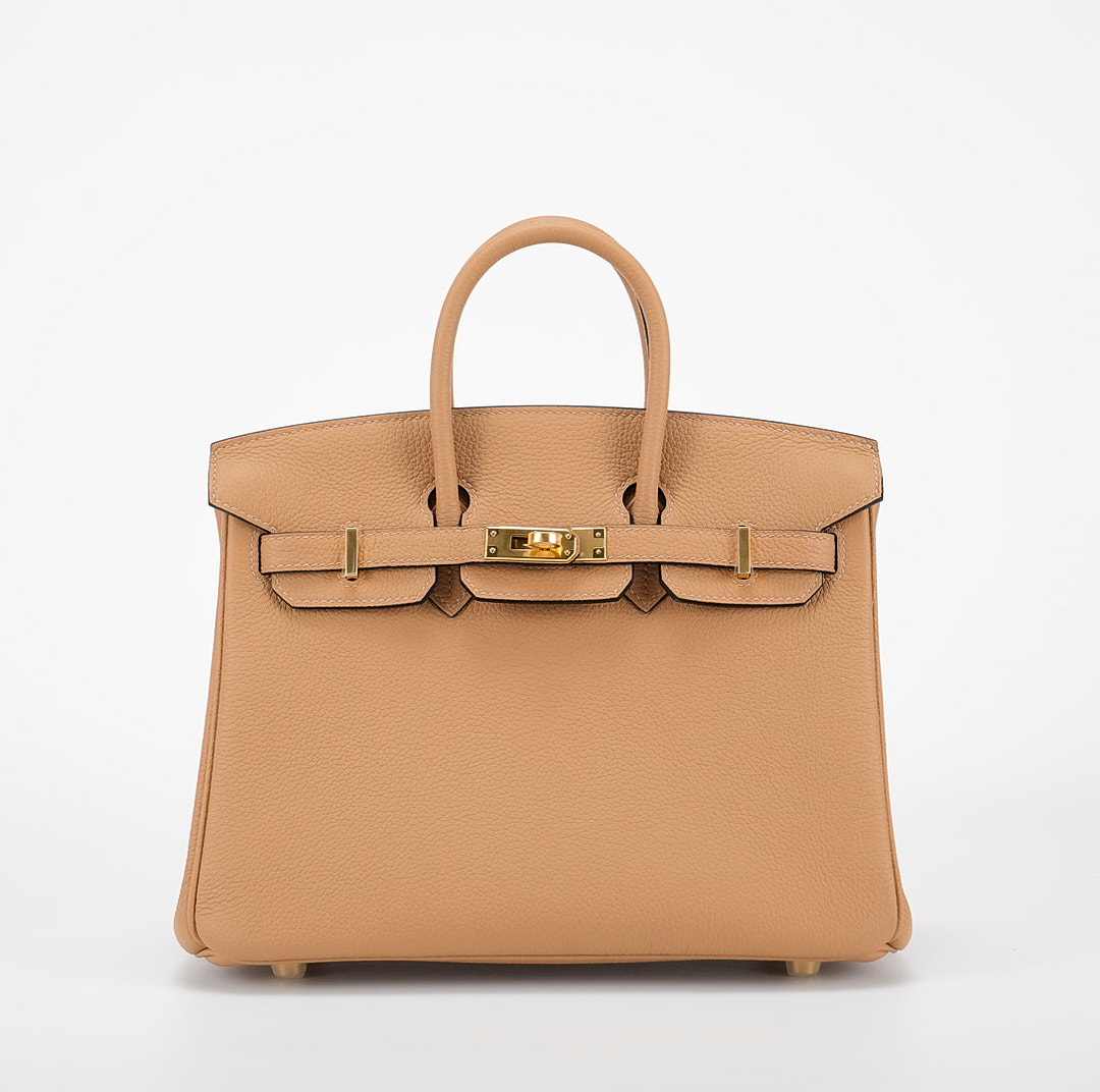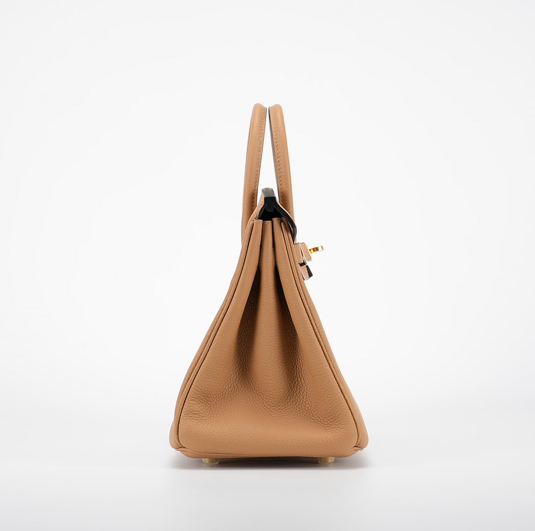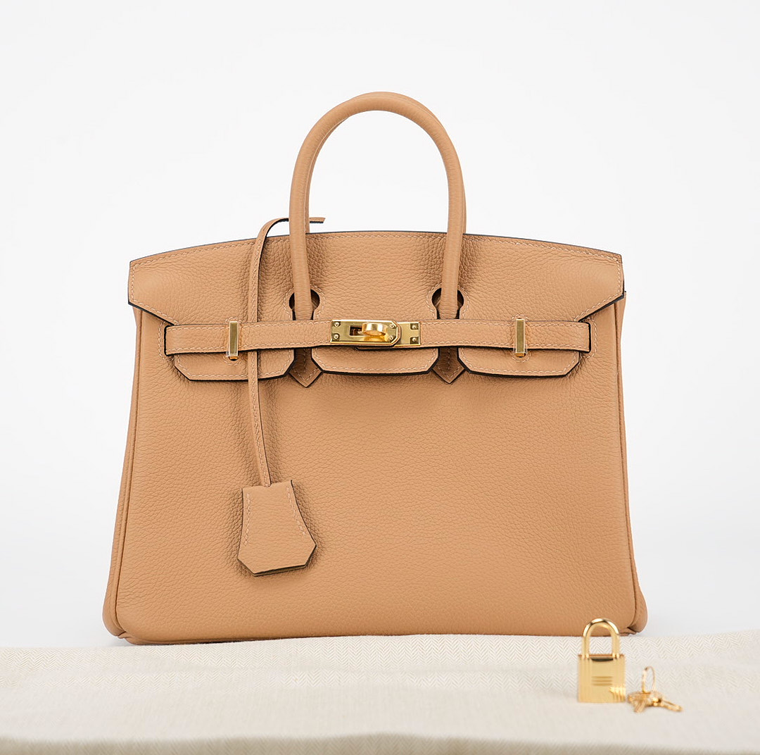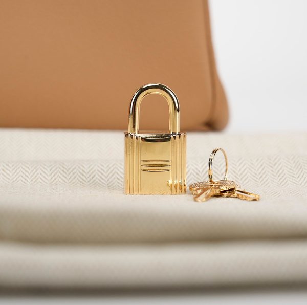 This BK is in Chai togo leather Gold hardware and has tonal stitching with Black Edge Oil. It has two straps with center toggle closure, clochette with lock and two keys and double rolled handles.