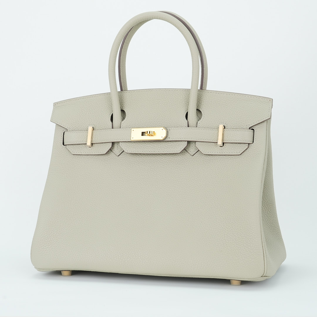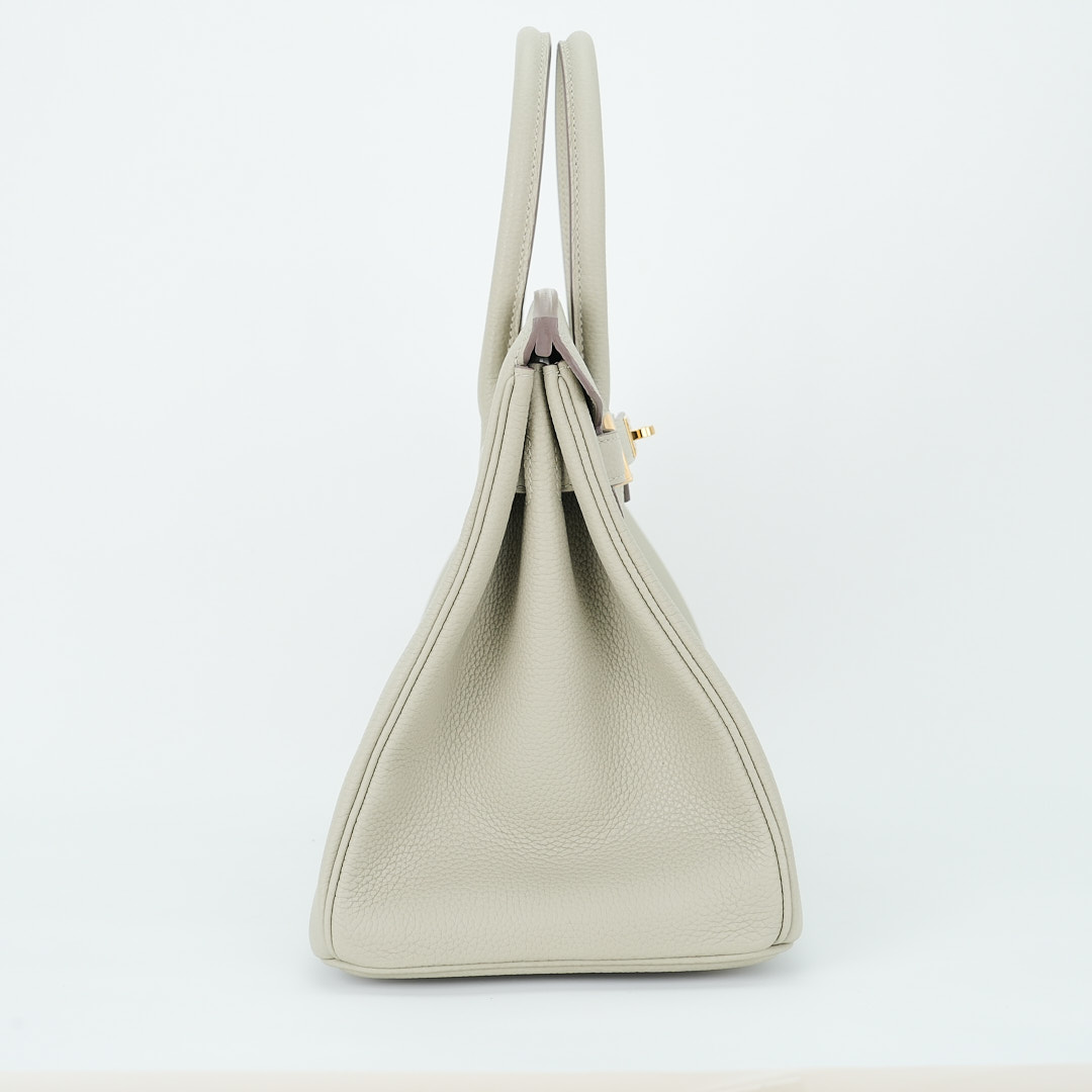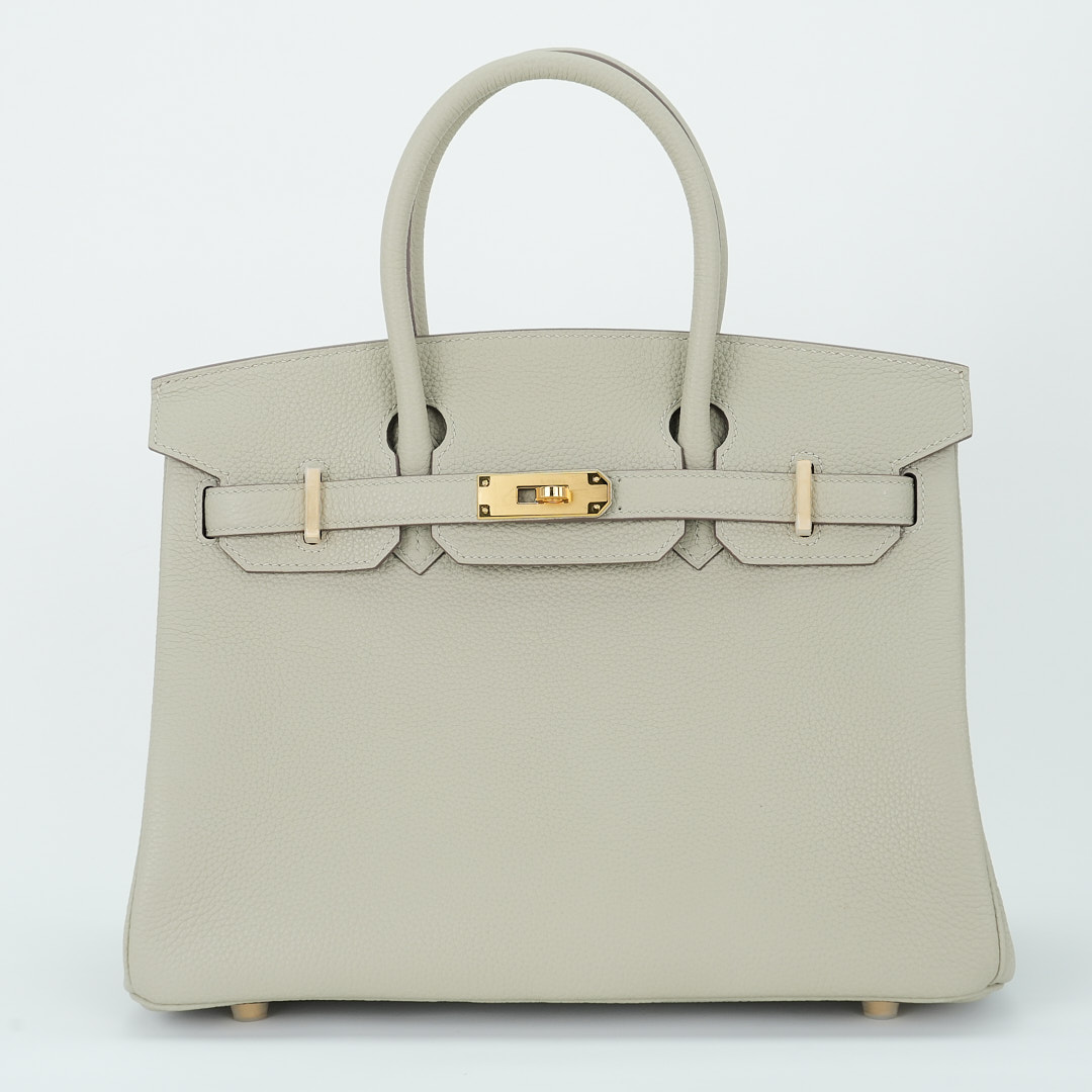 This BK is in Gris Ciment togo leather with Gold hardware, has tonal stitching, front flap, two straps with center toggle closure, clochette with lock and two keys, and double rolled handles.