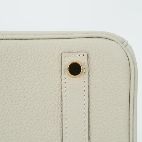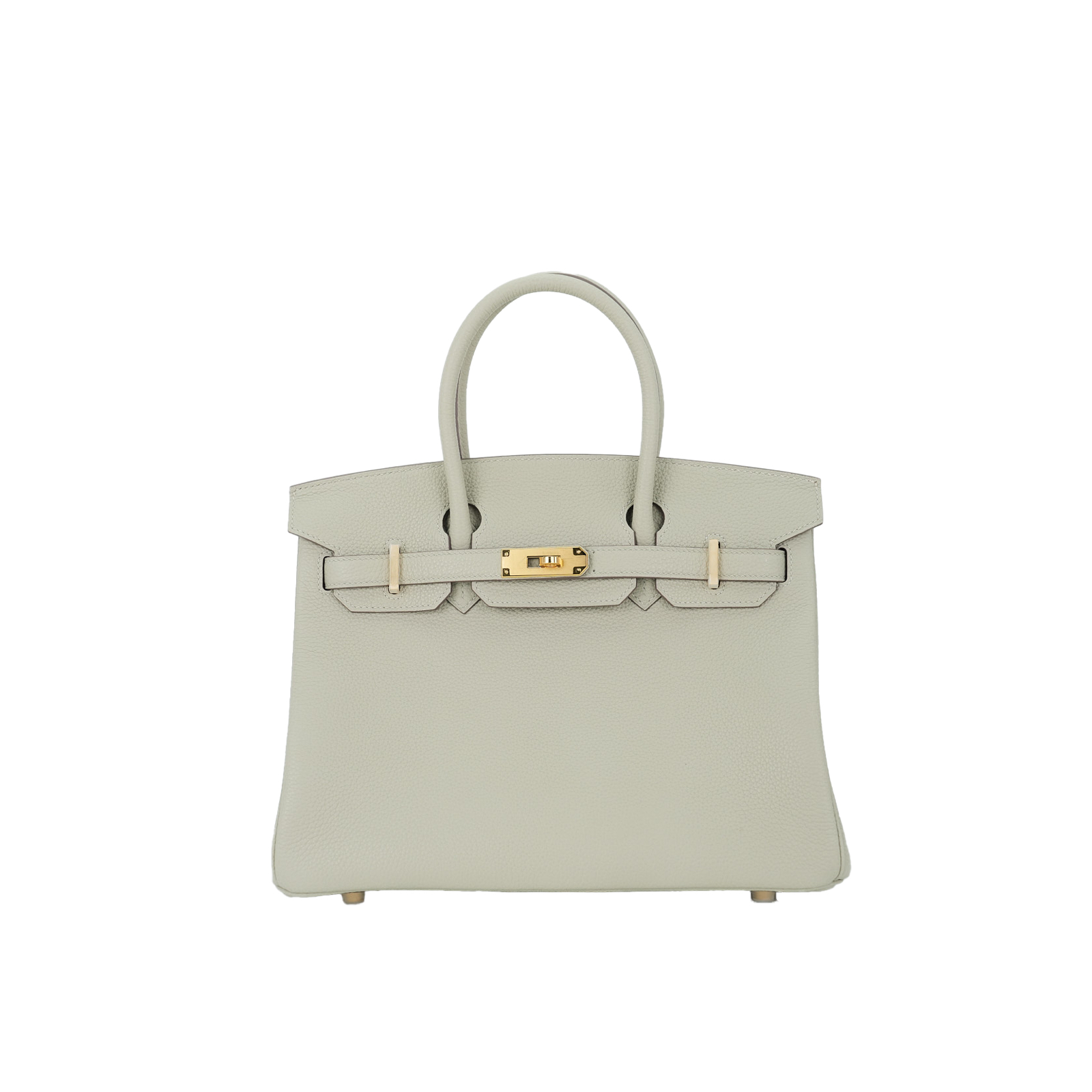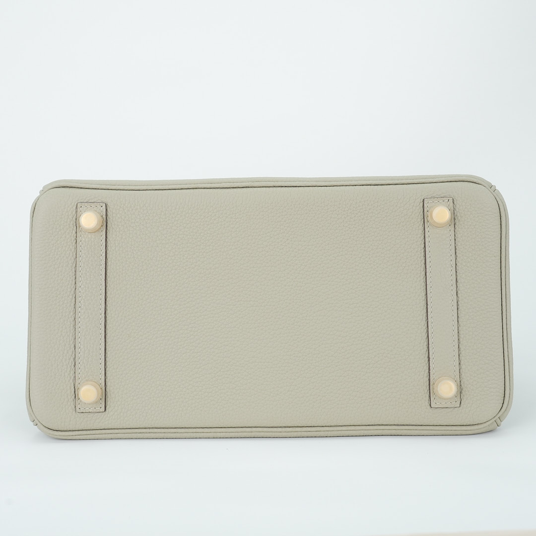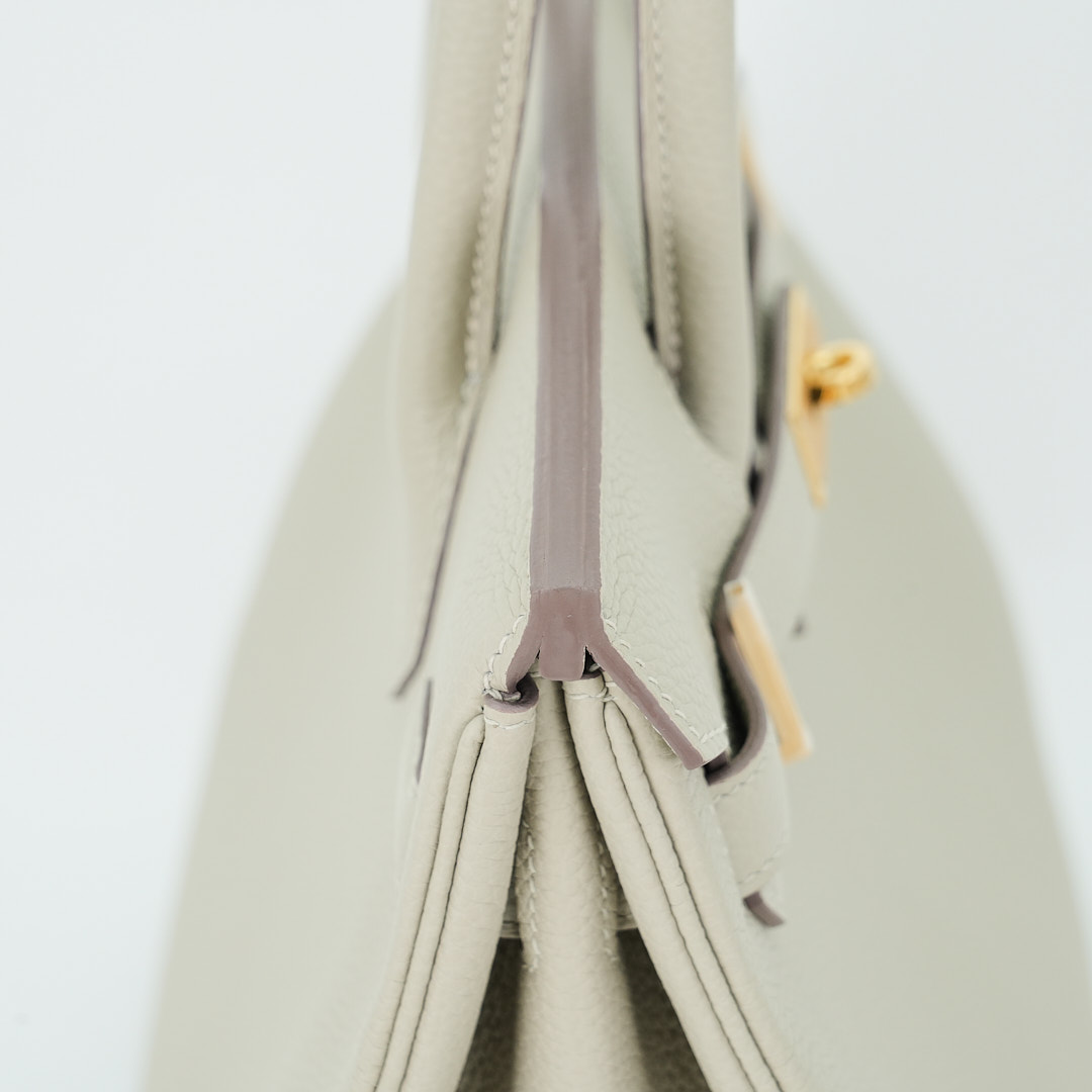 This BK is in Gris Ciment togo leather with Gold hardware, has tonal stitching, front flap, two straps with center toggle closure, clochette with lock and two keys, and double rolled handles.