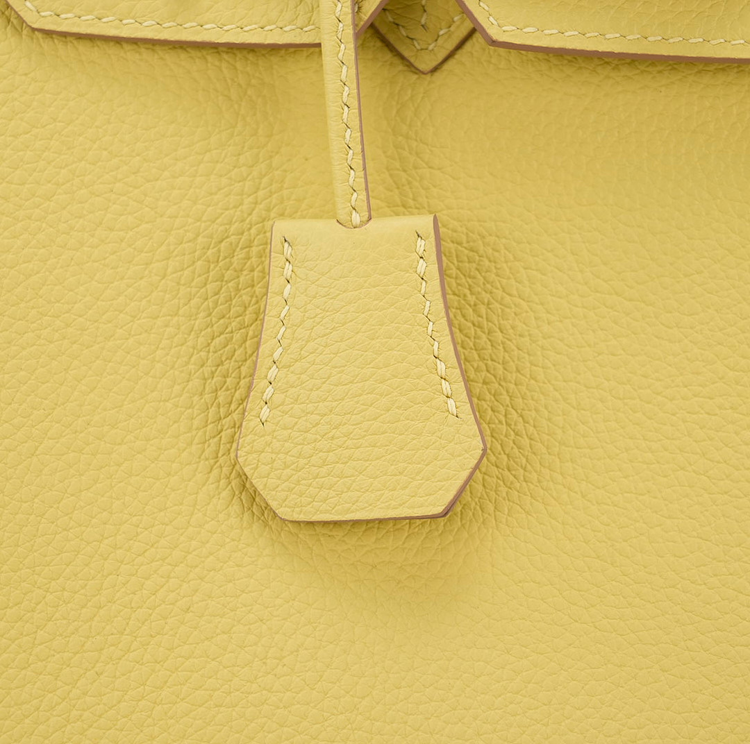 This BK is in Jaune Poussin togo leather with palladium hardware, has tonal stitching, front flap, two straps with center toggle closure, clochette with lock and two keys, and double rolled handles.