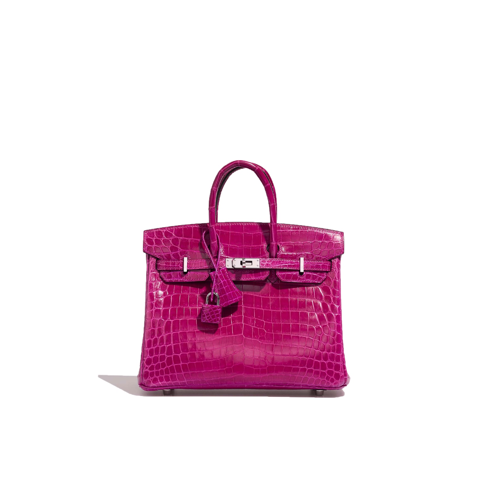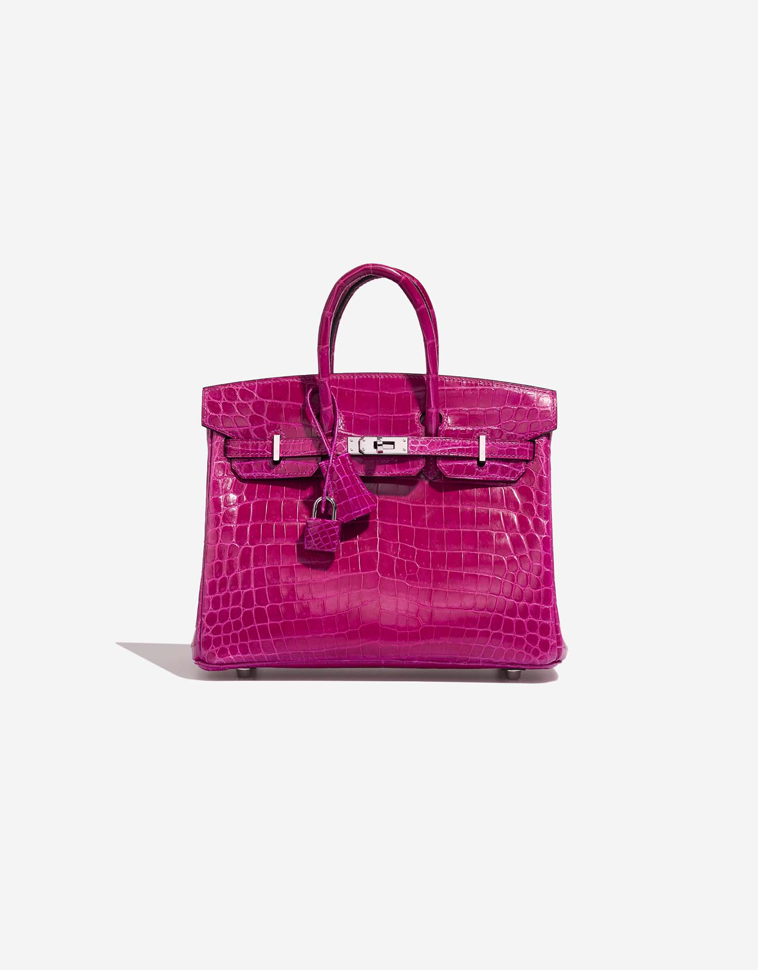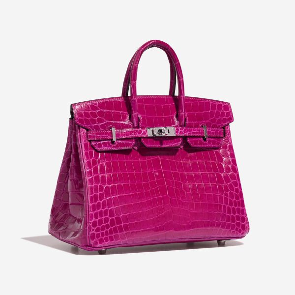 This exotic BK 25 has been handcrafted from Niloticus Crocodile leather in Rose Pourpre. The bright colored-design highlights the shiny palladium hardware and adds an elegant touch of color to your outfit.