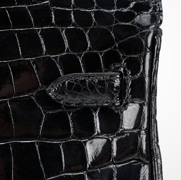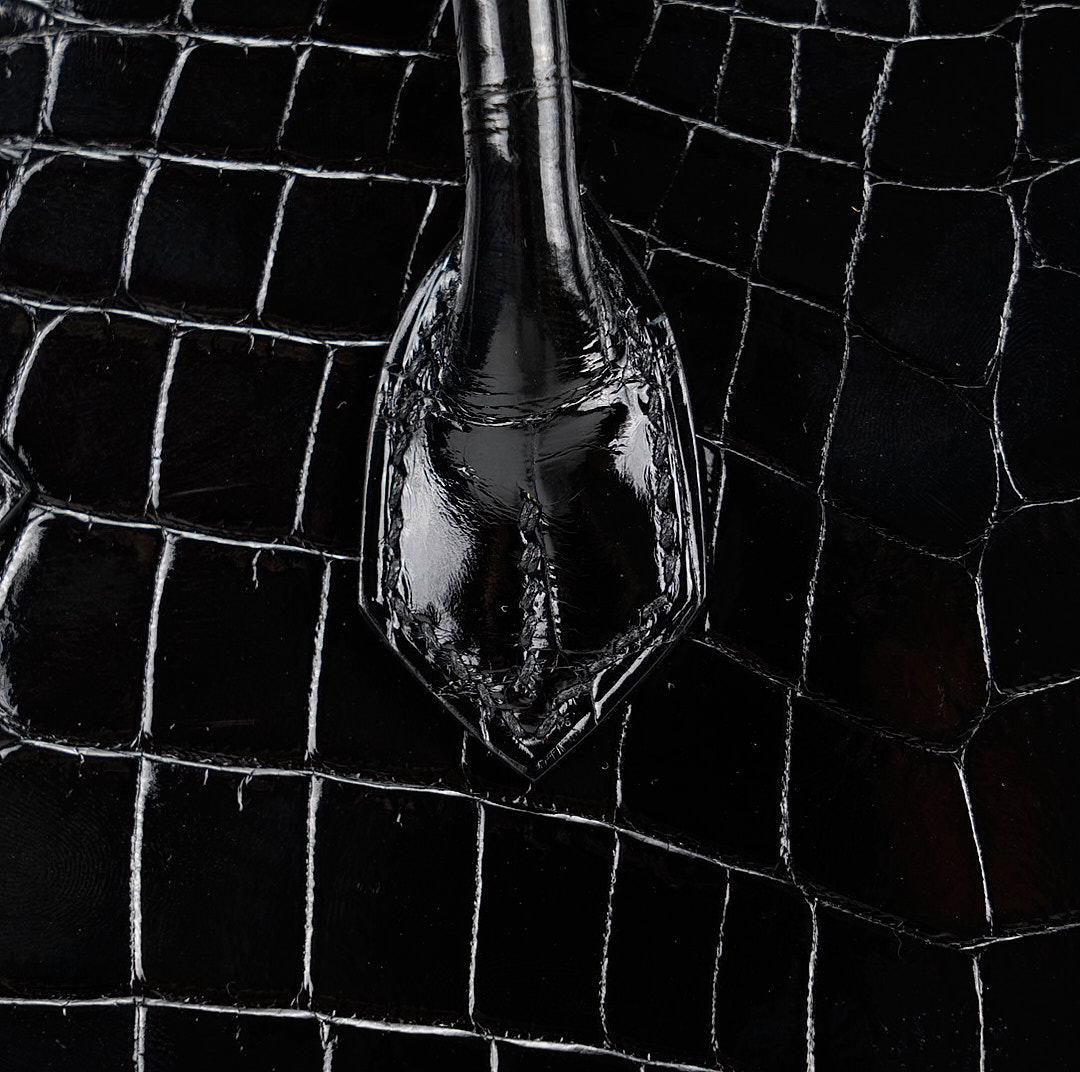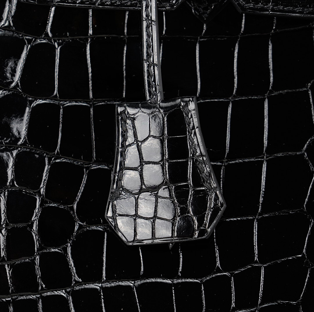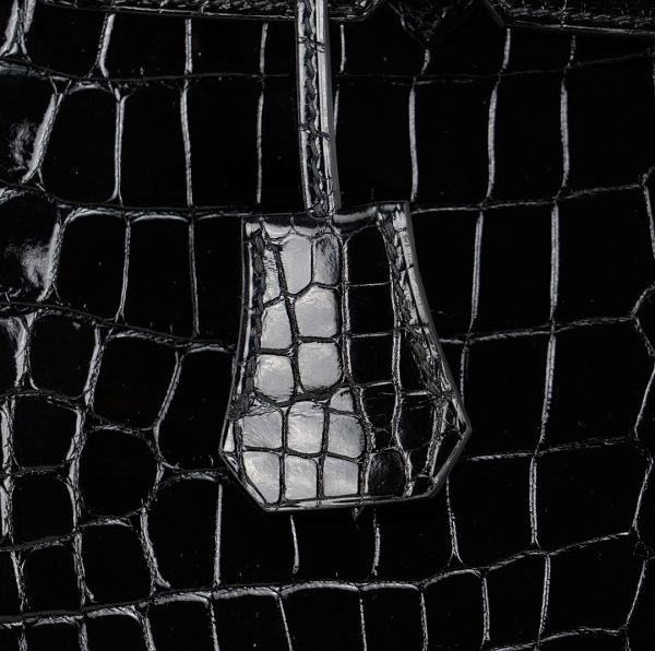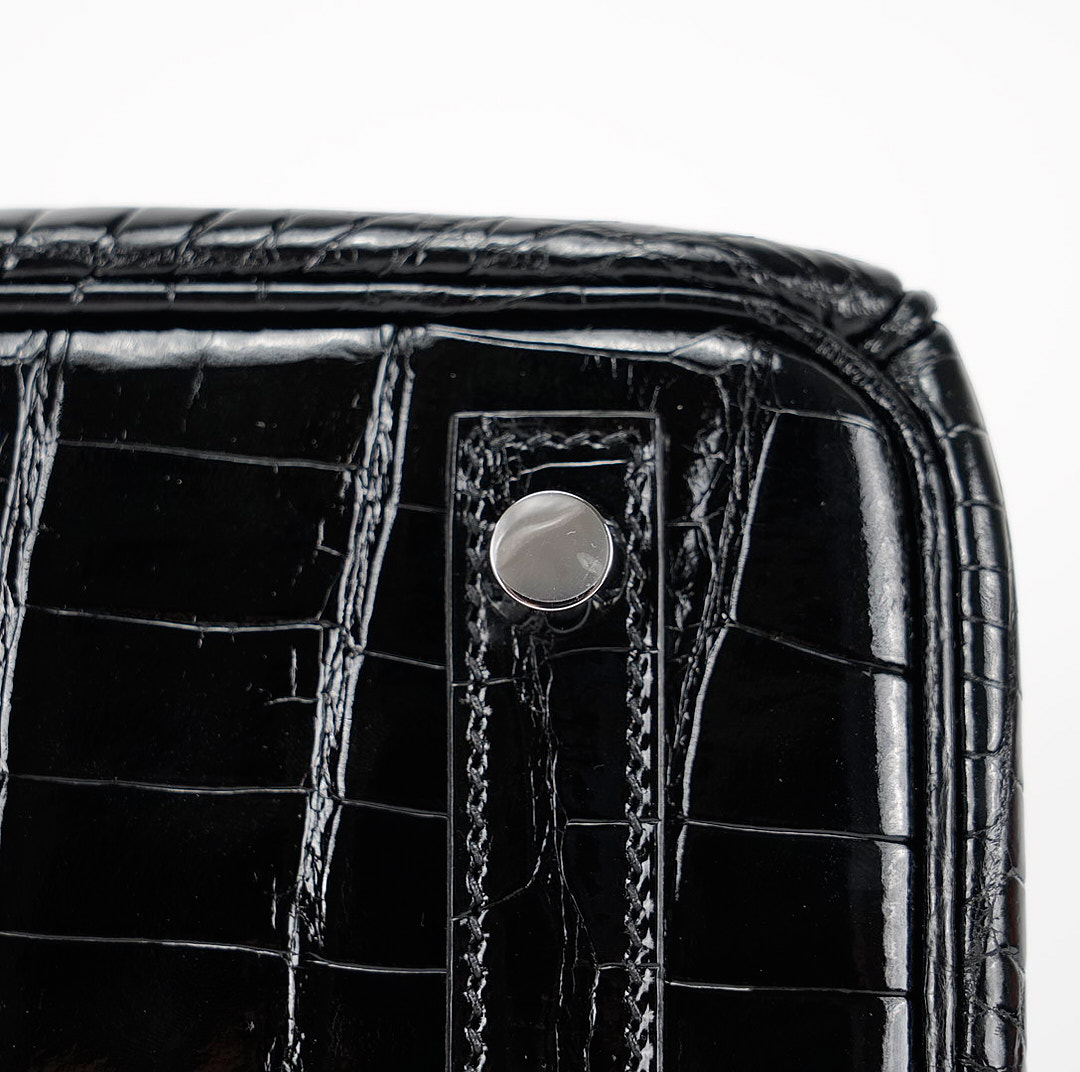 This is a Shiny Niloticus Crocodile BK 25 in Black. This stunning BK is crafted of exotic niloticus crocodile in black. It features rolled crocodile top handles and a matching cross over flap, a horizontal cross strap closure with a polished palladium turn lock, and a clochette with lock and 2 keys. The turn lock opens to a matte goatskin leather interior with zipper and patch pockets. This iconic bag is a true collector’s piece.
