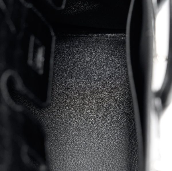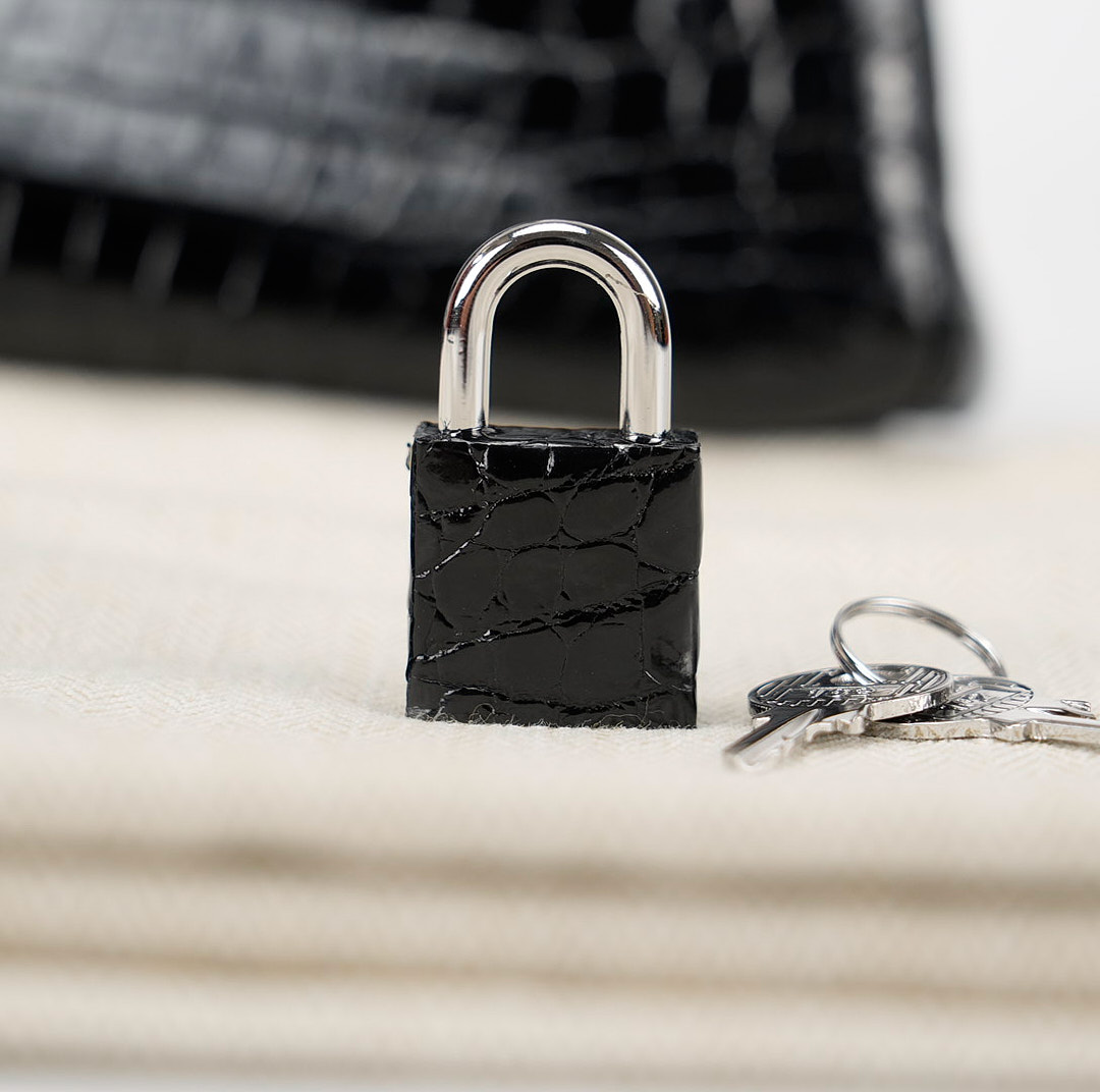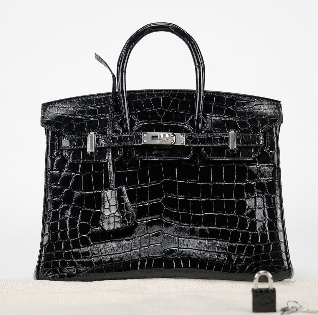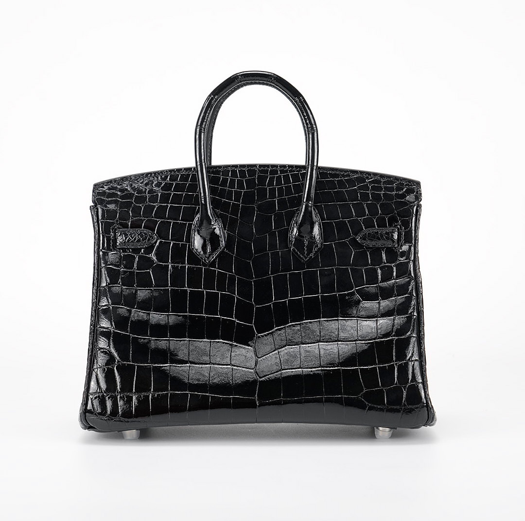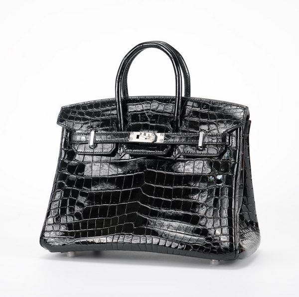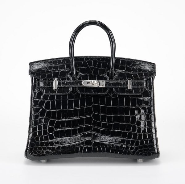 This is a Shiny Niloticus Crocodile BK 25 in Black. This stunning BK is crafted of exotic niloticus crocodile in black. It features rolled crocodile top handles and a matching cross over flap, a horizontal cross strap closure with a polished palladium turn lock, and a clochette with lock and 2 keys. The turn lock opens to a matte goatskin leather interior with zipper and patch pockets. This iconic bag is a true collector’s piece.