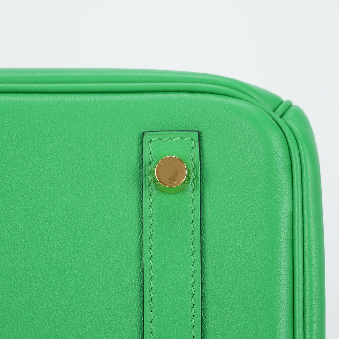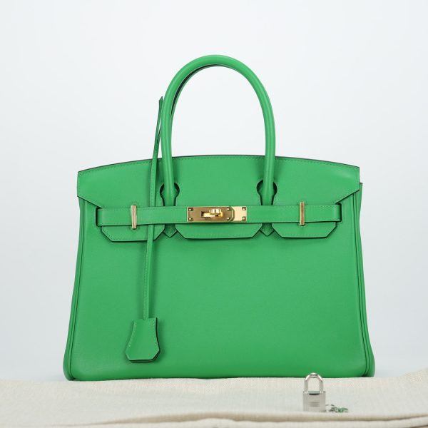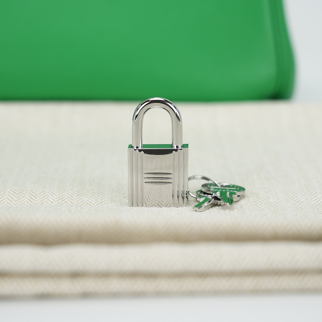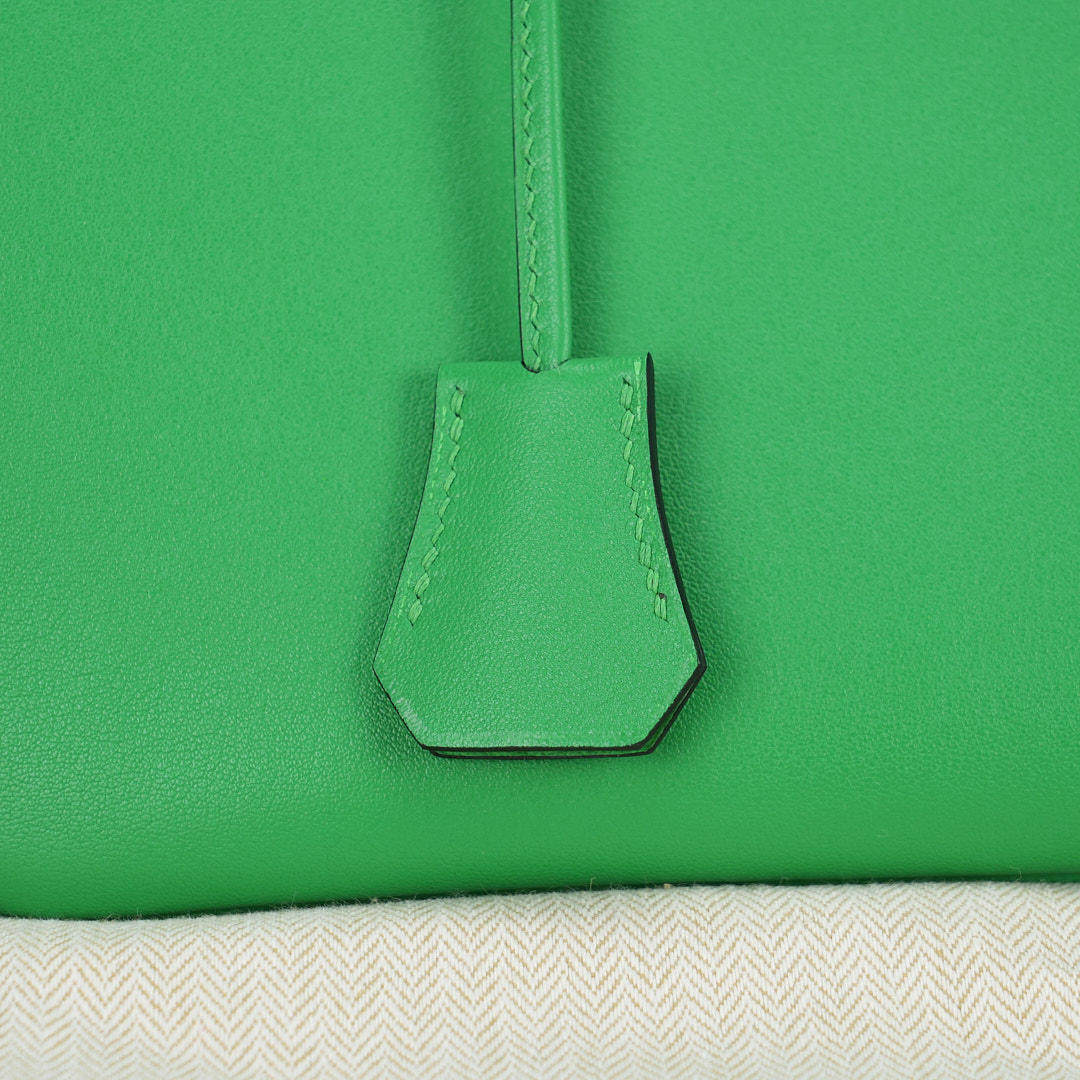 This BK is in Bamboo Swift leather with Gold hardware, has tonal stitching, front flap, two straps with center toggle closure, clochette with lock and two keys, and double rolled handles.