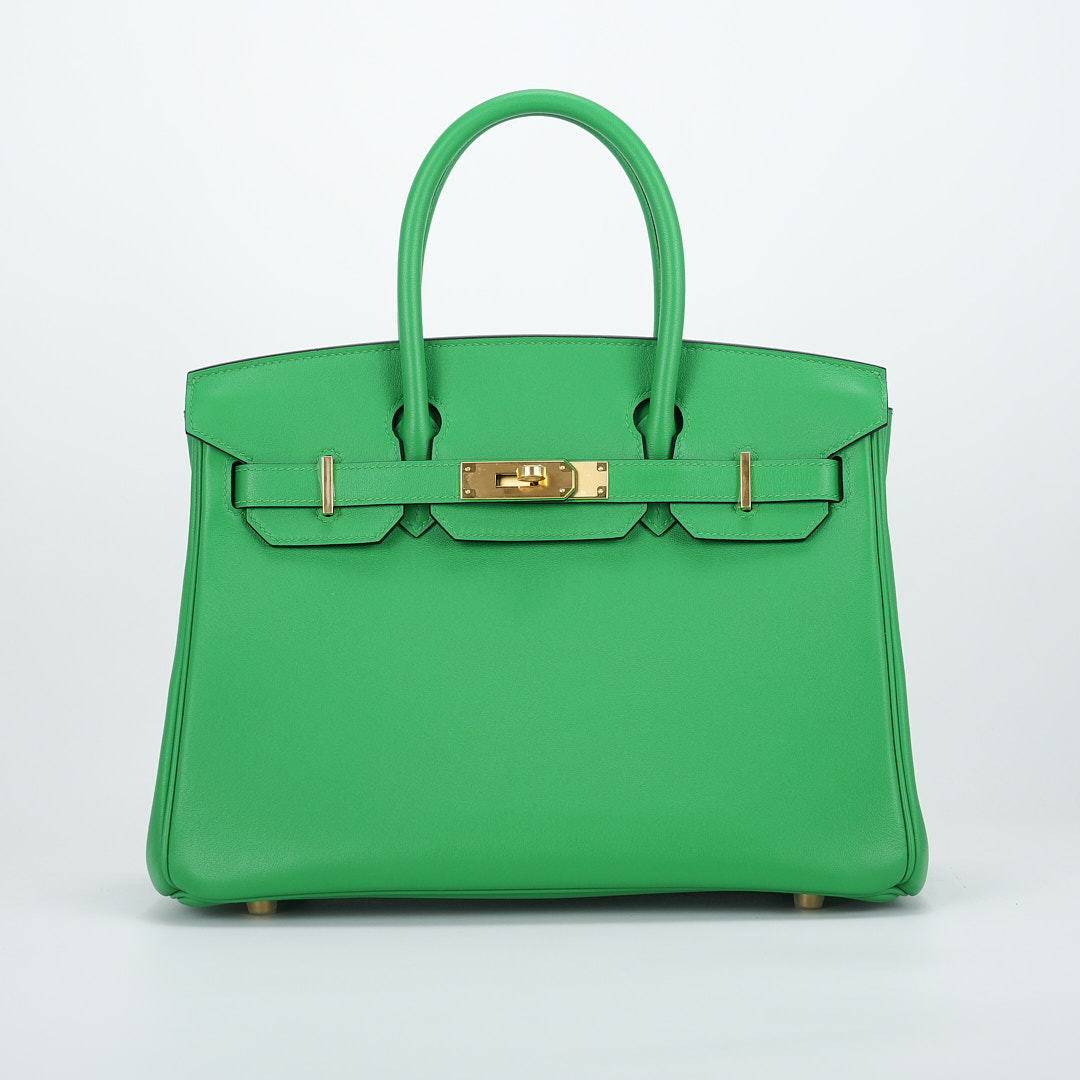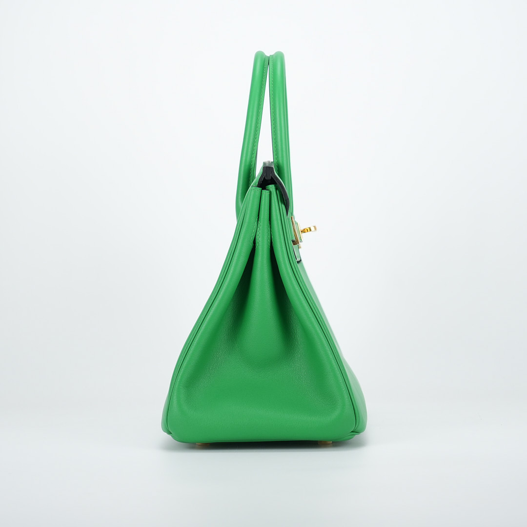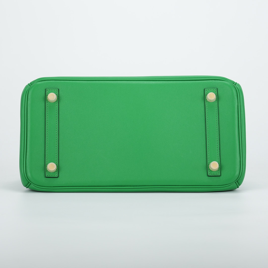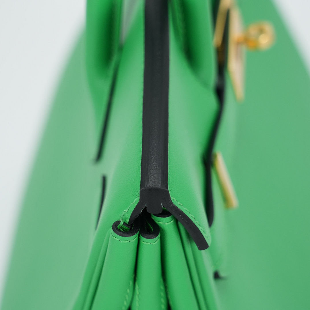 This BK is in Bamboo Swift leather with Gold hardware, has tonal stitching, front flap, two straps with center toggle closure, clochette with lock and two keys, and double rolled handles.