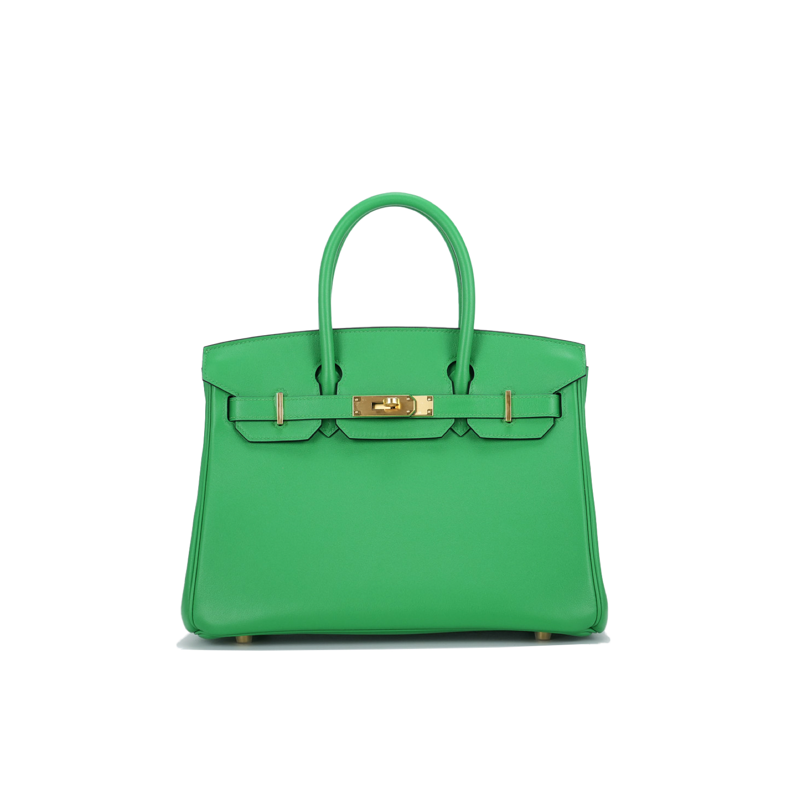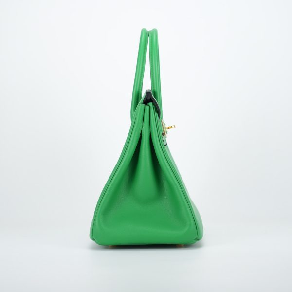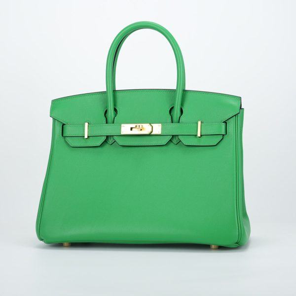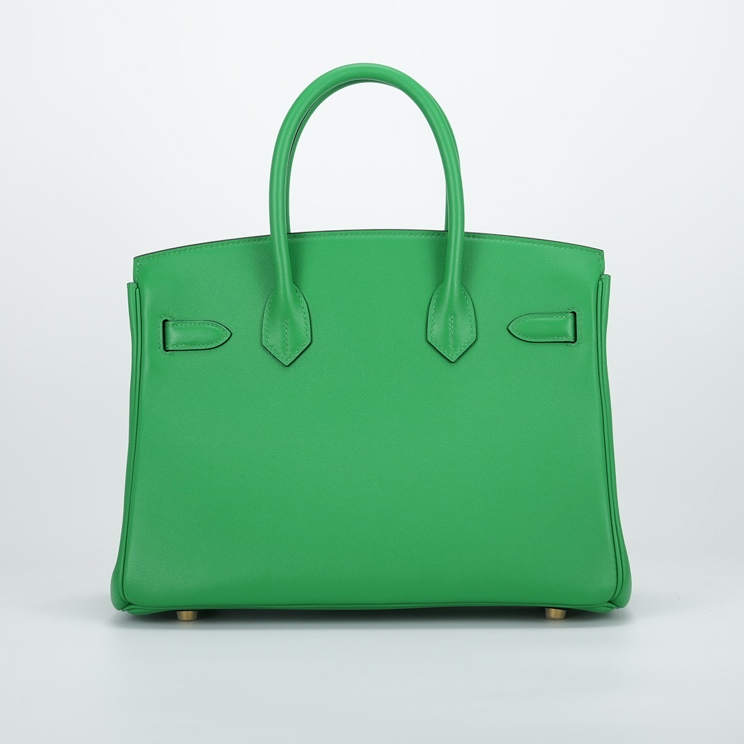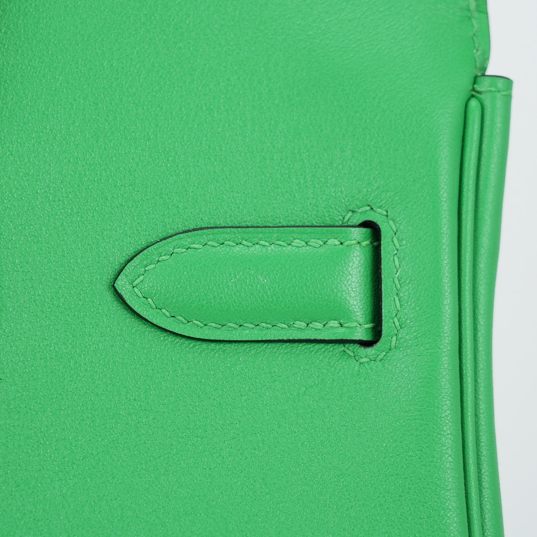 This BK is in Bamboo Swift leather with Gold hardware, has tonal stitching, front flap, two straps with center toggle closure, clochette with lock and two keys, and double rolled handles.
