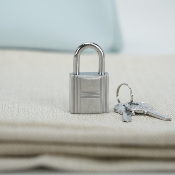 This BK is in Bleu Brume Chèvre leather with Brushed Palladium hardware and Gris Perle Interior, has tonal stitching, front flap, two straps with center toggle closure, clochette with lock and two keys, and double rolled handles.