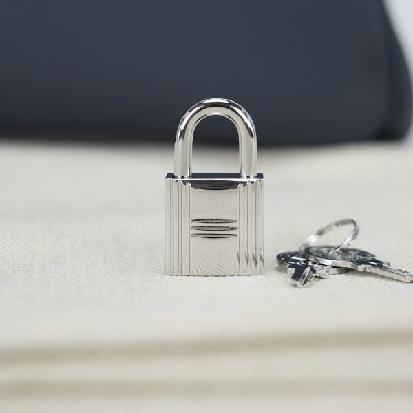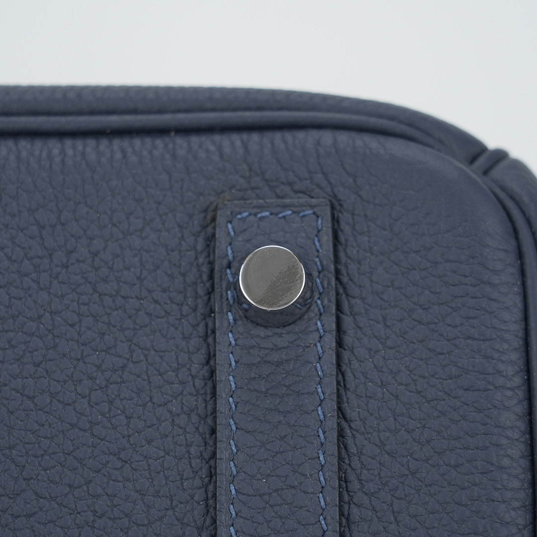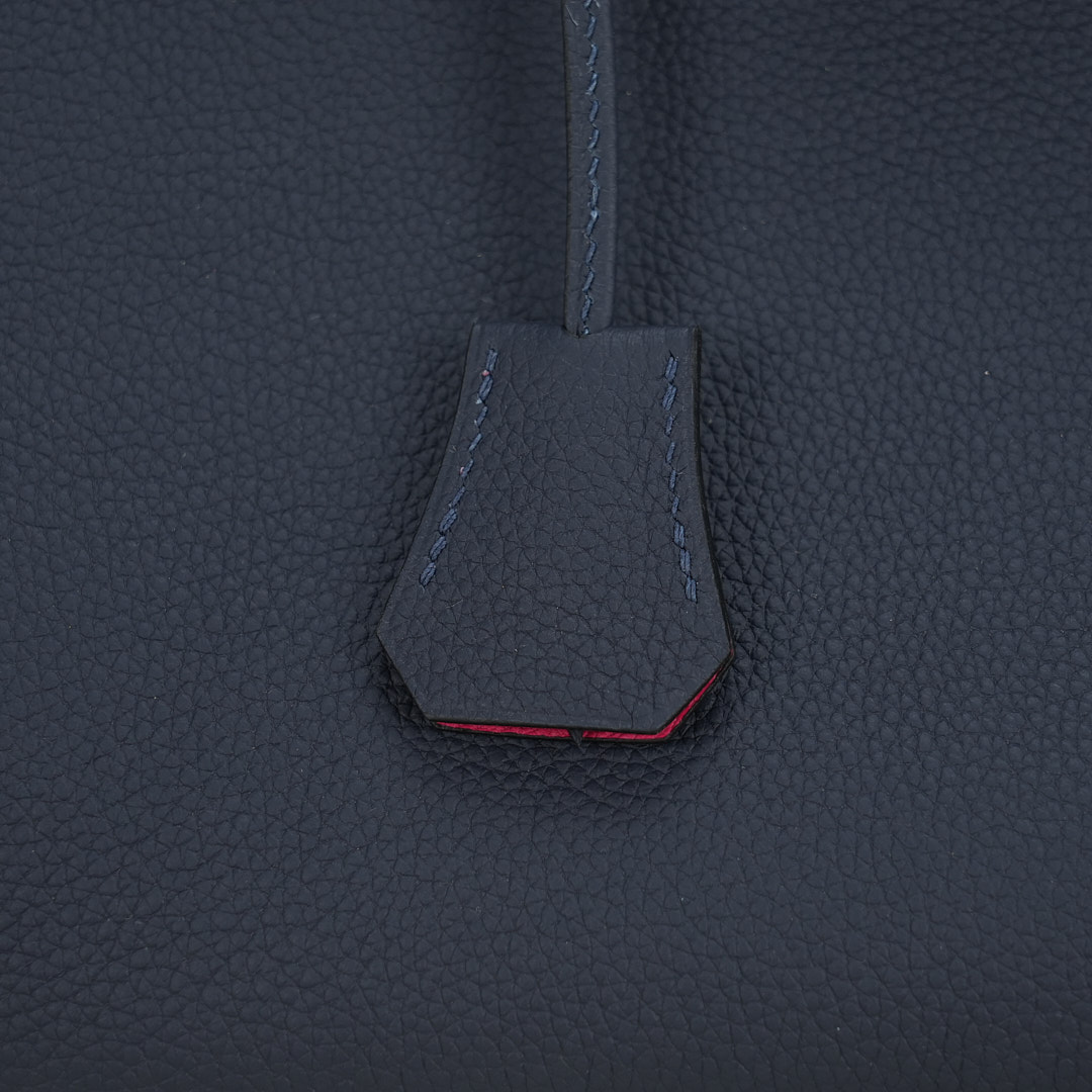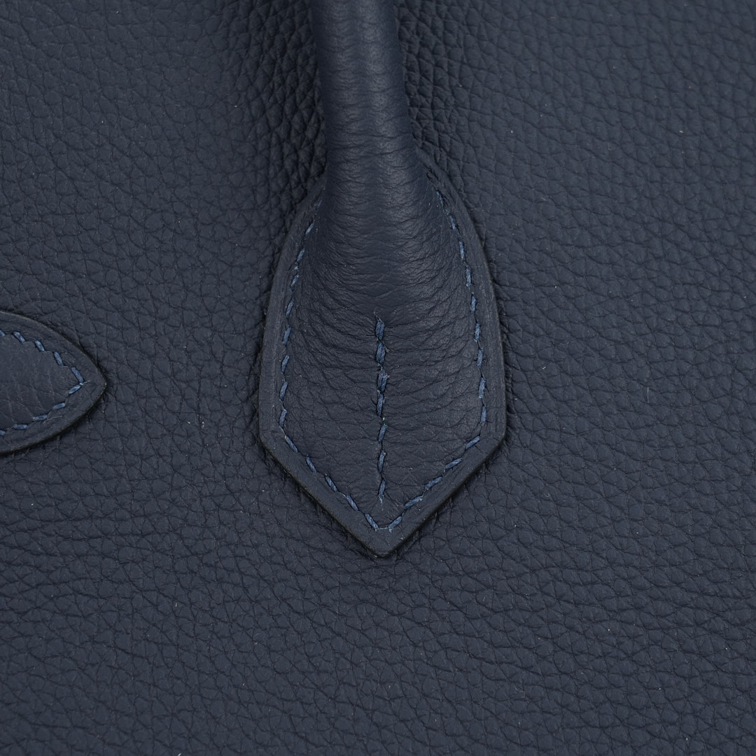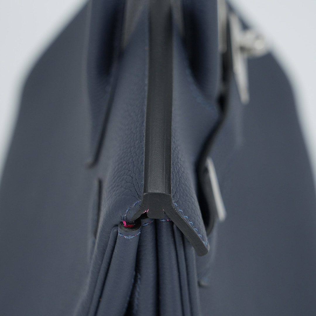 This BK is in Bleu Nuit Togo leather with Palladium hardware and Rose Extreme interior, has tonal stitching, front flap, two straps with center toggle closure, clochette with lock and two keys, and double rolled handles.