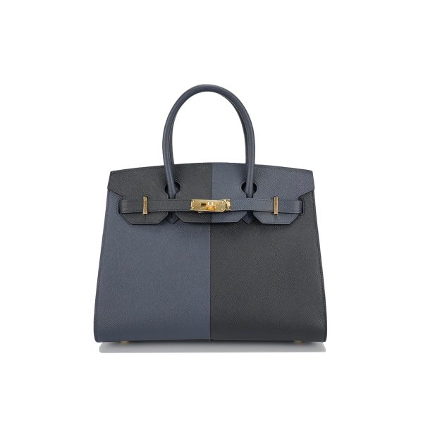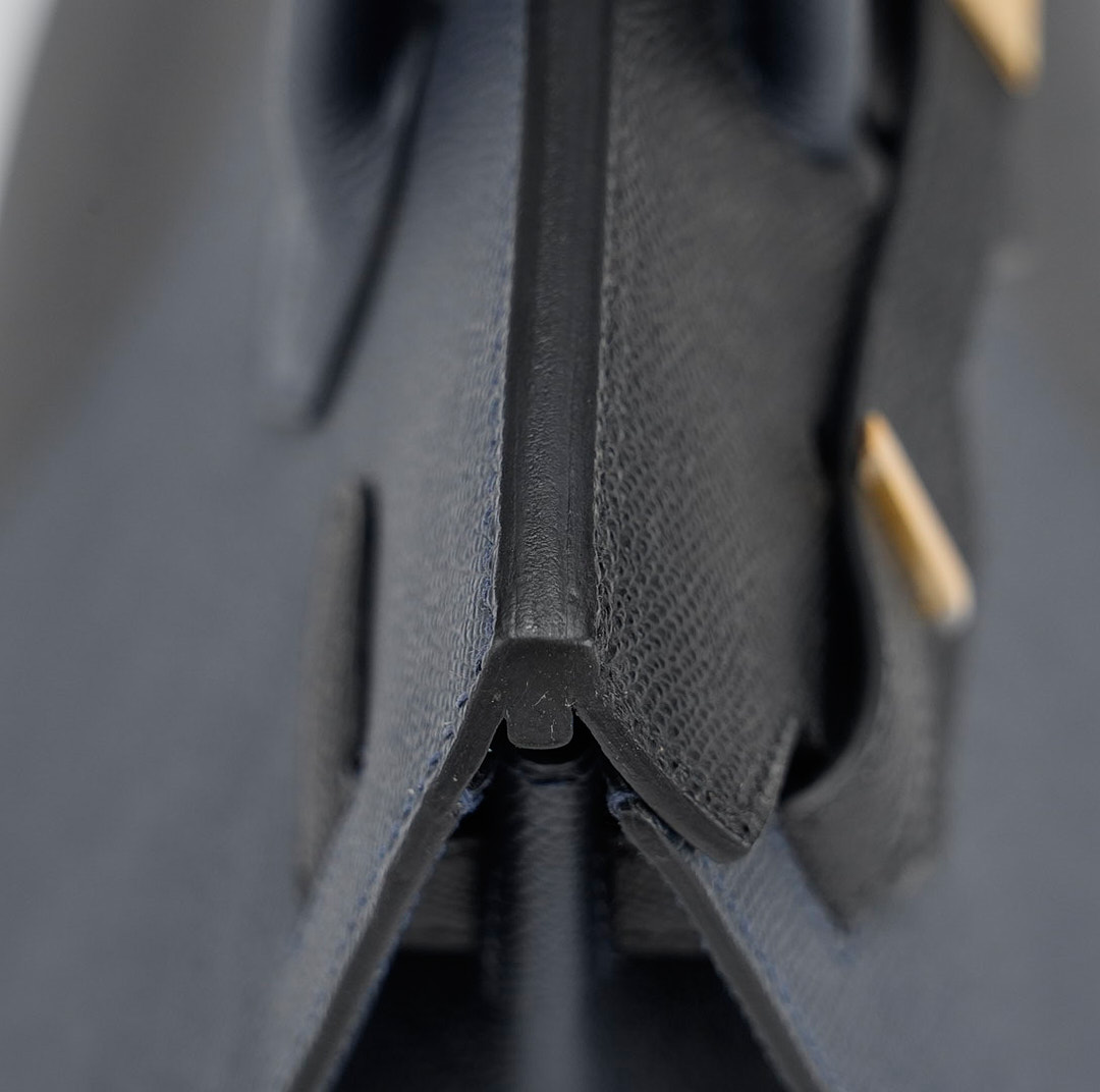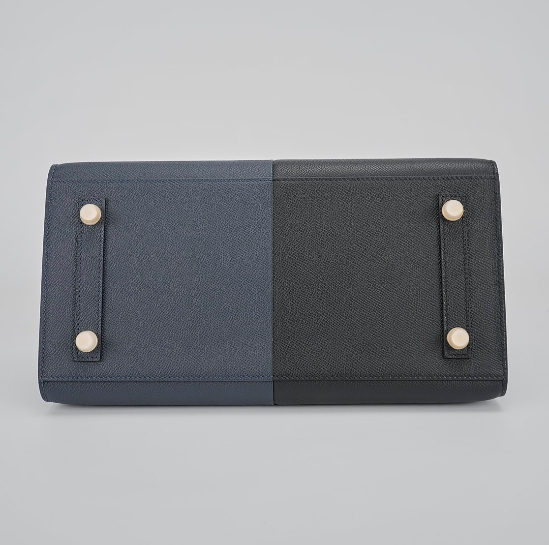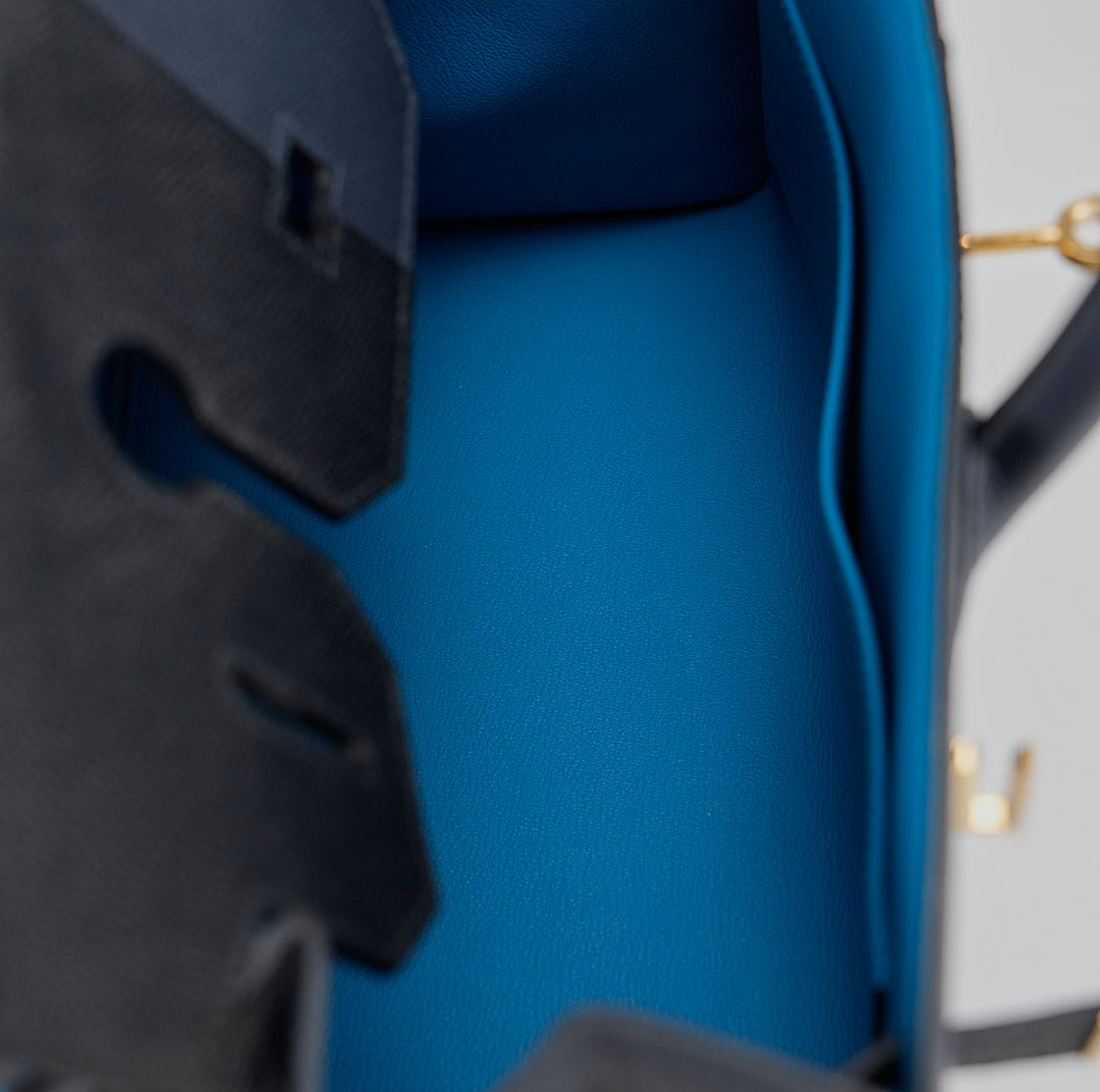 A BK 30, handmade from Epsom leather colored in Black, Bleu Indigo and Bleu Frida. It is enhanced with gold-plated hardware and has a fitted zipped compartment inside to keep your most used cards close at hand.