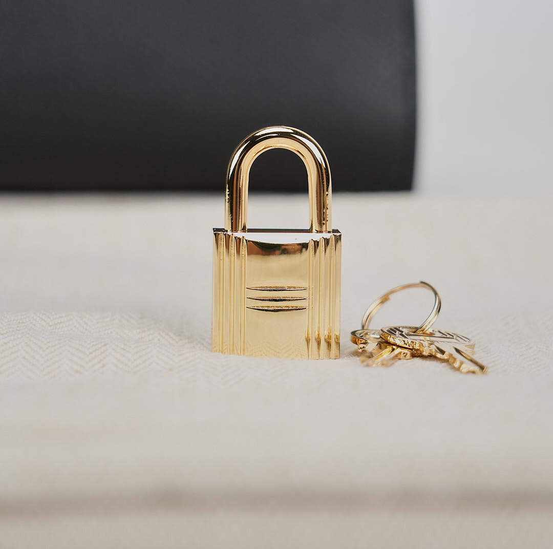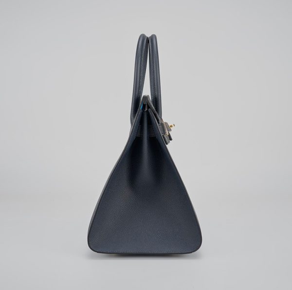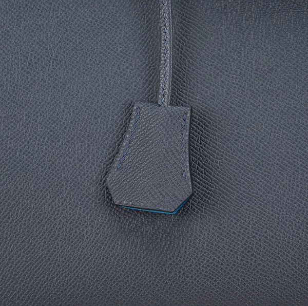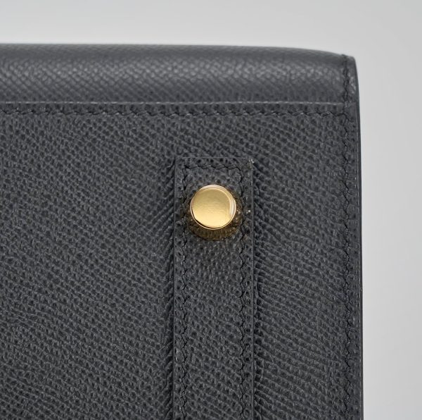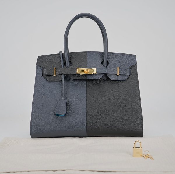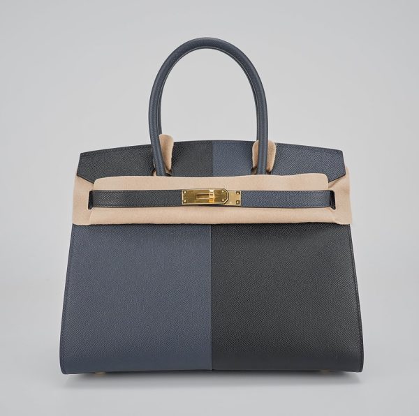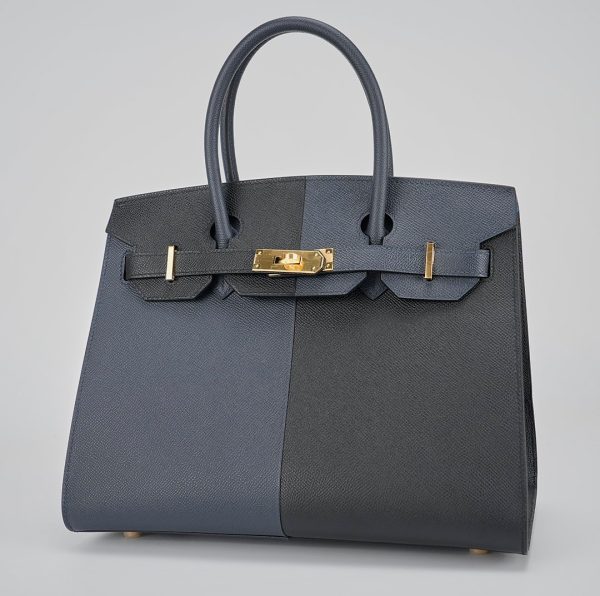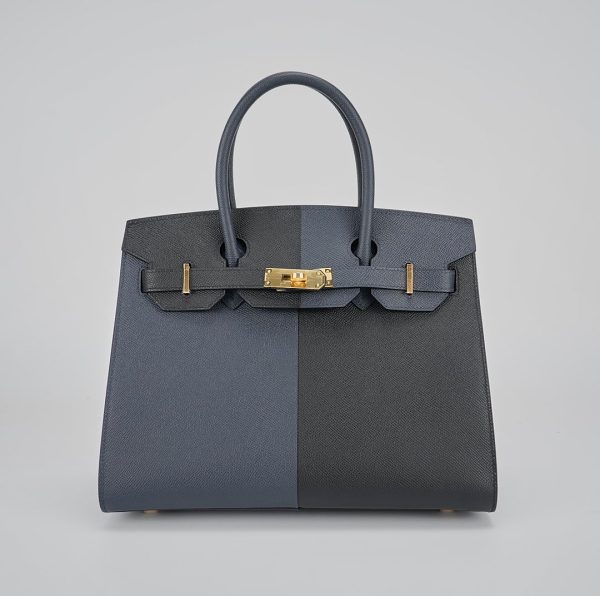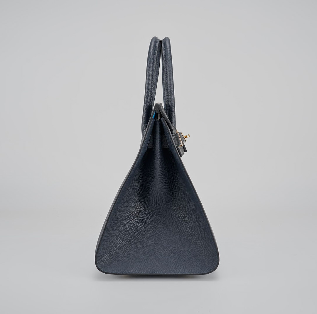 A BK 30, handmade from Epsom leather colored in Black, Bleu Indigo and Bleu Frida. It is enhanced with gold-plated hardware and has a fitted zipped compartment inside to keep your most used cards close at hand.