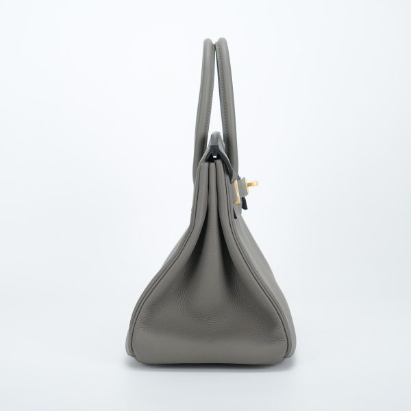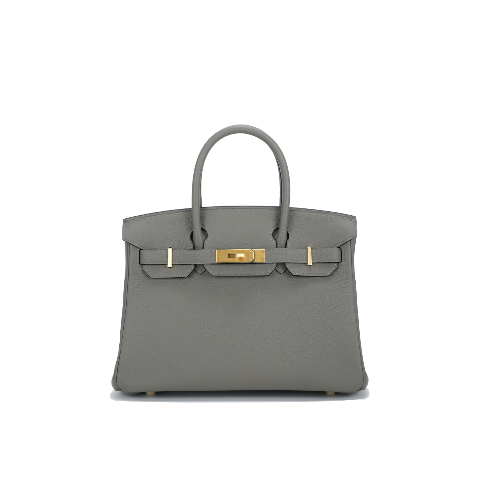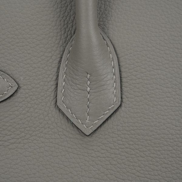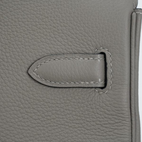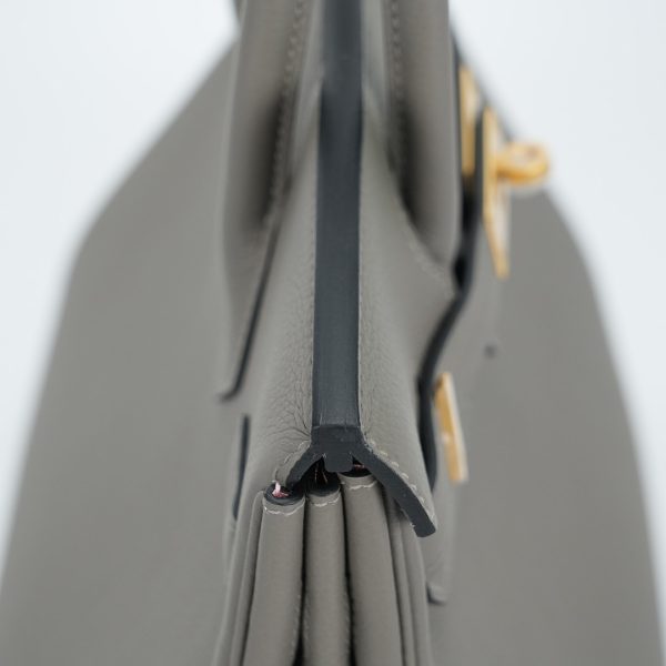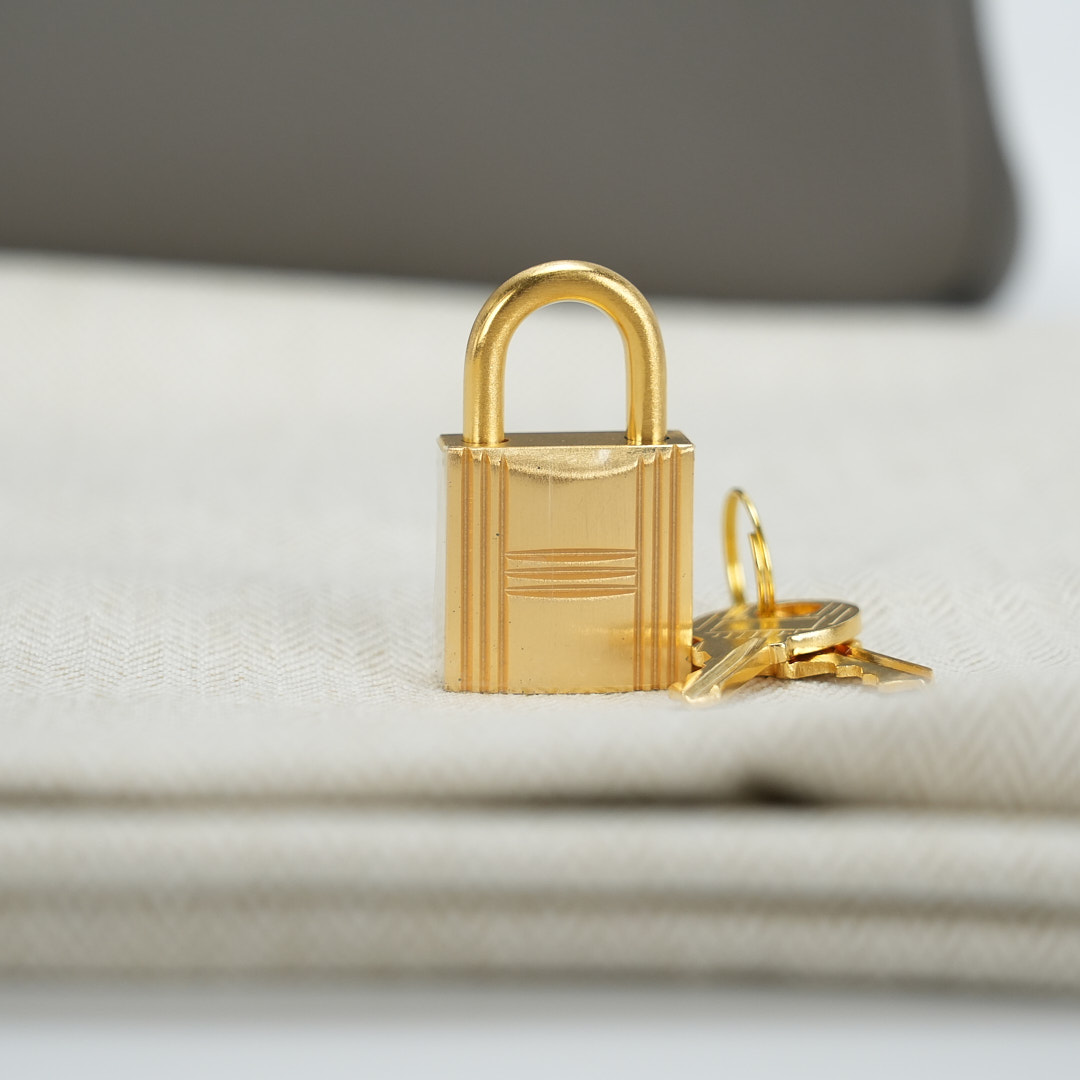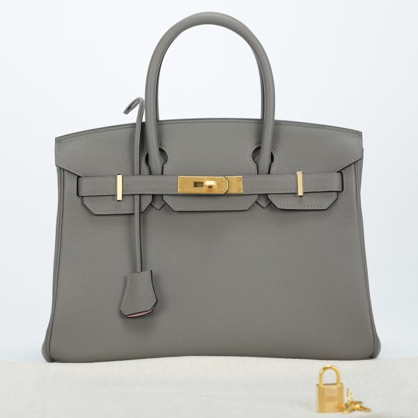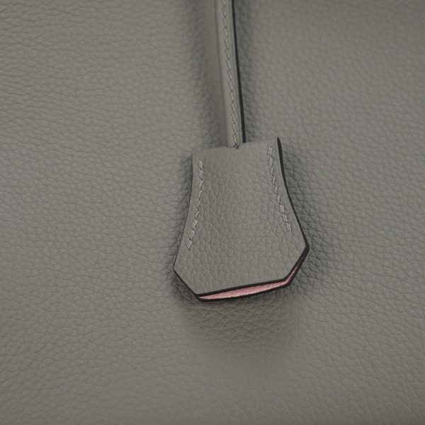 This BK is in Gris Meyer Togo leather with Brushed Gold hardware and Rose Sakura interior, has tonal stitching, front flap, two straps with center toggle closure, clochette with lock and two keys, and double rolled handles.