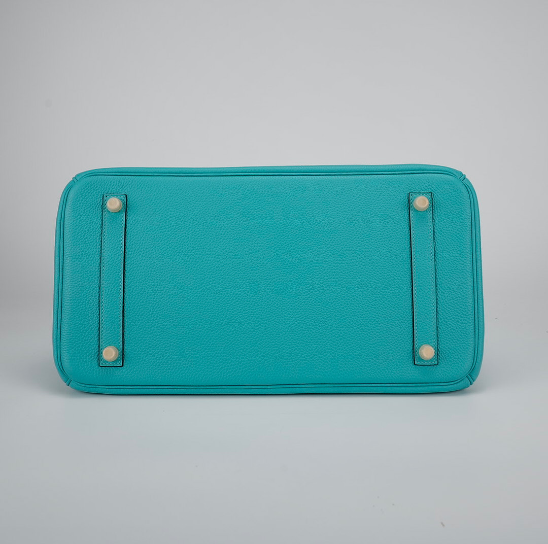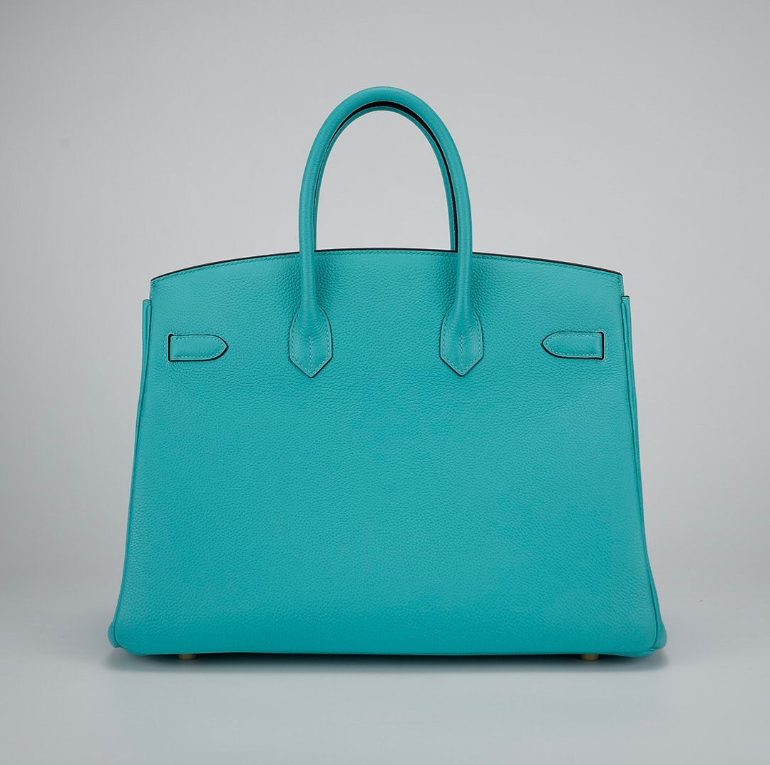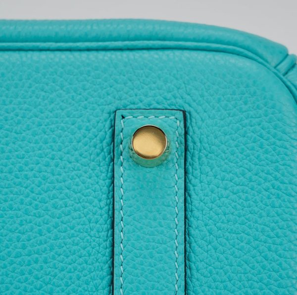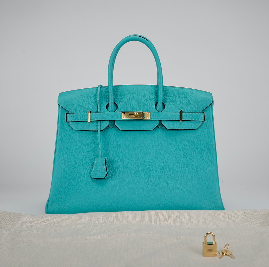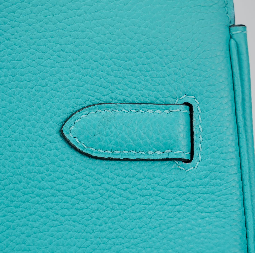 This BK is in Bleu Atoll togo leather with gold hardware and has tonal stitching, two straps with front toggle closure, clochette with lock and two keys and double rolled handles.