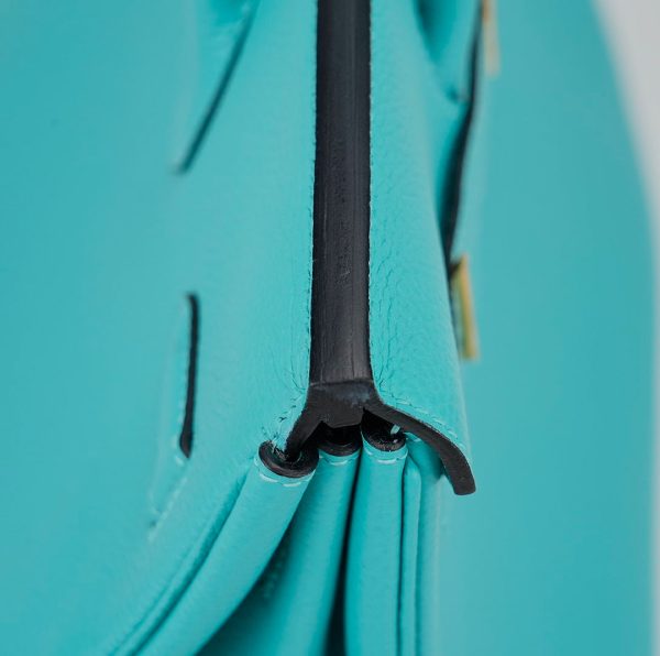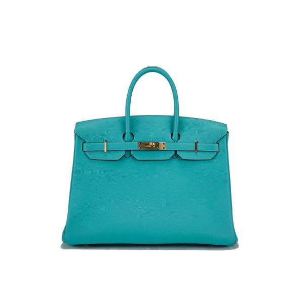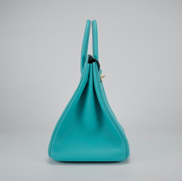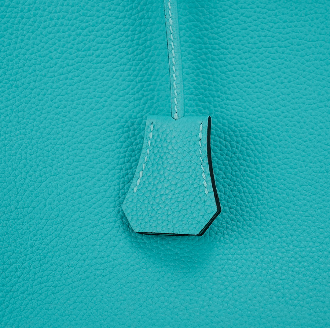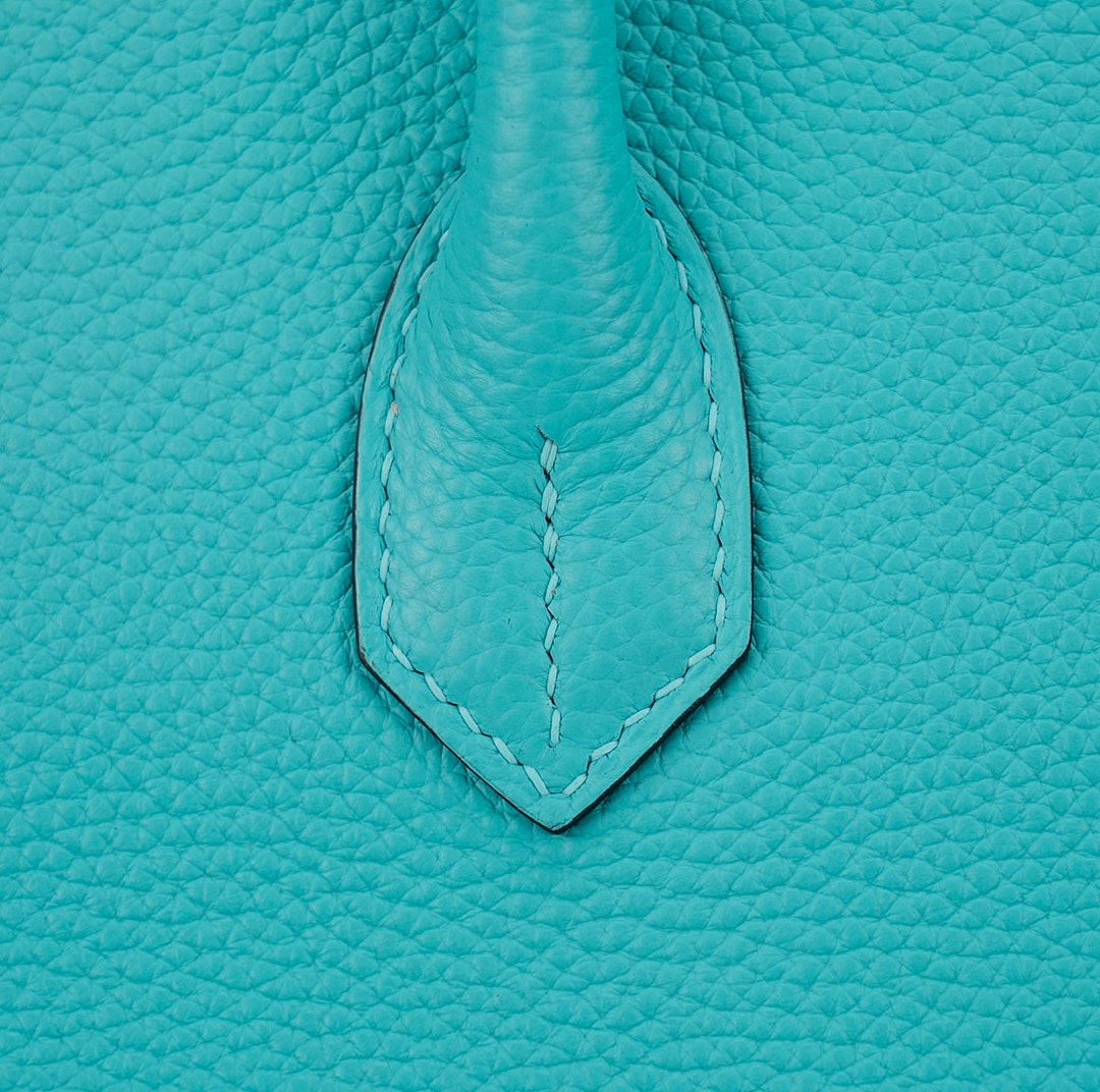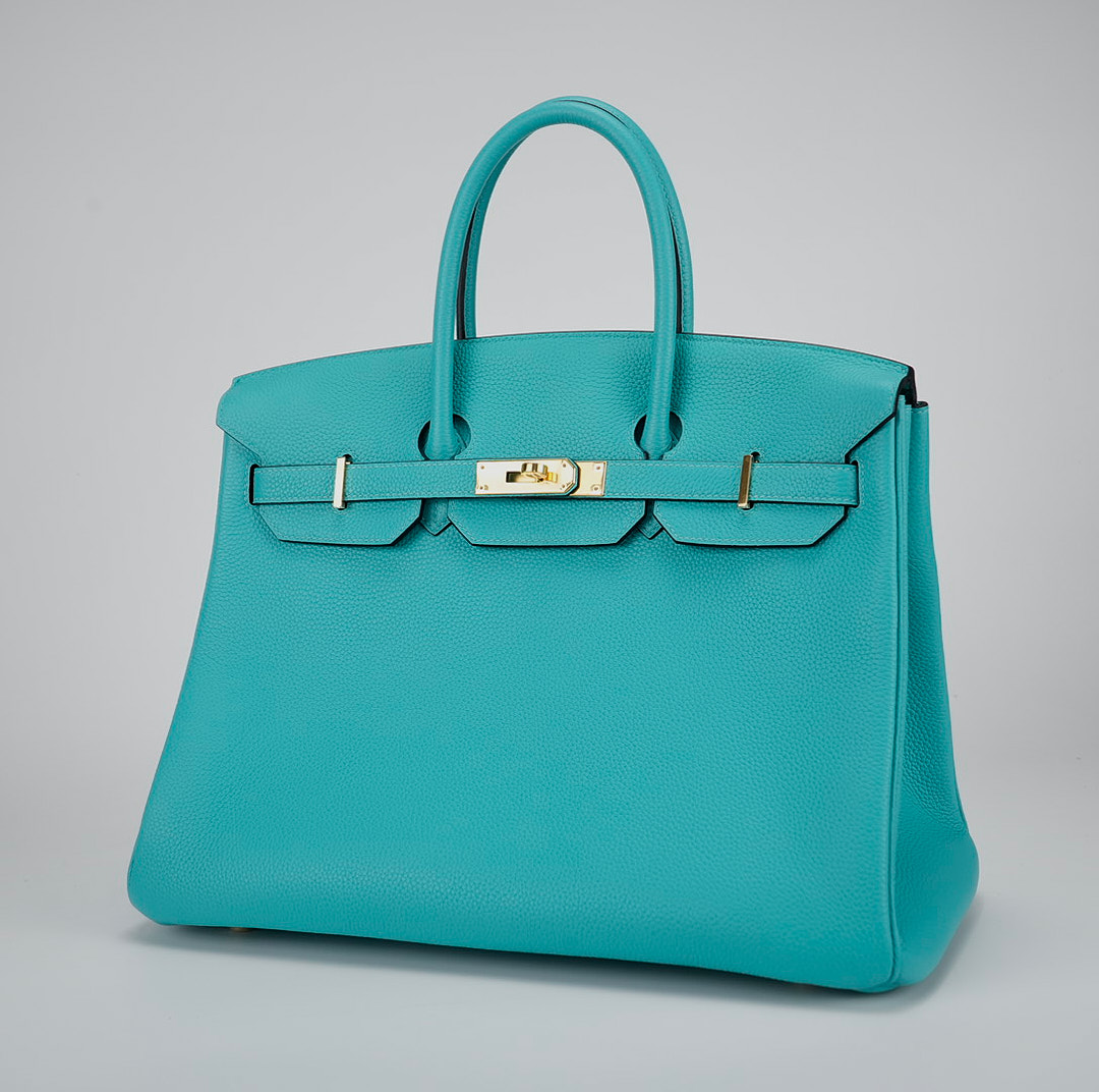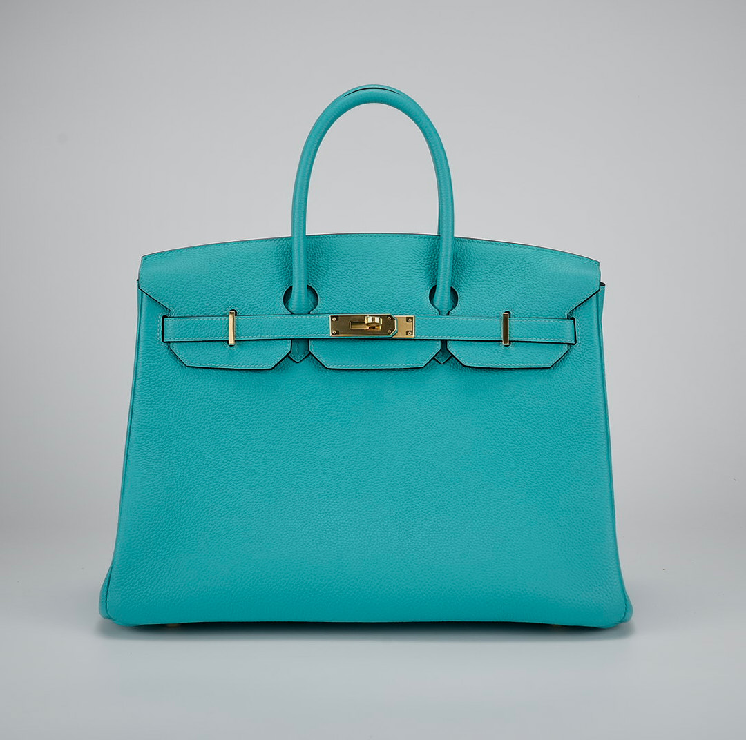 This BK is in Bleu Atoll togo leather with gold hardware and has tonal stitching, two straps with front toggle closure, clochette with lock and two keys and double rolled handles.