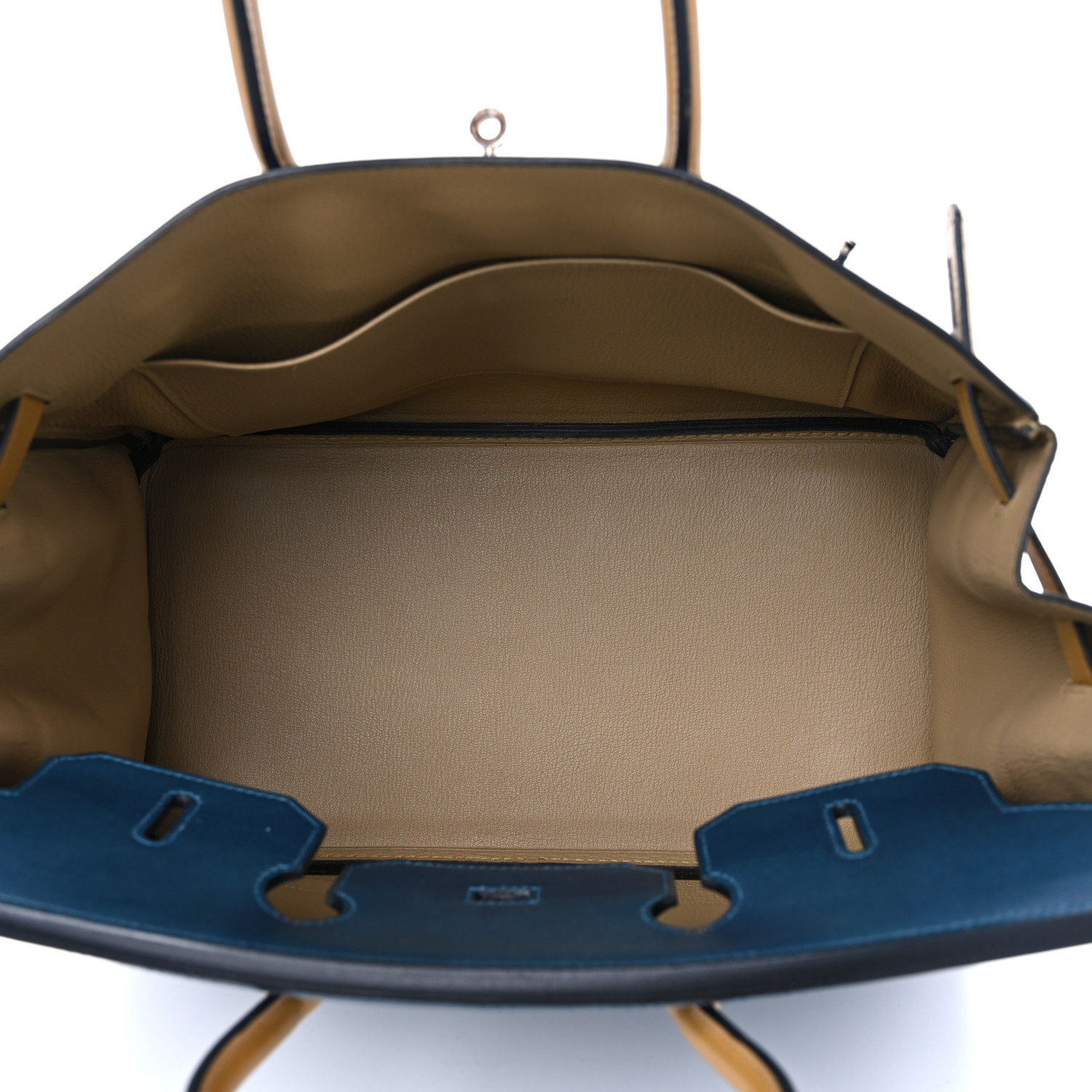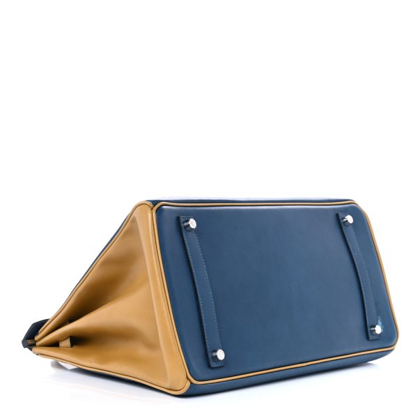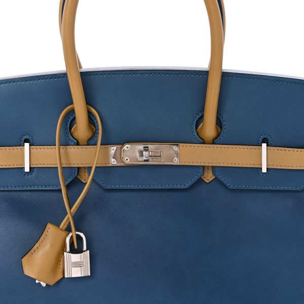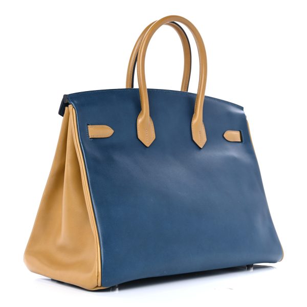 This stylish bag is beautifully crafted of smooth calfskin in blue. The bag features brown rolled leather top handles and sides, a frontal flap and strap closure and textured silver palladium hardware including strap links and a front turn lock. This opens the top flap to a matching chevre goatskin leather interior with zipper and patch pockets.
