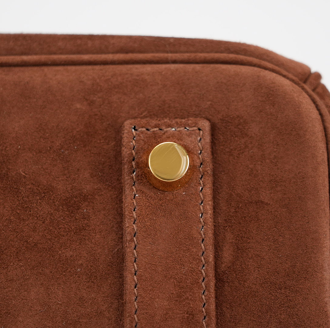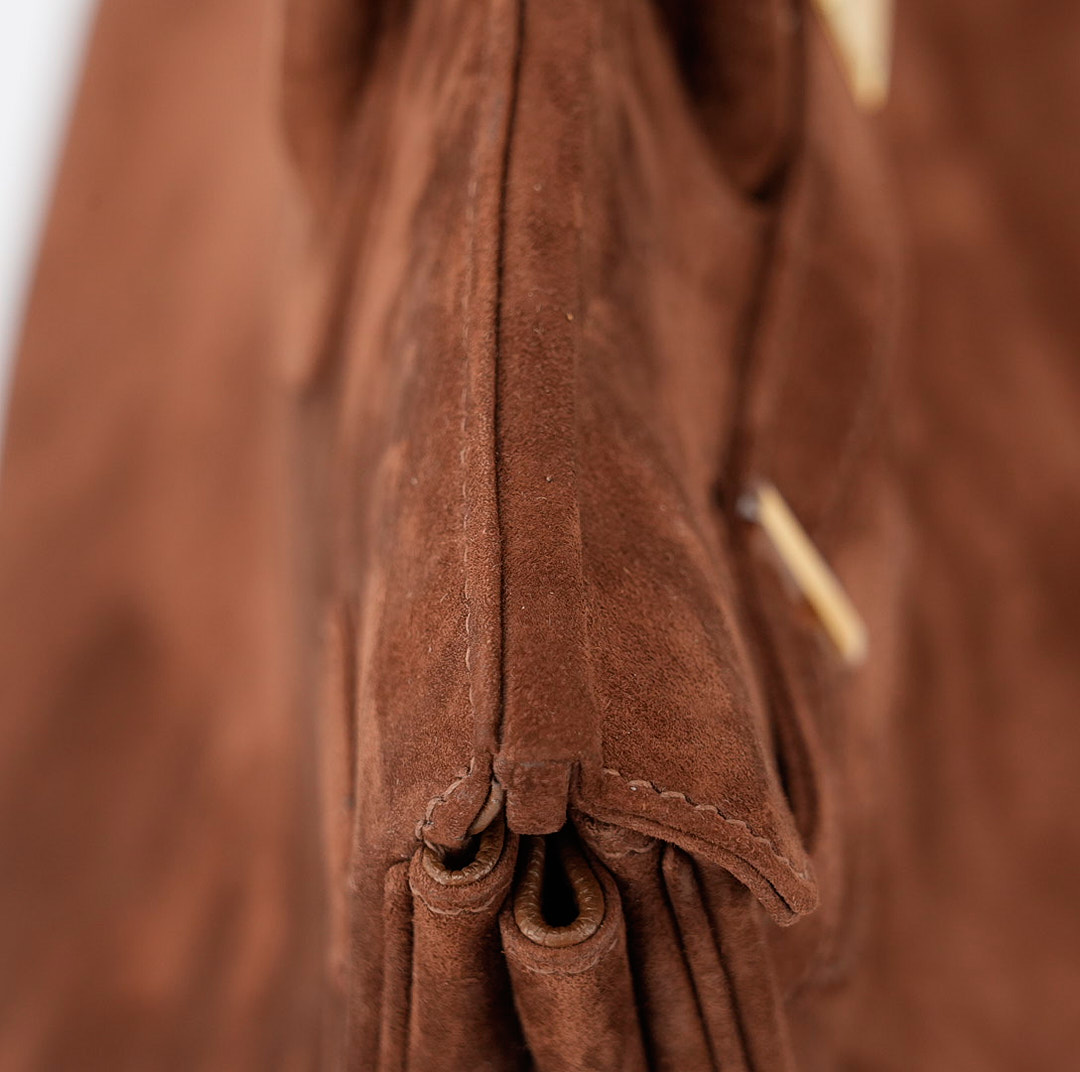 Crafted from rich Chocolate Veau Doblis suede, exudes timeless elegance and refined luxury. The soft and velvety texture of the Doblis suede beautifully complements the warm, gleaming gold hardware, creating a sophisticated yet understated look. The classic BK silhouette, known for its structured shape and versatility, makes this a statement piece that can transition seamlessly from day to night.