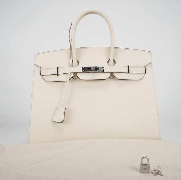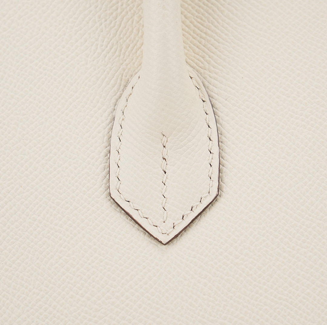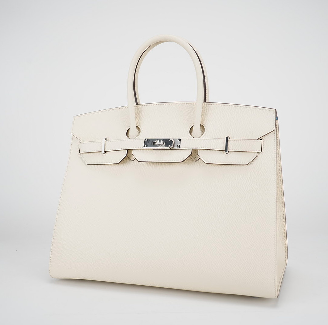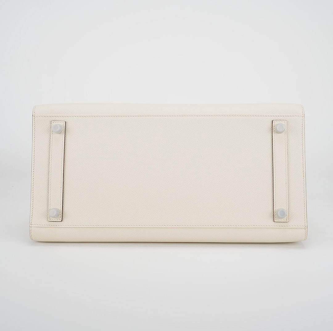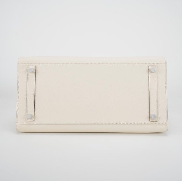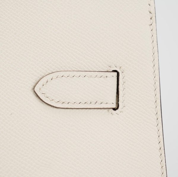This is the Epsom BK 35 in Nata with Blue Paradis interior. This stunning handbag is featured here in subtle Nata This bag also features Palladium hardware found at the straps, lock, and feet. The top flap opens to a matching interior of chevre goatskin leather with zipper and patch pockets.