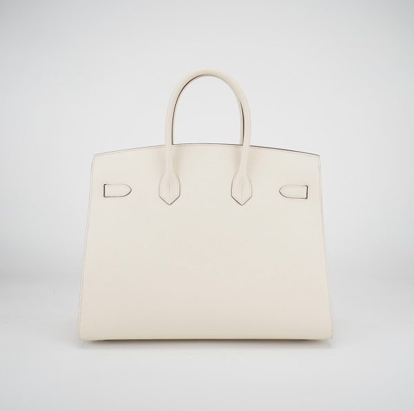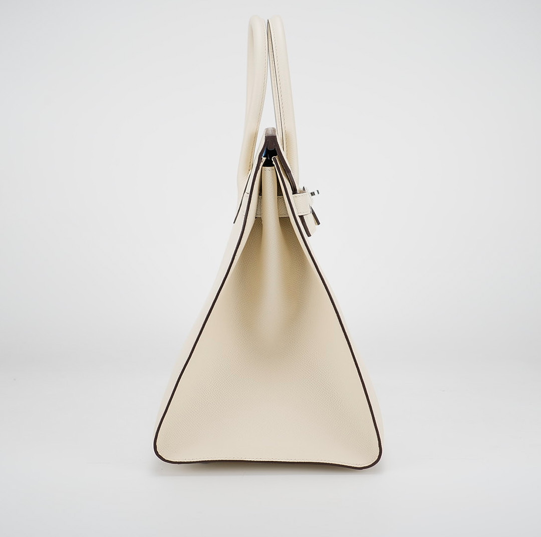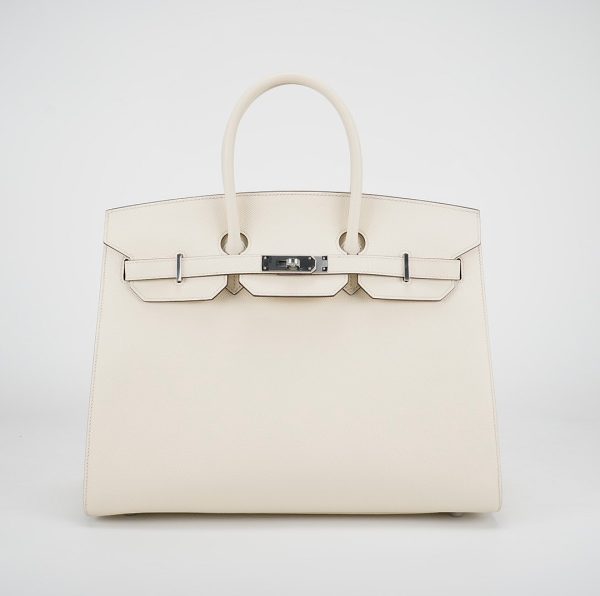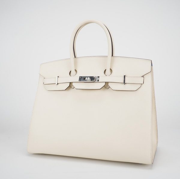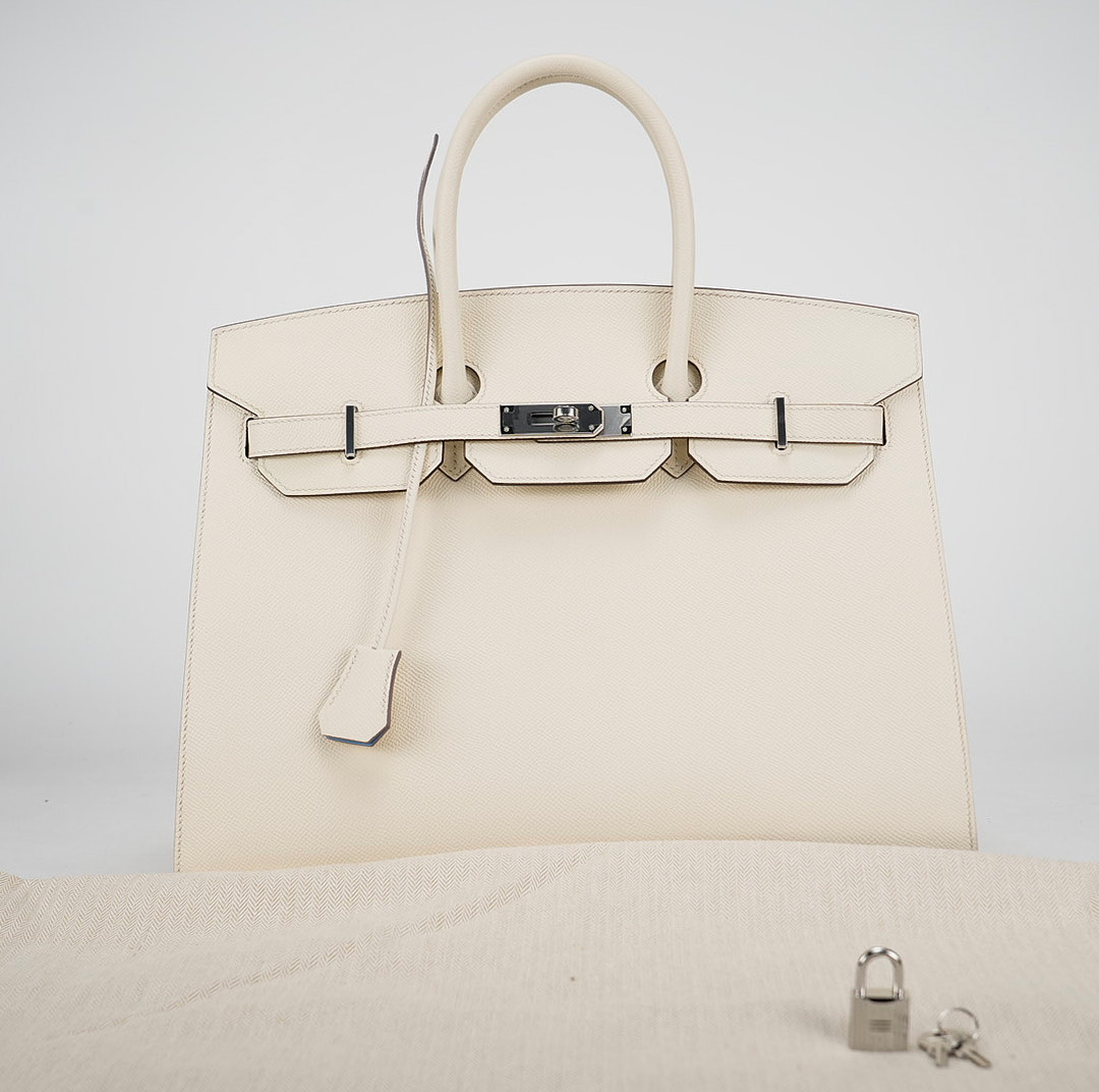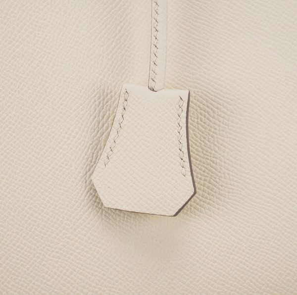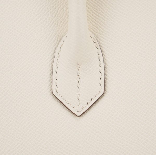 This is the Epsom BK 35 in Nata with Blue Paradis interior. This stunning handbag is featured here in subtle Nata This bag also features Palladium hardware found at the straps, lock, and feet. The top flap opens to a matching interior of chevre goatskin leather with zipper and patch pockets.