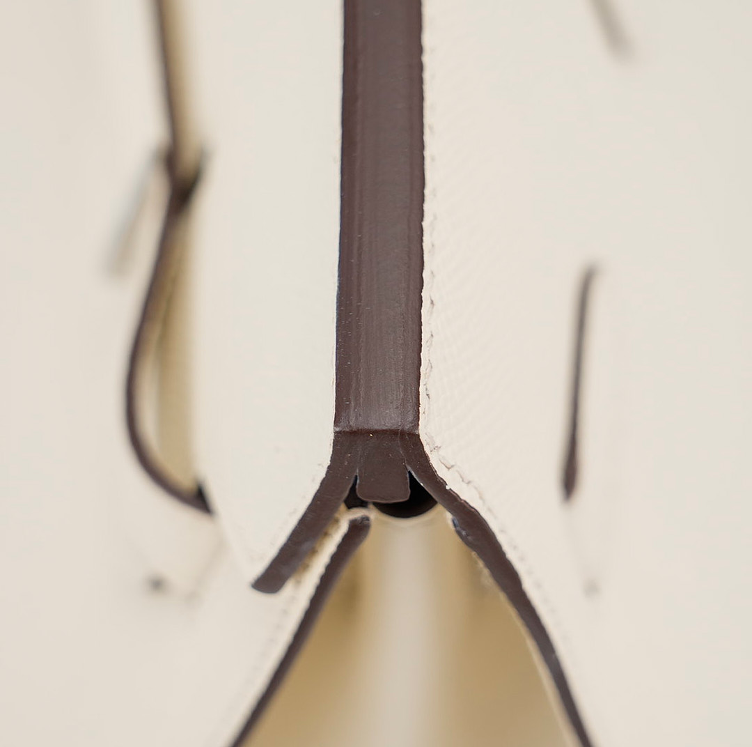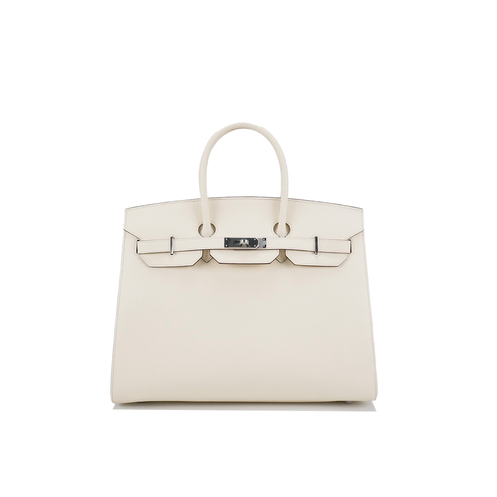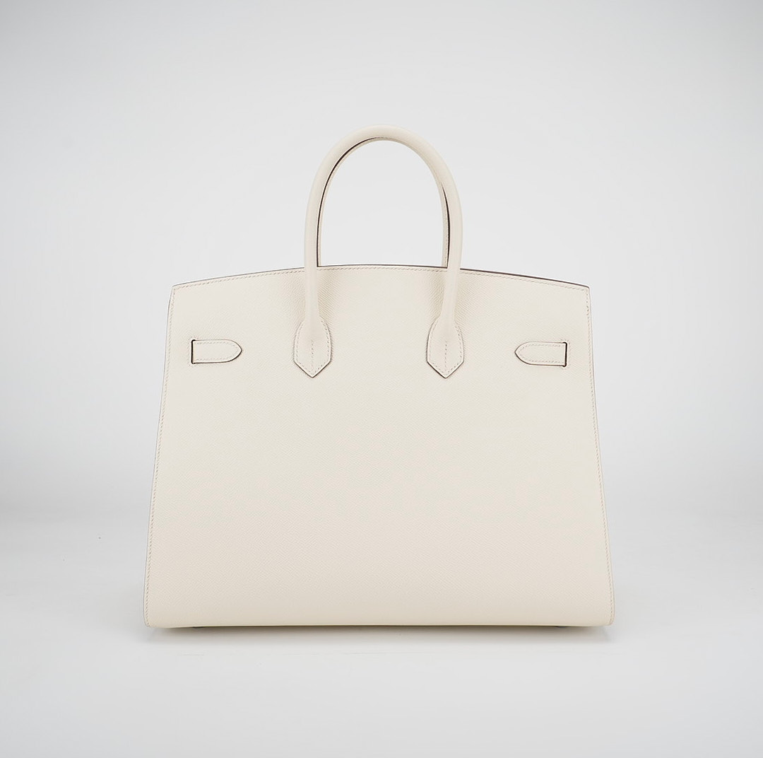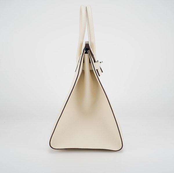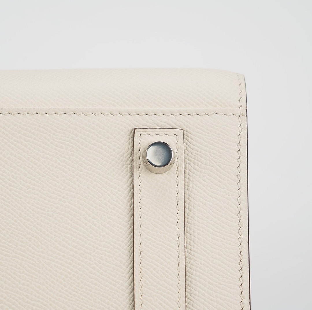This is the Epsom BK 35 in Nata with Blue Paradis interior. This stunning handbag is featured here in subtle Nata This bag also features Palladium hardware found at the straps, lock, and feet. The top flap opens to a matching interior of chevre goatskin leather with zipper and patch pockets.