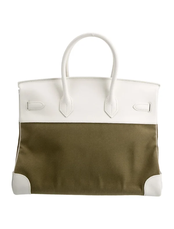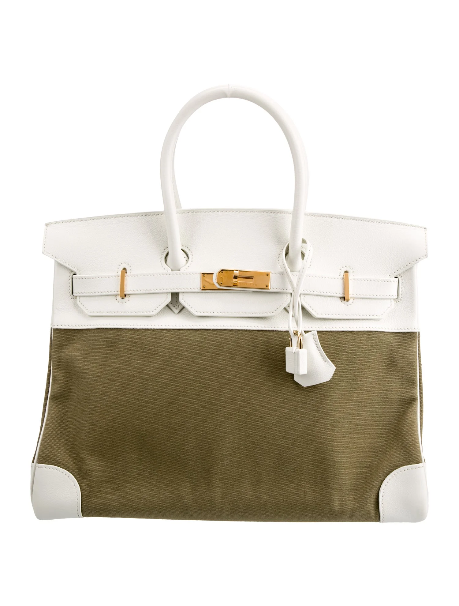 This is the Togo BK 35 in White and Military Green. This stunning handbag is featured here in olive green. This bag also features Gold hardware found at the straps, lock, and feet. The top flap opens to a matching interior of chevre goatskin leather with zipper and patch pockets.