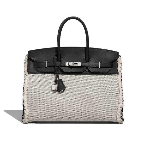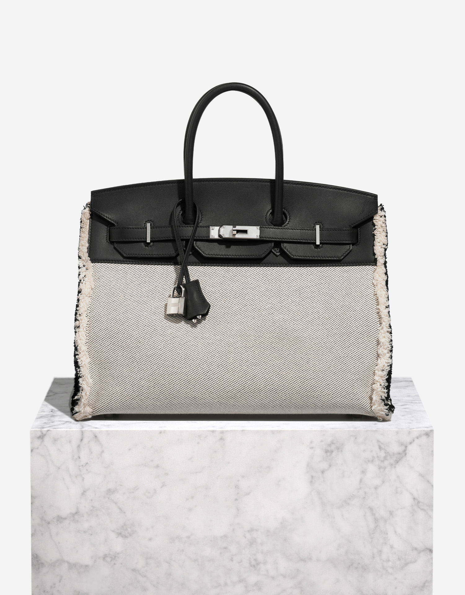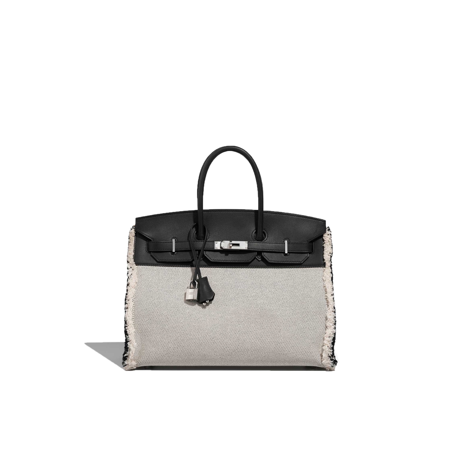 A collectible BK 35 in the shades of Black and Ecru. This BK Fray Fray takes its name from the mini-fringing effect around the edges, adding a unique touch to this design. Handcrafted from Toile and Swift leather, it is topped with palladium hardware.