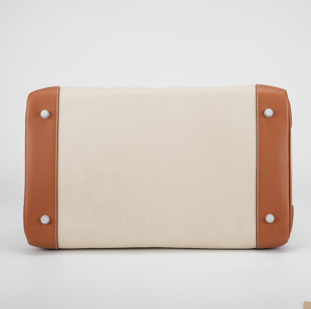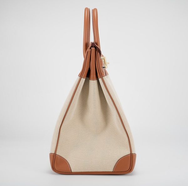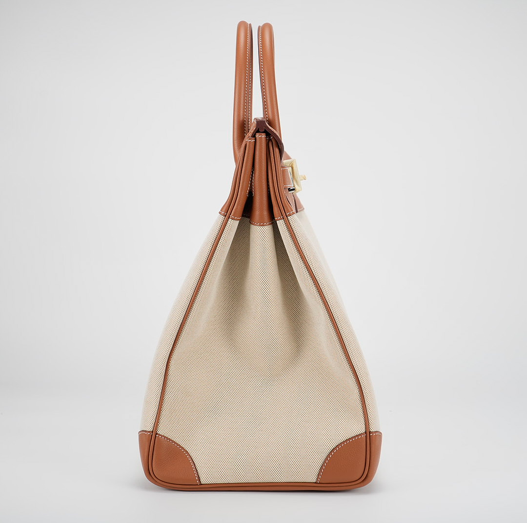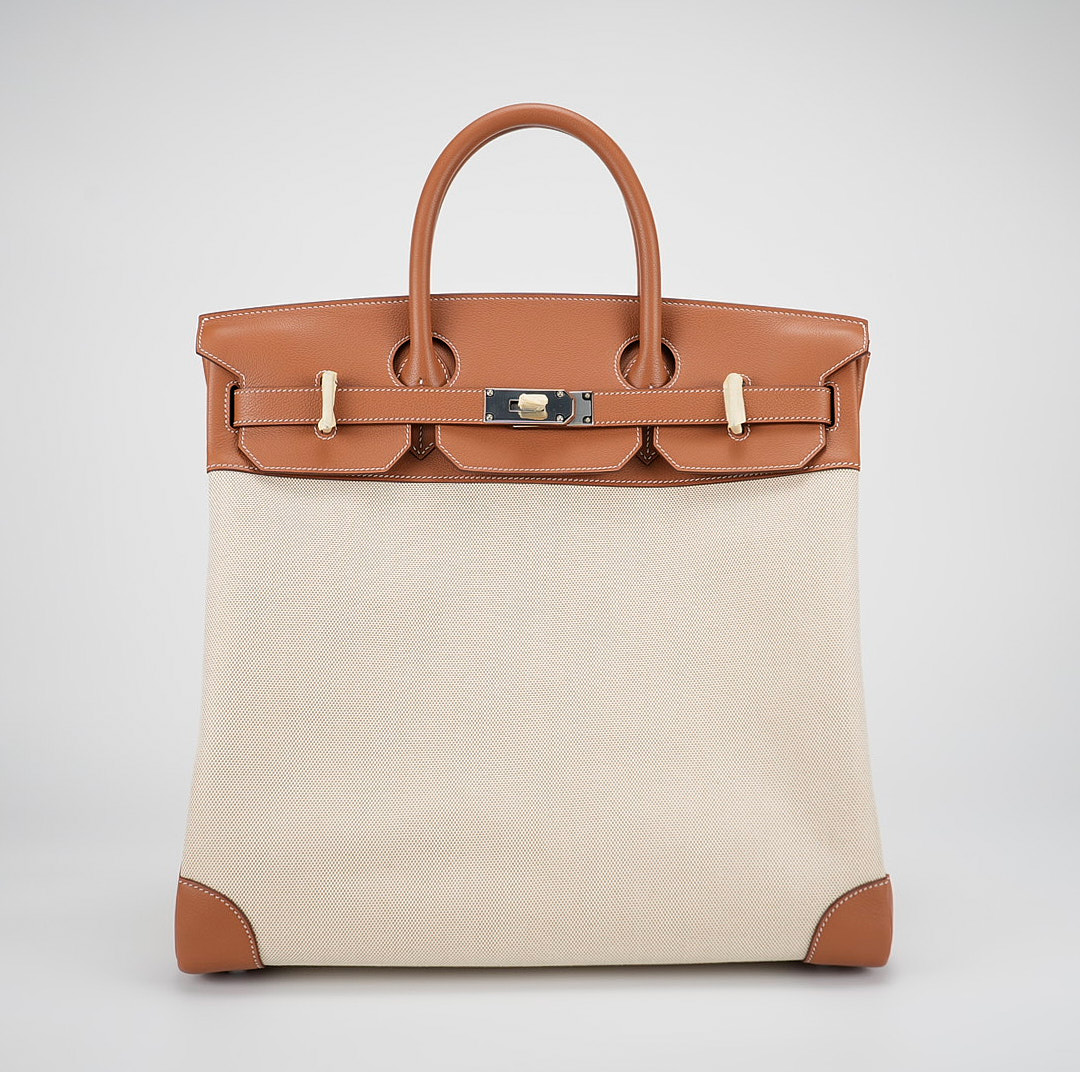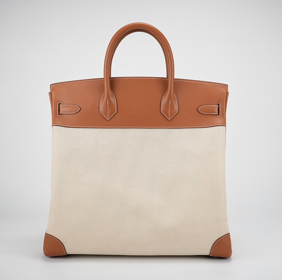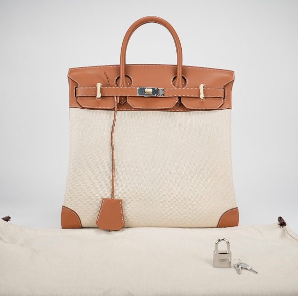 This HAC BK is in Gold evercolor leather and Ecru toile canvas with palladium hardware and has contrast stitching, two straps with HAC toggle closure, clochette with lock and keys and double rolled handles.