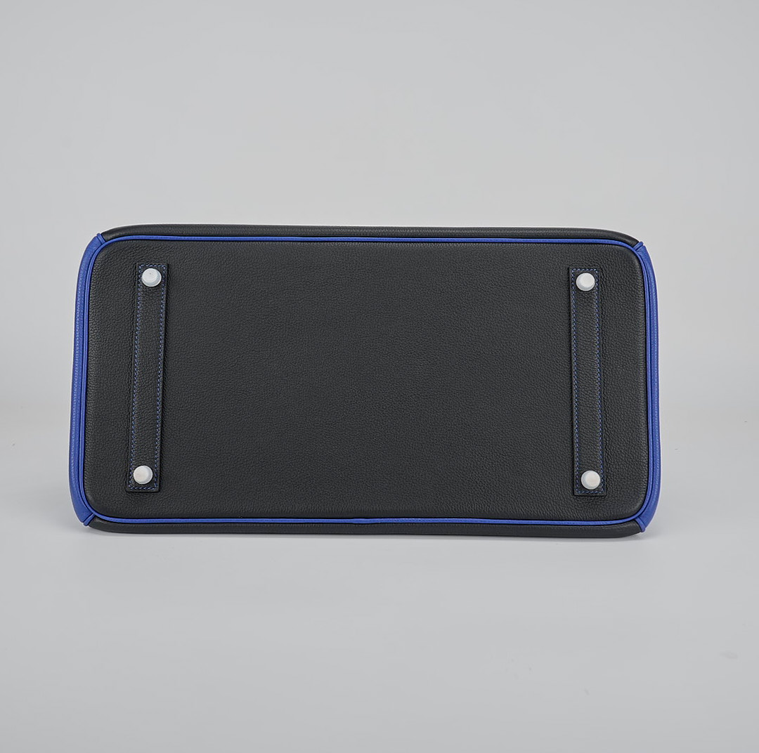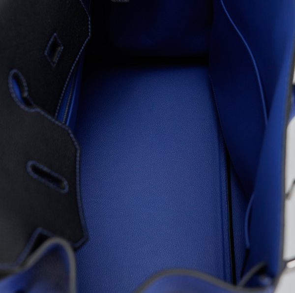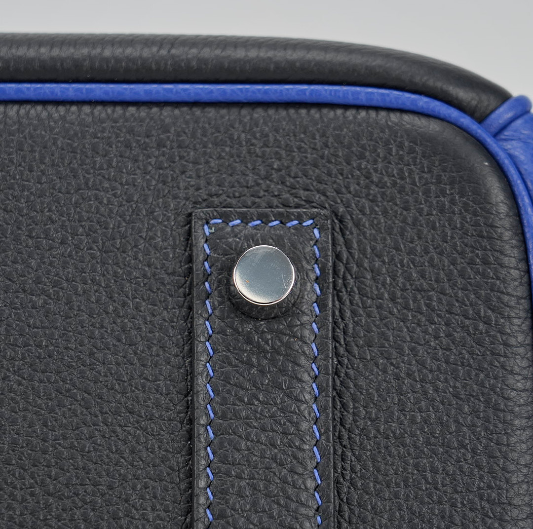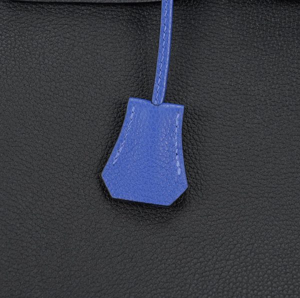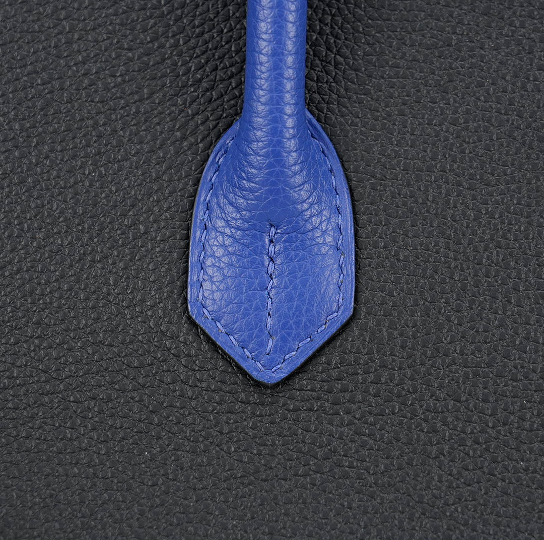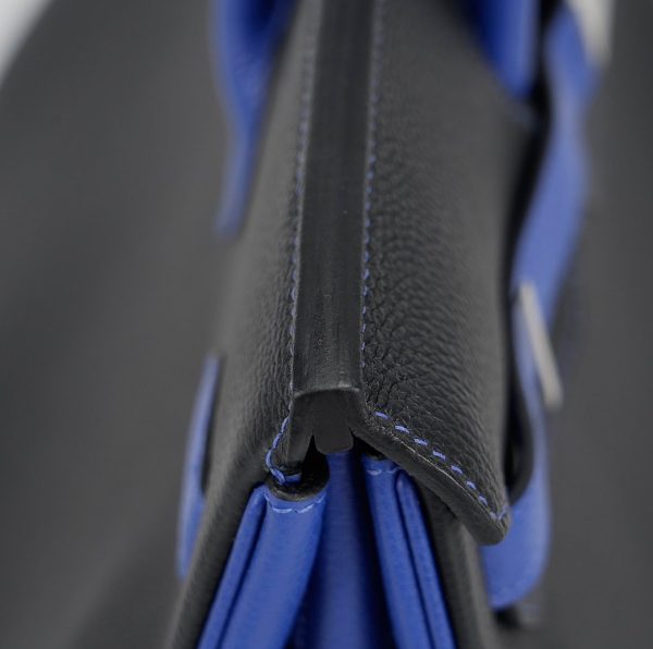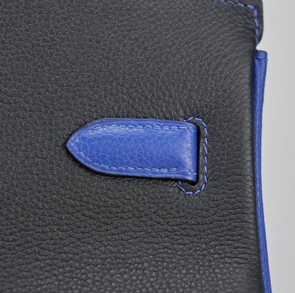 This BK 40 has been handcrafted from Togo leather in Black and Bleu Electrique with Bleu Electrique interior . The turn-lock opens to give you enough room for your daily essentials, with a zipped compartment to keep your phone and keys safe.