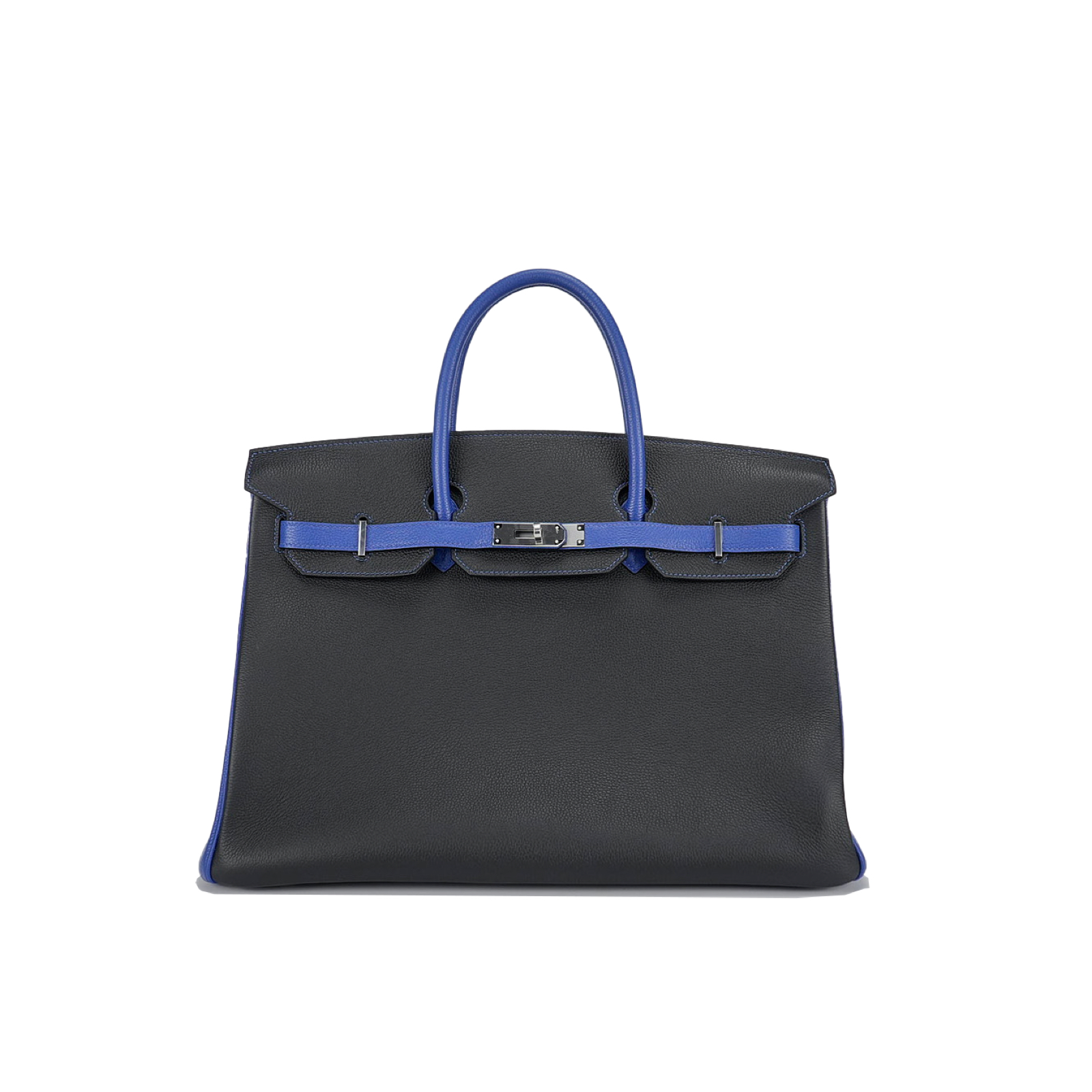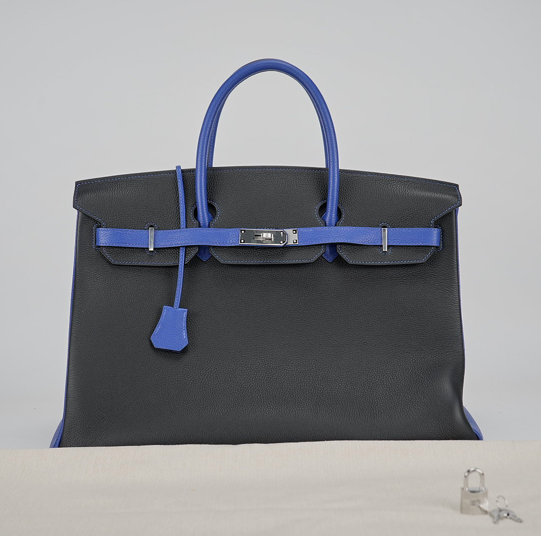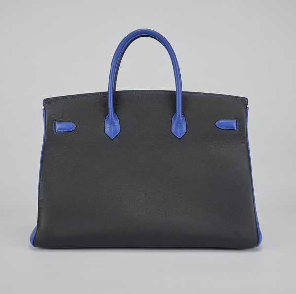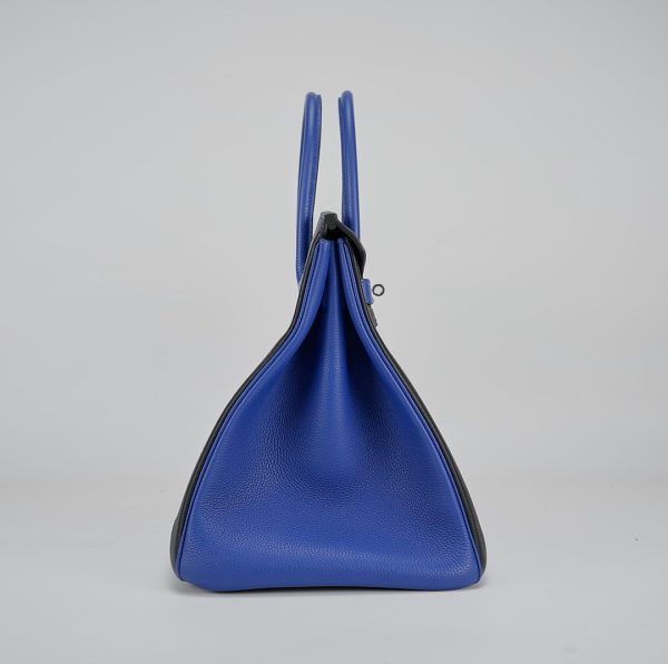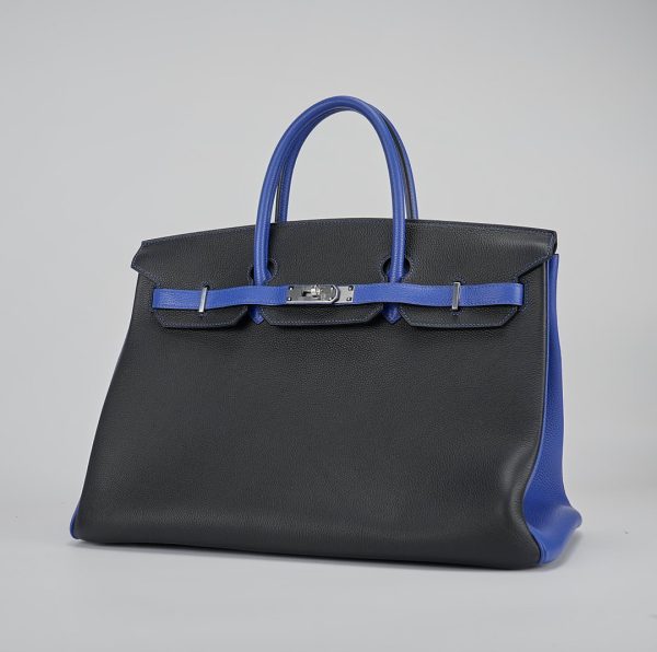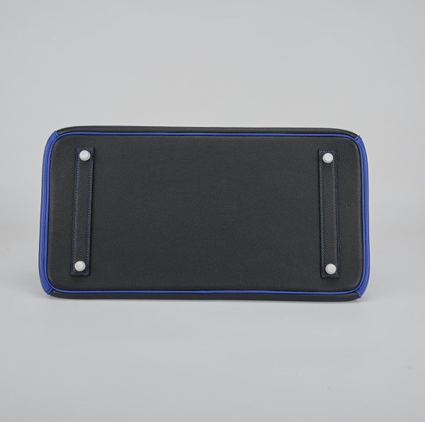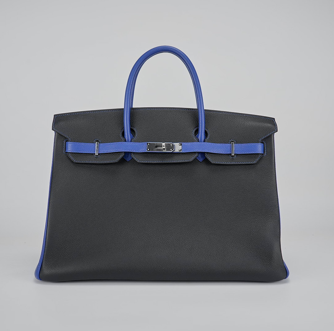 This BK 40 has been handcrafted from Togo leather in Black and Bleu Electrique with Bleu Electrique interior . The turn-lock opens to give you enough room for your daily essentials, with a zipped compartment to keep your phone and keys safe.