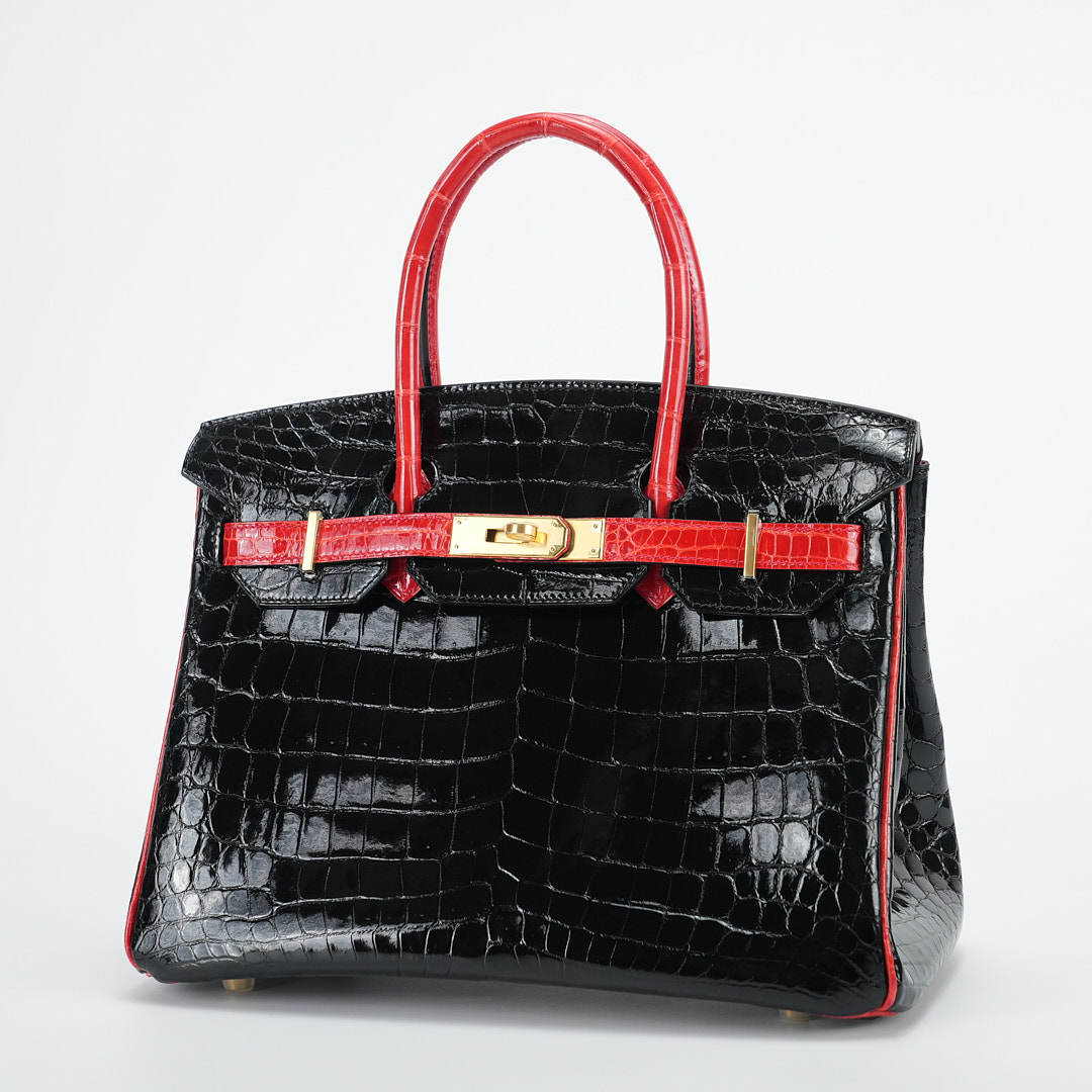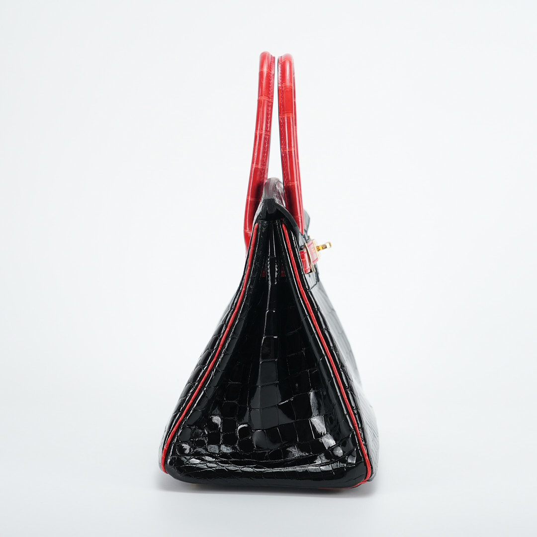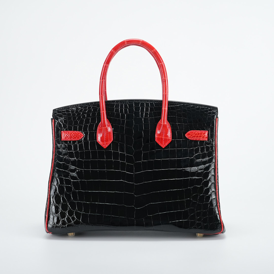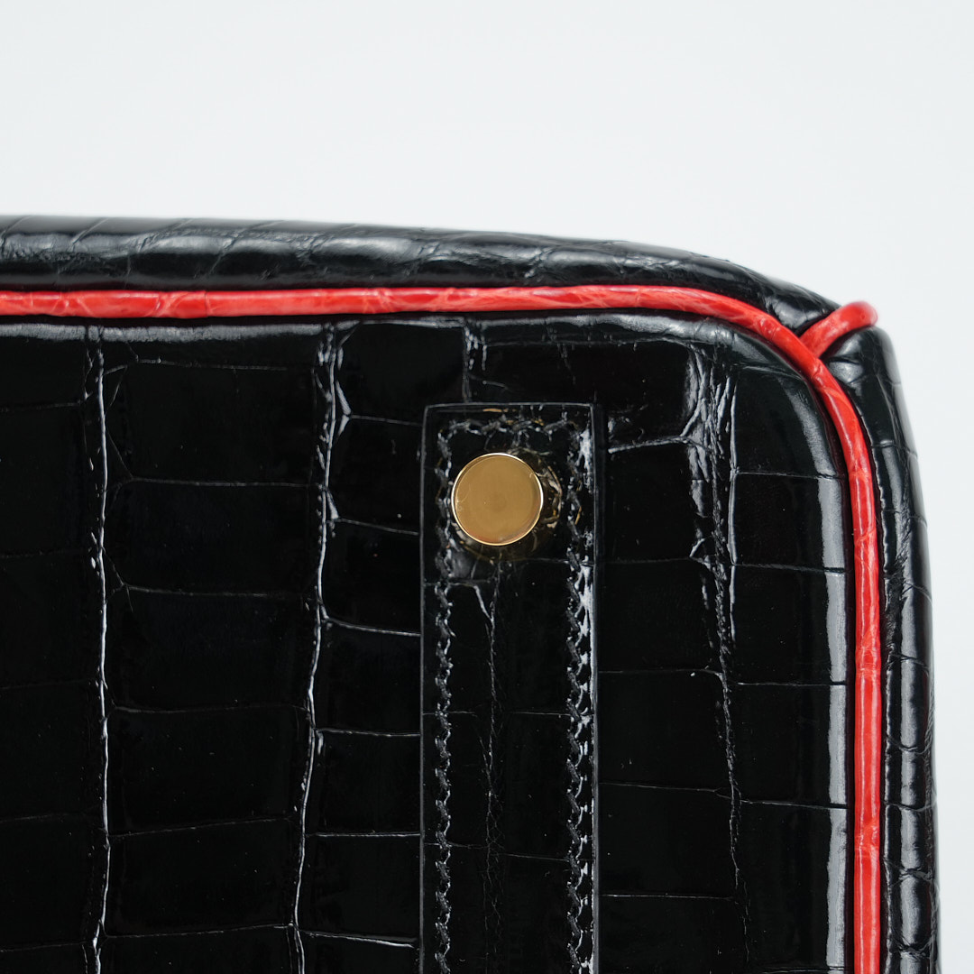 This BK 30 bag featured in the Black and Rouge Braise Shiny Niloticus Crocodile. It rare coveted beauty and a true collectors treasure. Fresh with gold hardware.