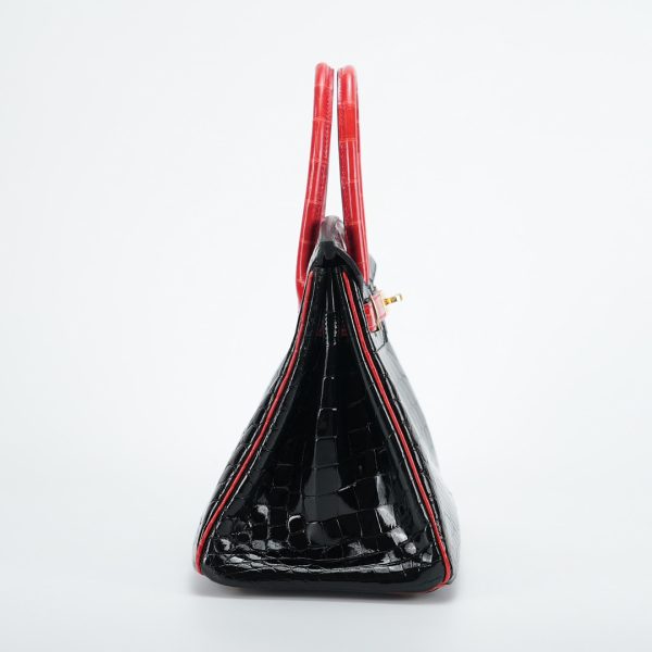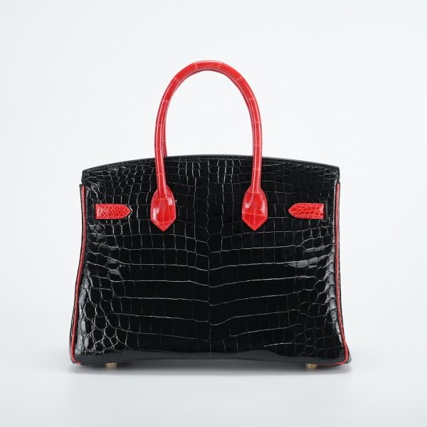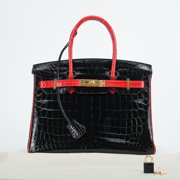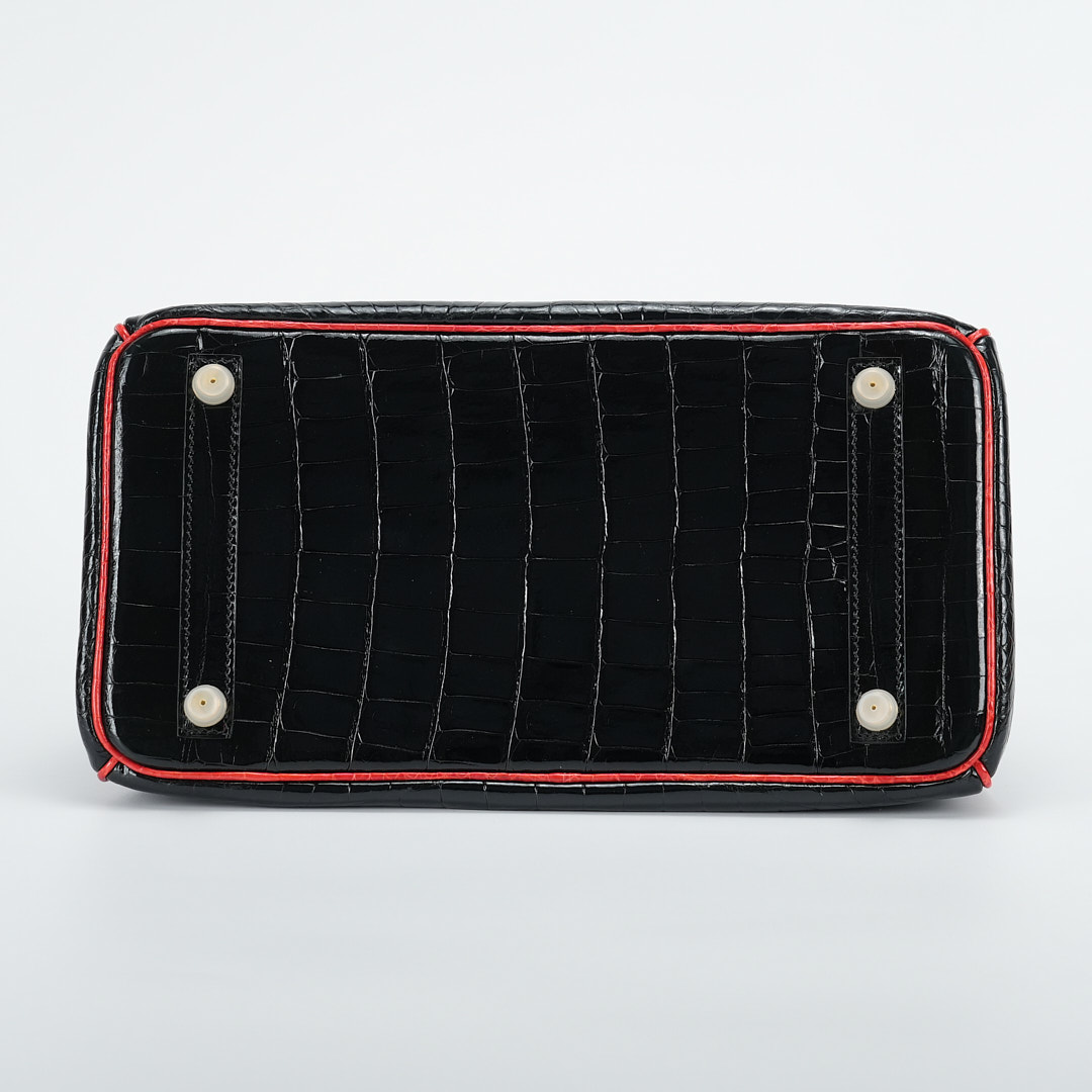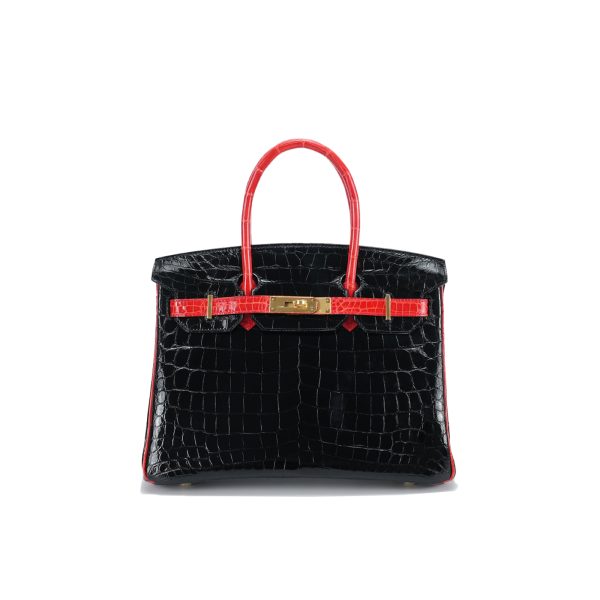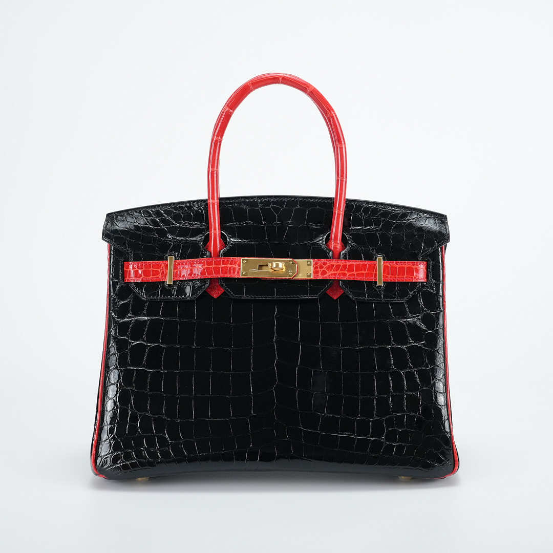 This BK 30 bag featured in the Black and Rouge Braise Shiny Niloticus Crocodile. It rare coveted beauty and a true collectors treasure. Fresh with gold hardware.