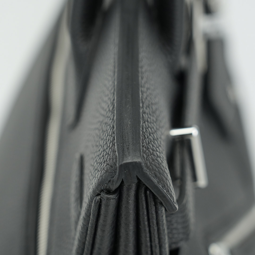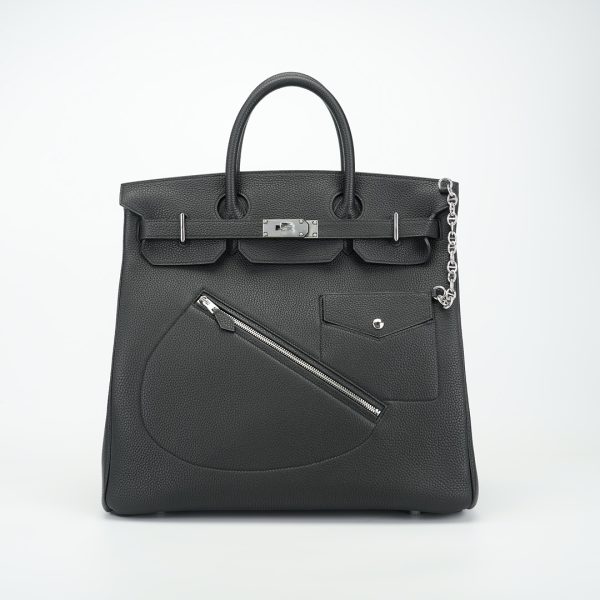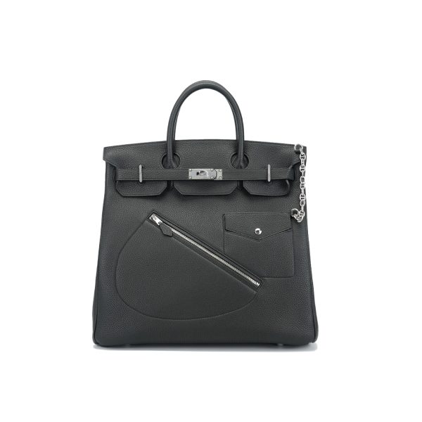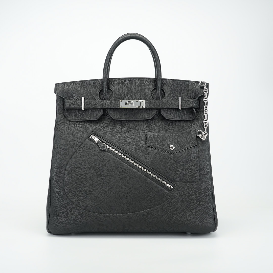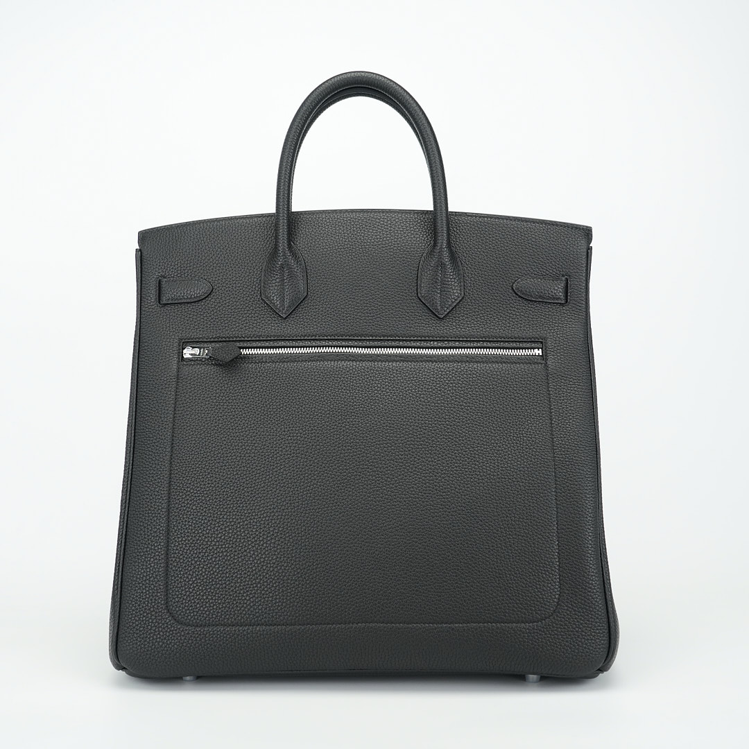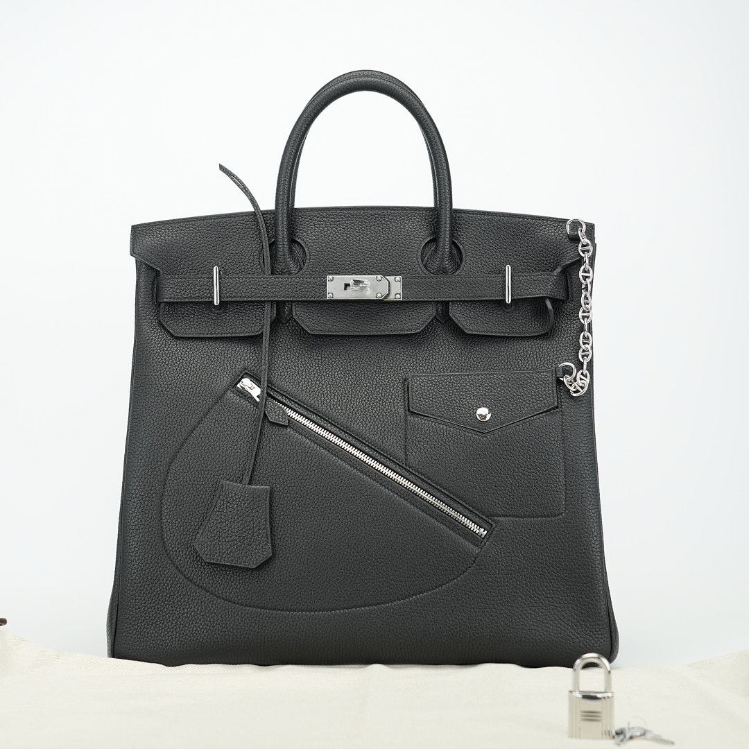 This is a Veau Volupto Rock HAC BK 40 in Black. This BK bag is crafted of Clemence black leather. The handbag features leather top handles, palladium silver hardware and front pockets. This opens to a matching leather interior with zipper and patch pockets.