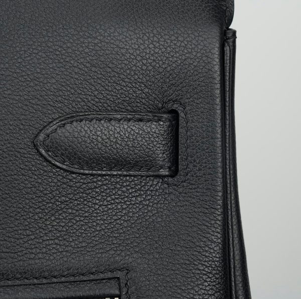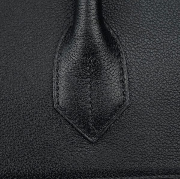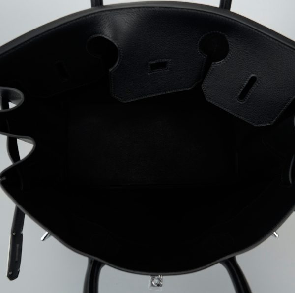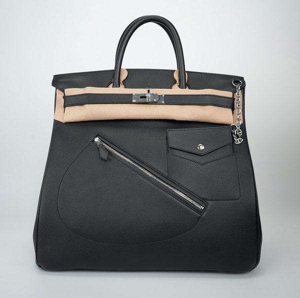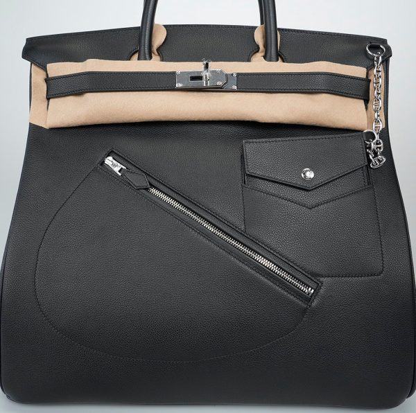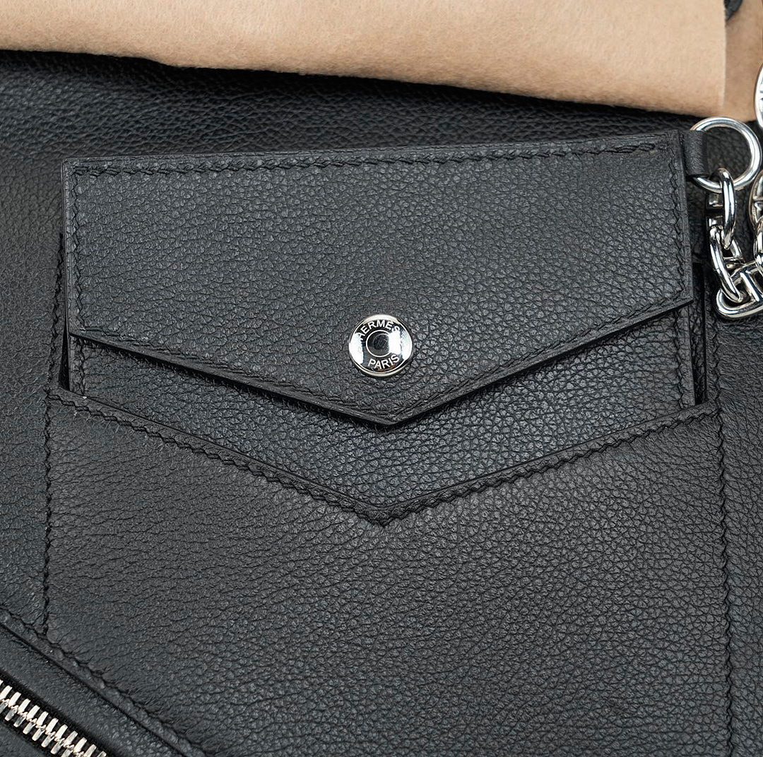 This is a Veau Volupto Rock HAC BK 40 in Black. This BK bag is crafted of smooth black leather. The handbag features leather top handles, palladium silver hardware and front pockets. This opens to a matching leather interior with zipper and patch pockets.