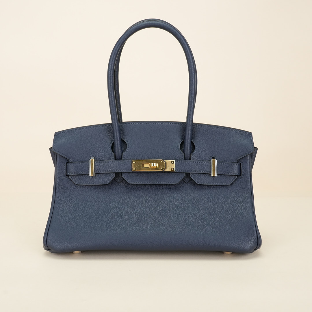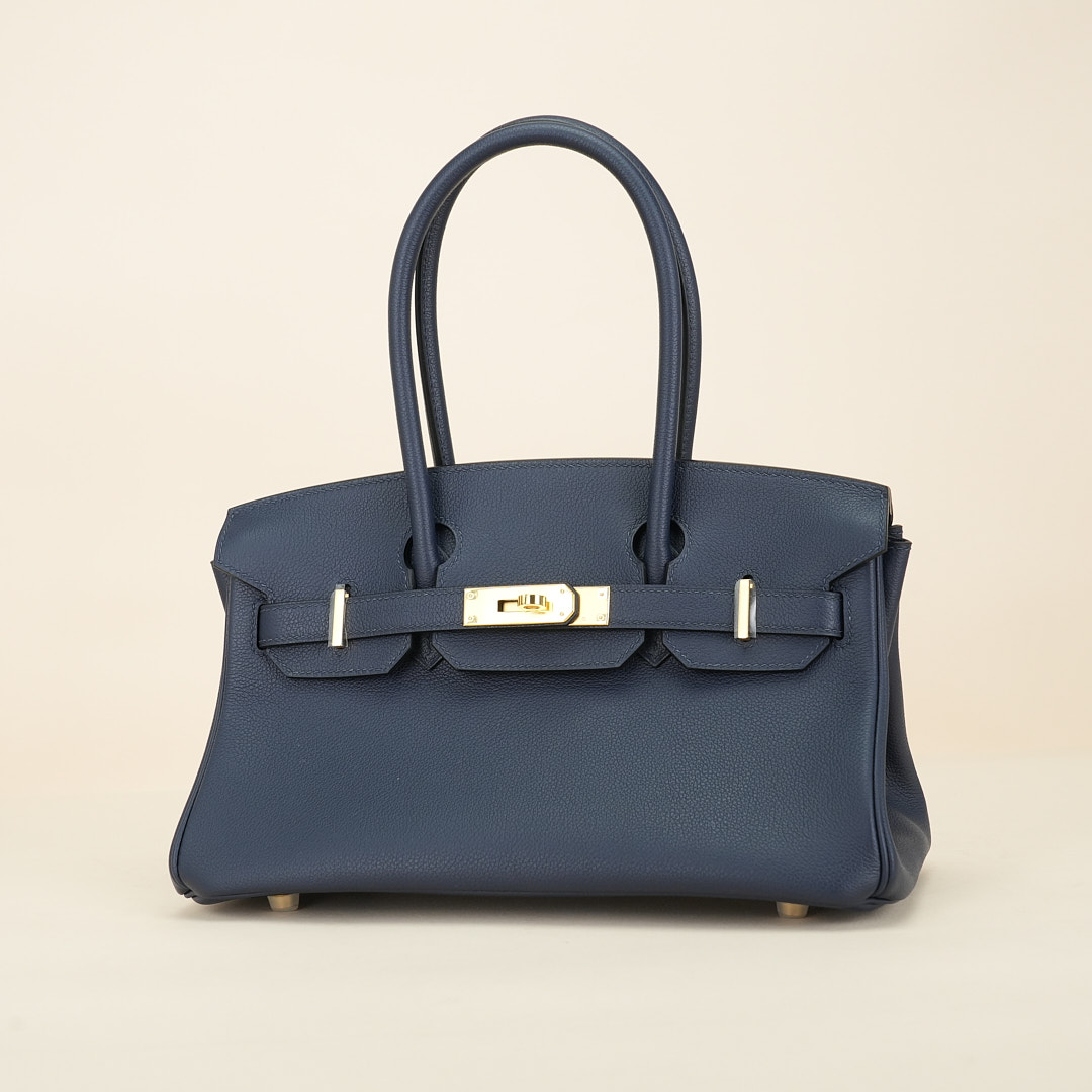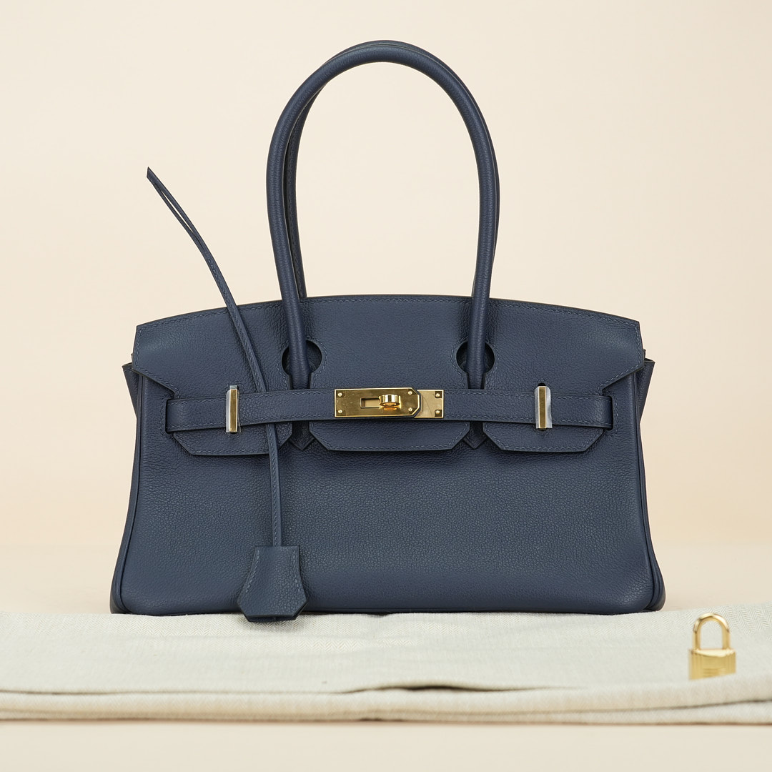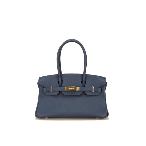 This Shoulder BK 29 is in Bleu Abysse evercolor leather with gold hardware and has tonal stitching, two straps with front toggle closure, clochette with lock and two keys and double rolled handles.