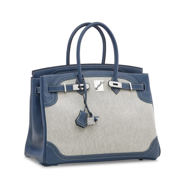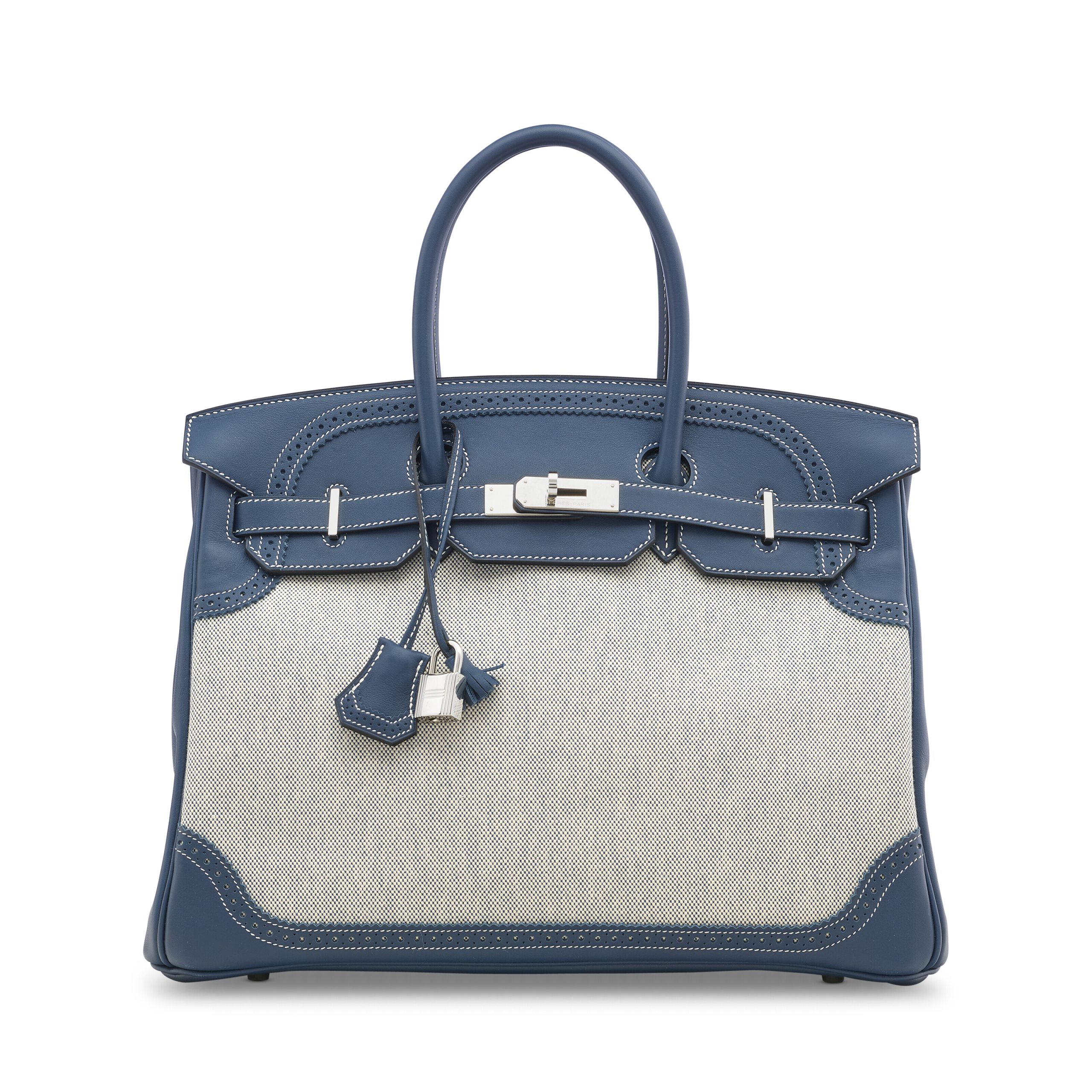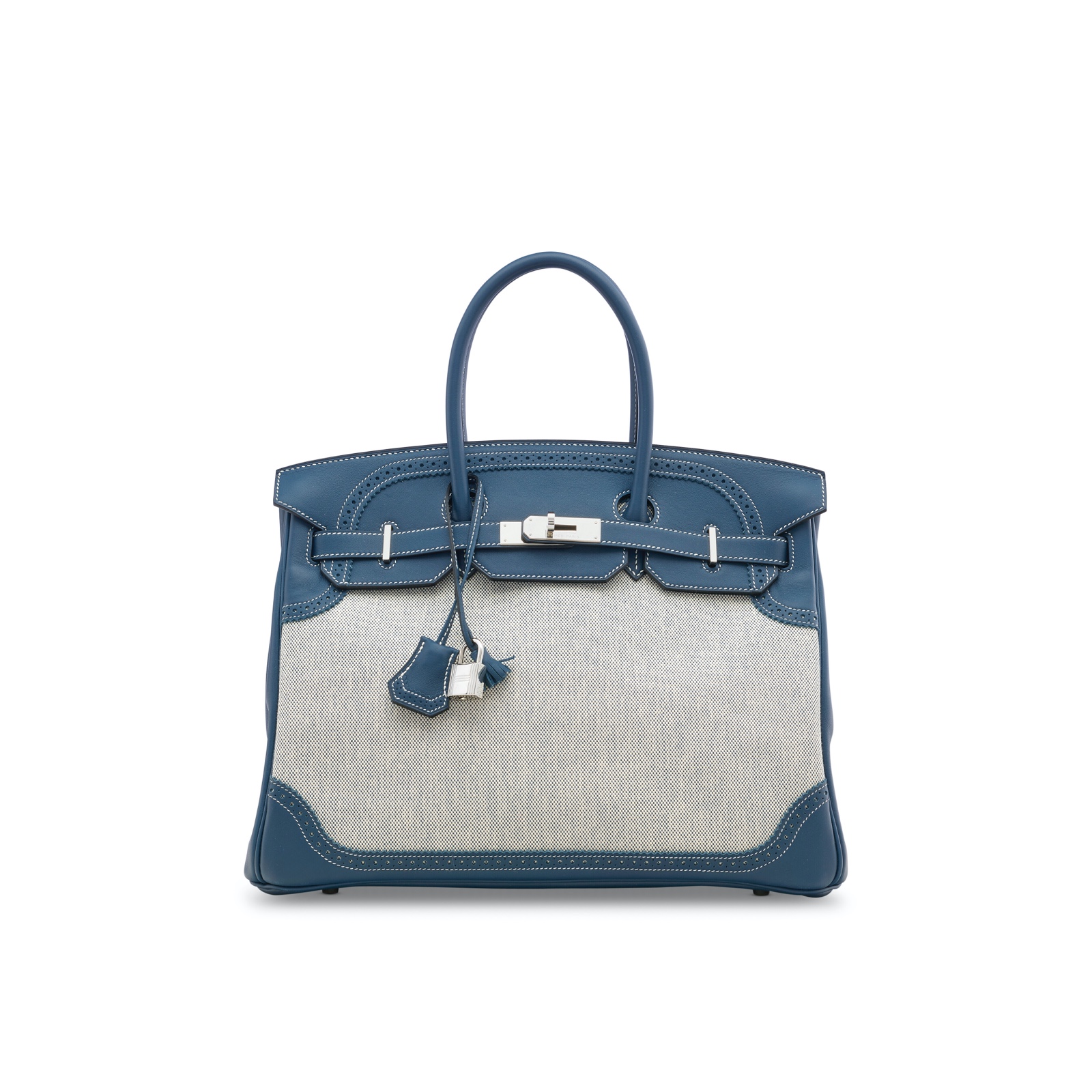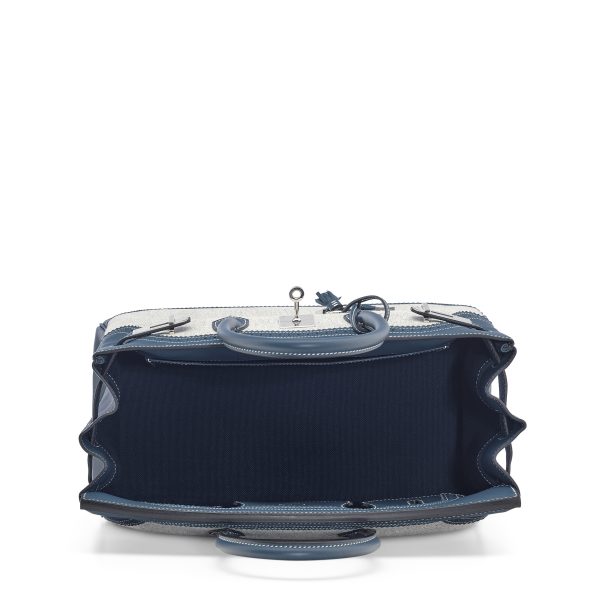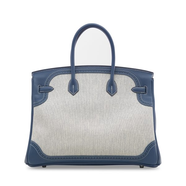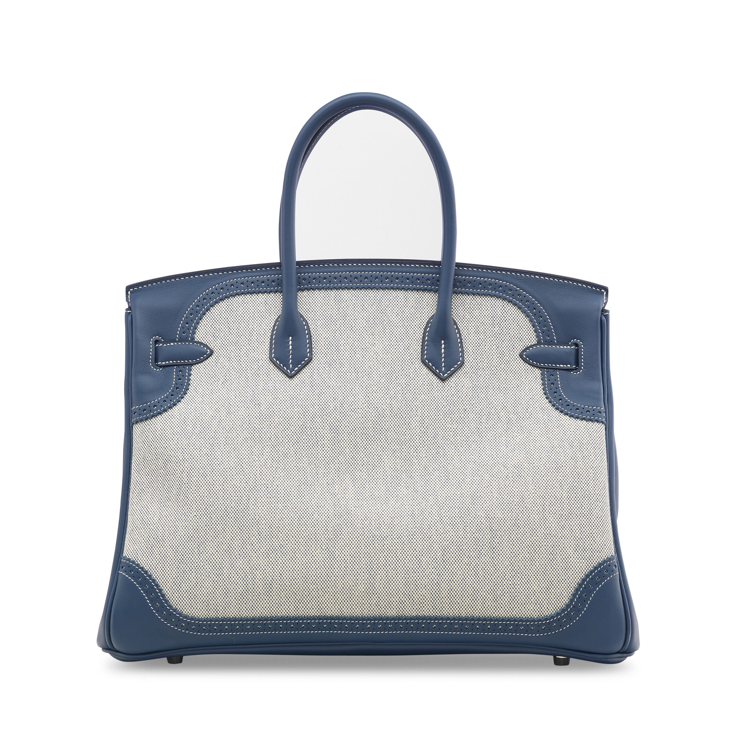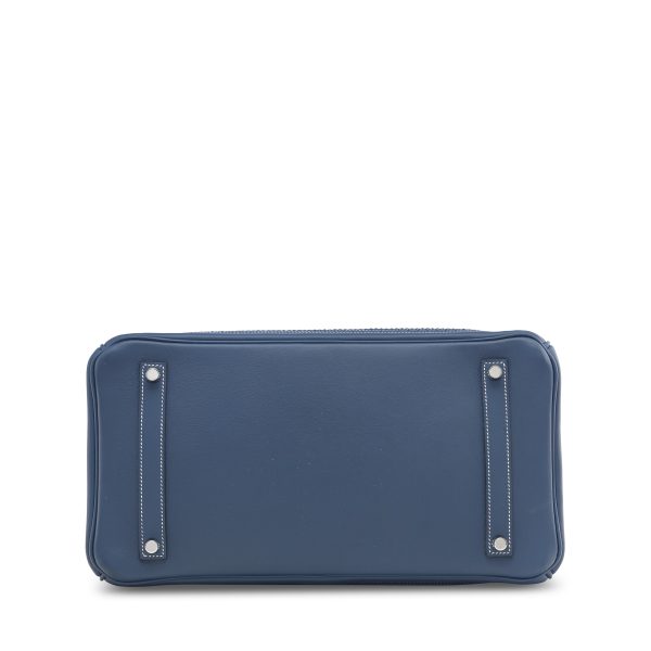 This BK is in Bleu De Prusse Swift and Toile H with palladium hardware and has contrast stitching, front flap, two straps with center toggle closure, clochette with lock and two keys, and double rolled handles.