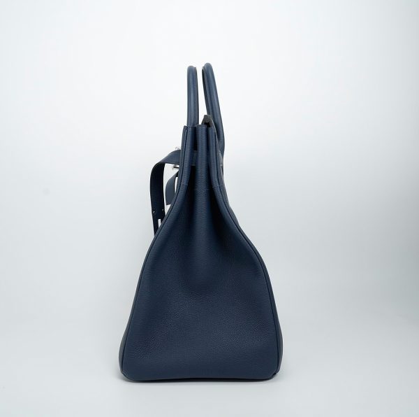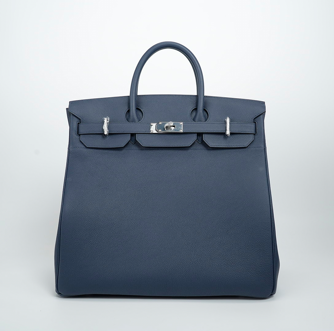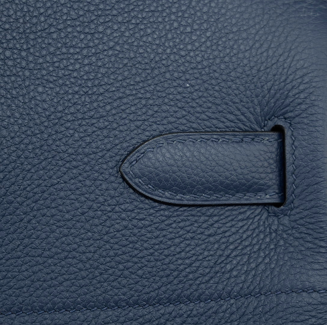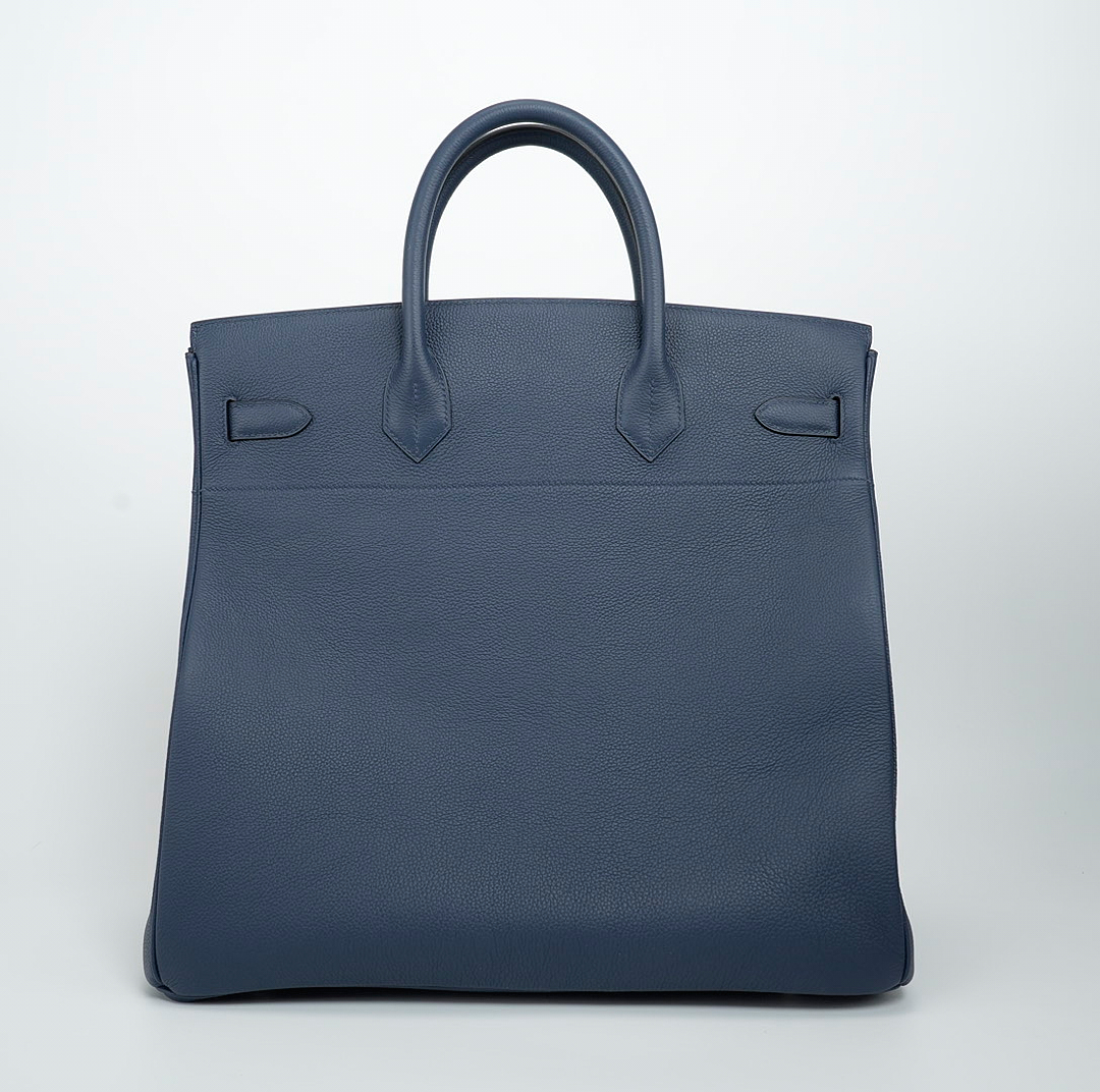 This is a Togo HAC BK 40 in Bleu Nuit. This spacious travel tote is crafted of fine togo leather in navy blue with expansive sides and a durable reinforced base. The bag features rolled leather top handles and a cross over flap with straps and a palladium plated turn lock closure. This opens to a matte chèvre goatskin leather interior.