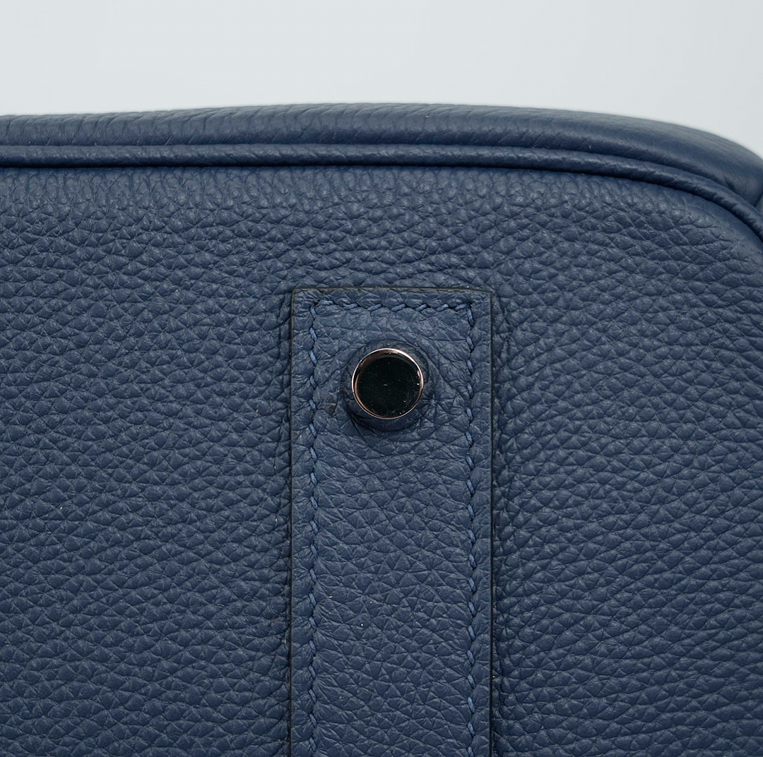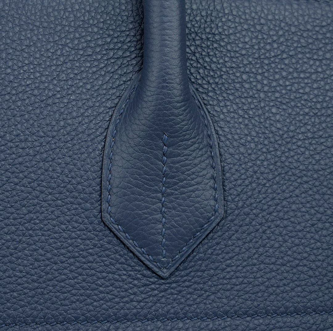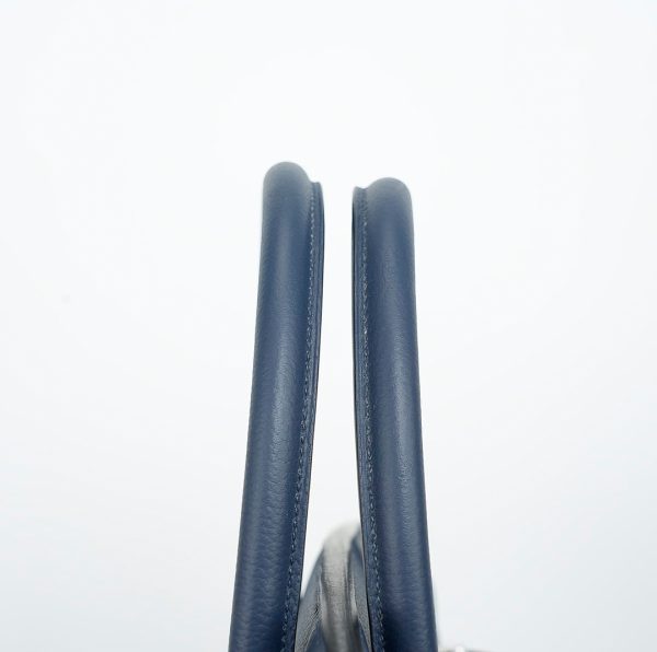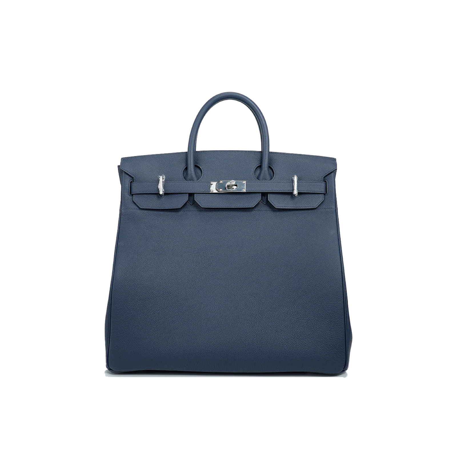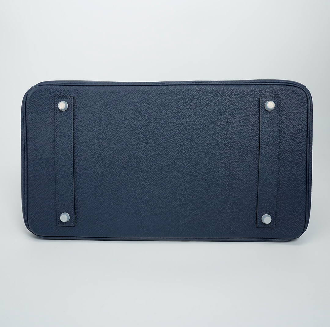 This is a Togo HAC BK 40 in Bleu Nuit. This spacious travel tote is crafted of fine togo leather in navy blue with expansive sides and a durable reinforced base. The bag features rolled leather top handles and a cross over flap with straps and a palladium plated turn lock closure. This opens to a matte chèvre goatskin leather interior.
